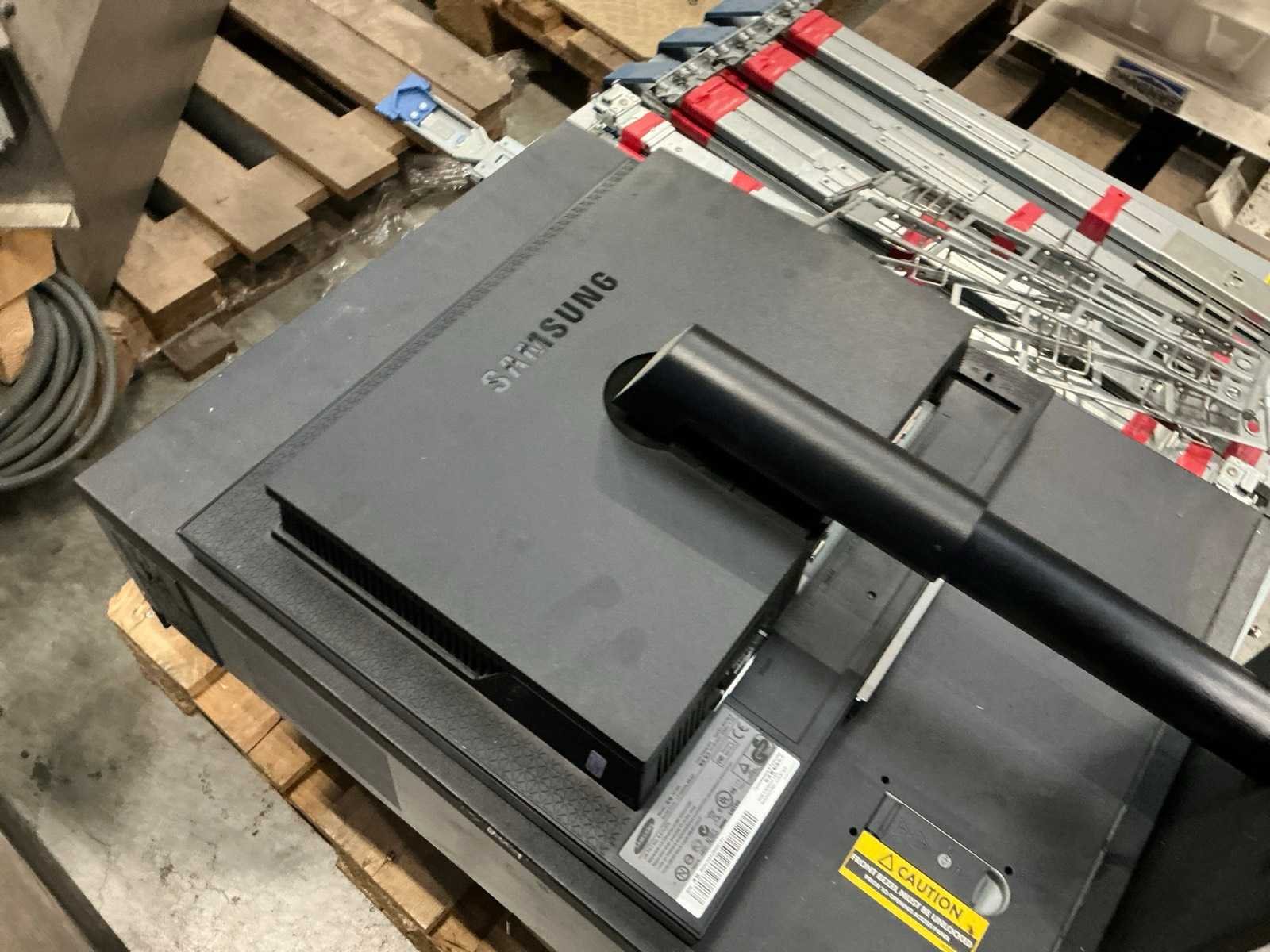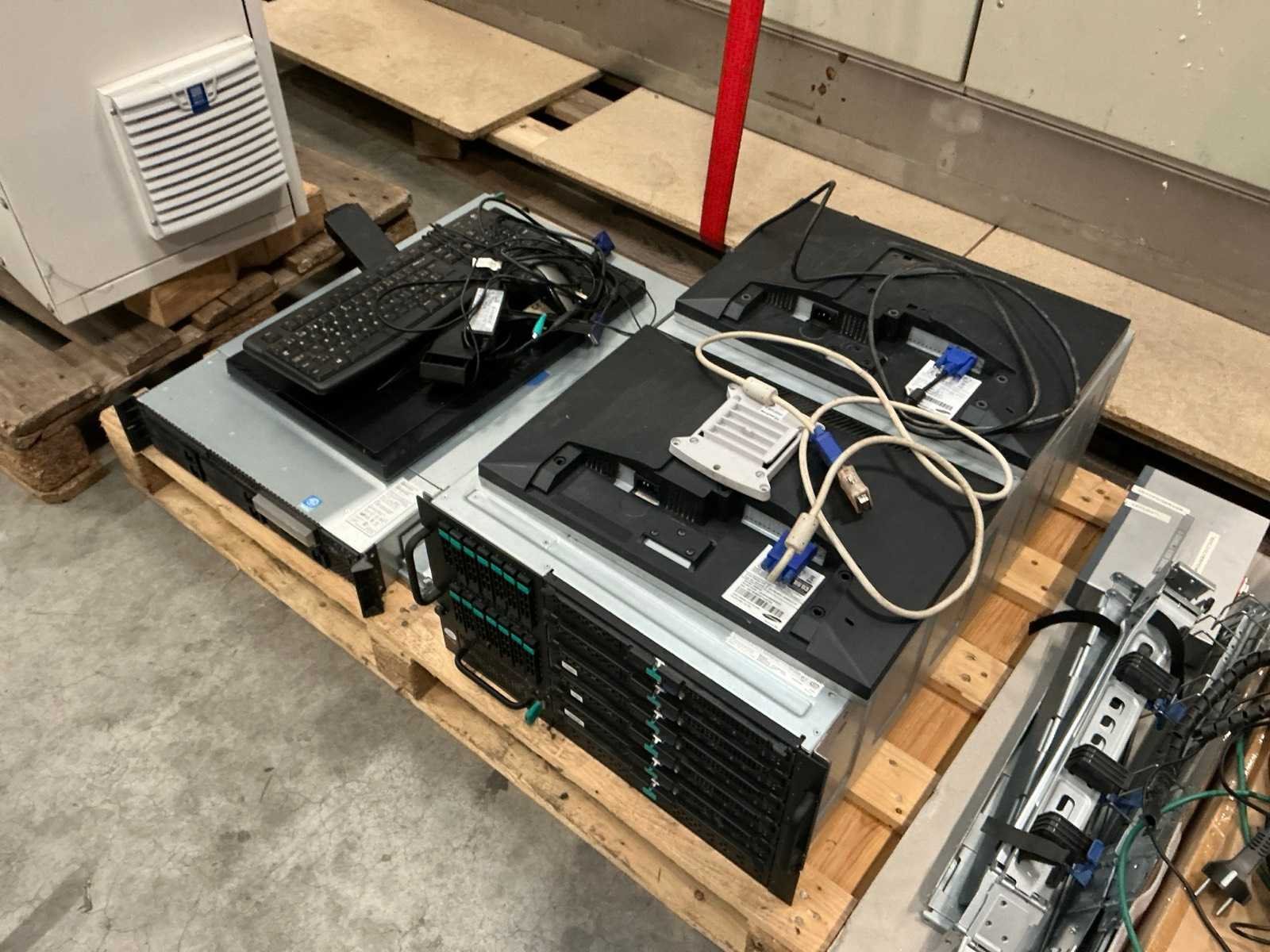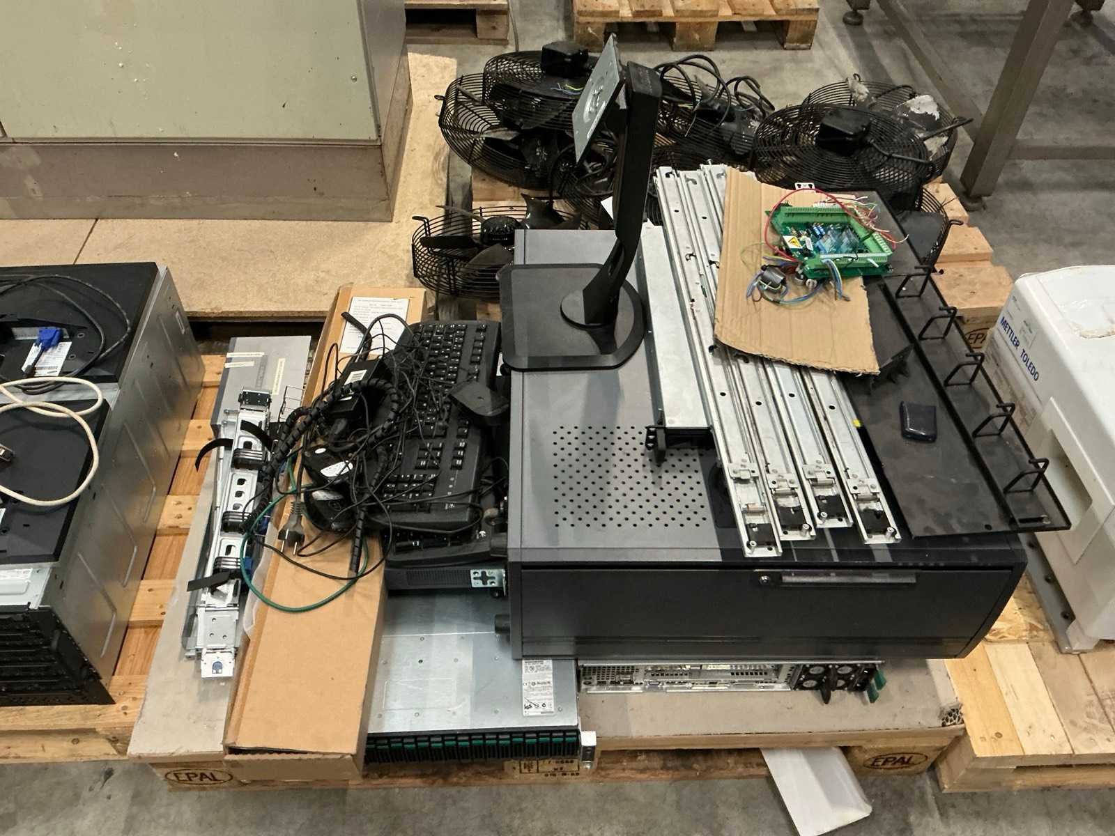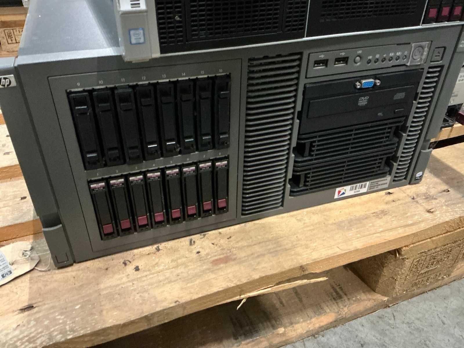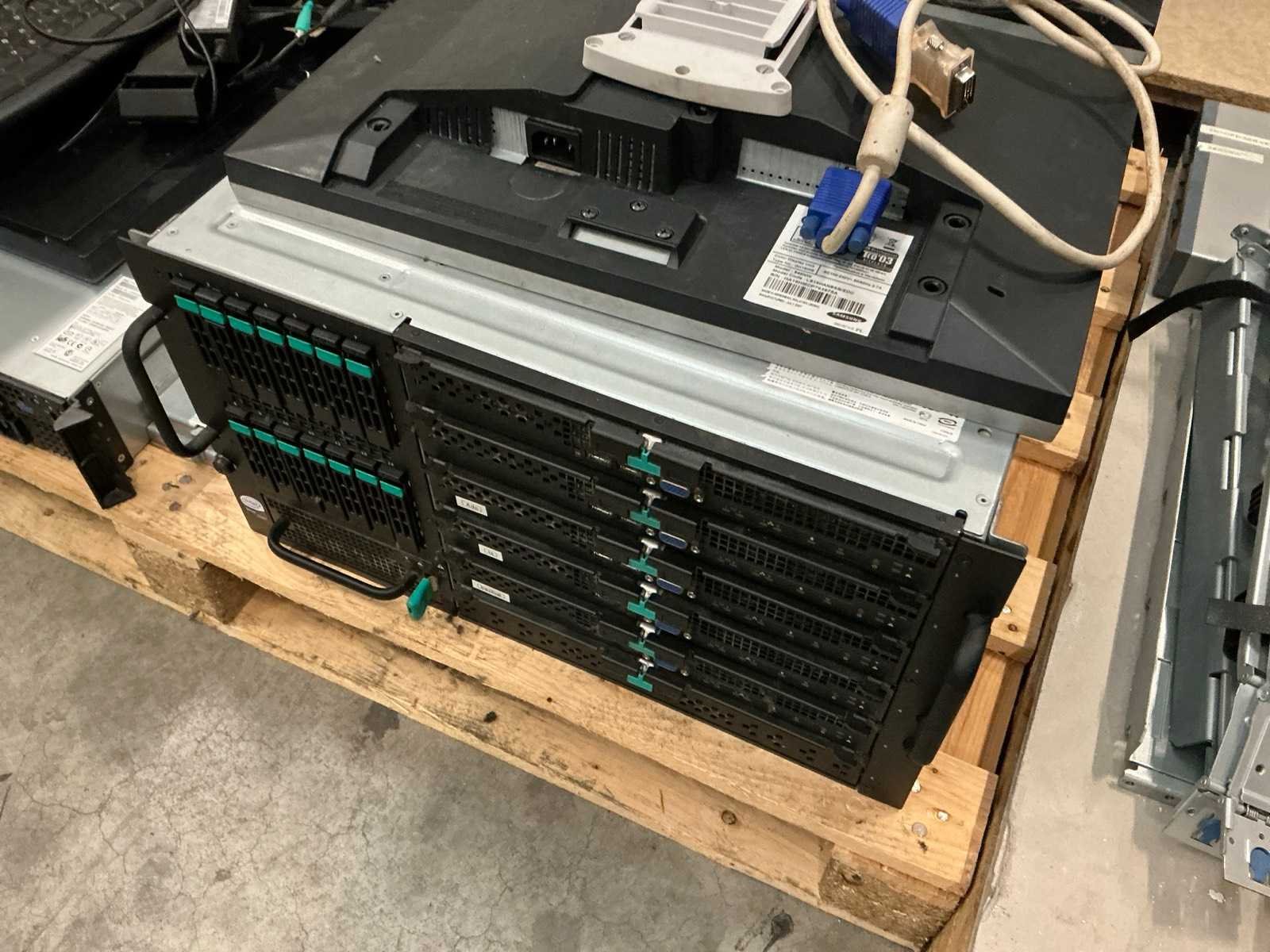 Liggende op 3x pallet waaronder 3x HP PROLIANT ML350 SAMSUNG, computercase, diverse monitors, switch D-Link,.. alle harde schijven verwijderd. Nee
