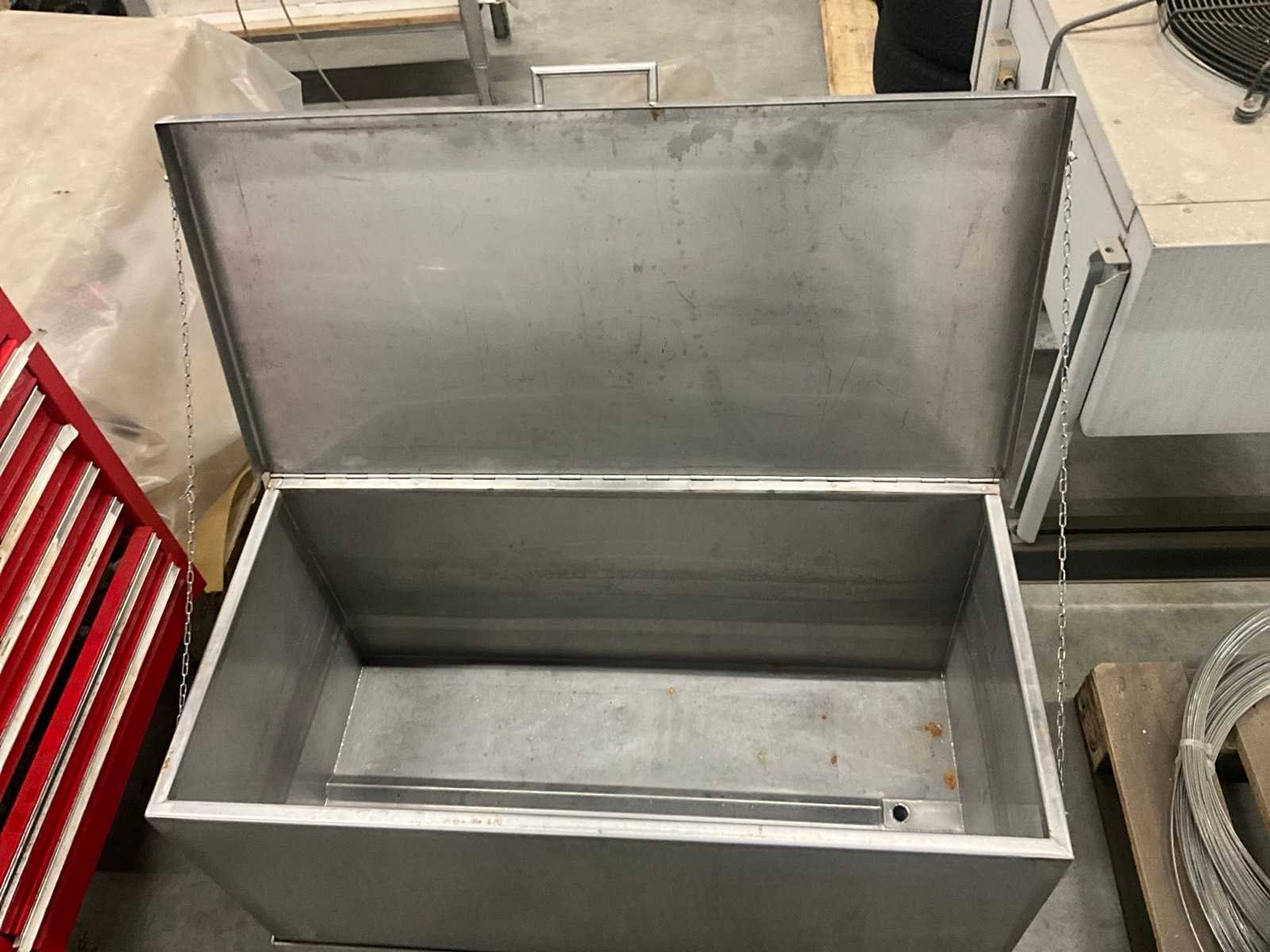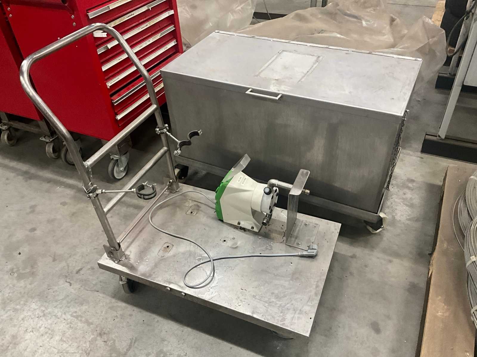 Bestaande uit rvs opslagkist 100 x 50 x 63cm op verrijdbaar onderstel, compleet met rvs Plateauwagen voorzien van doseermpomp Emec Prisma Nee
