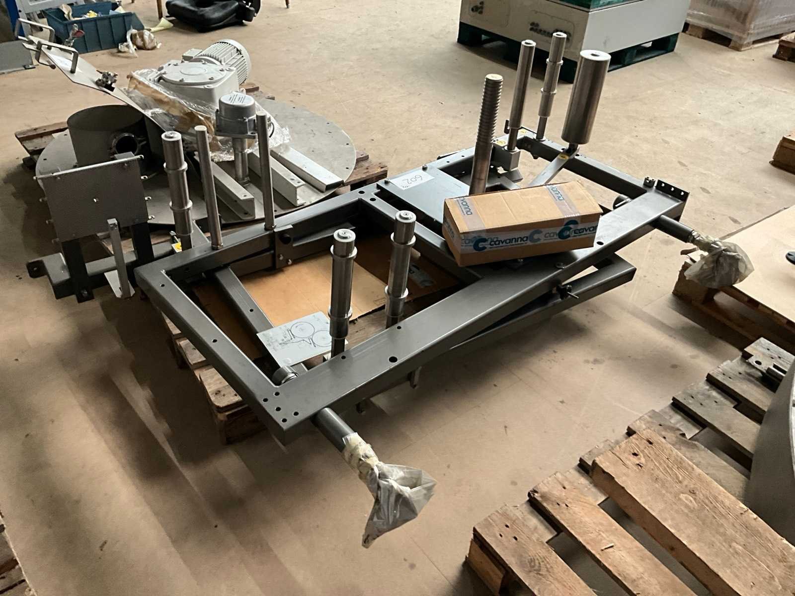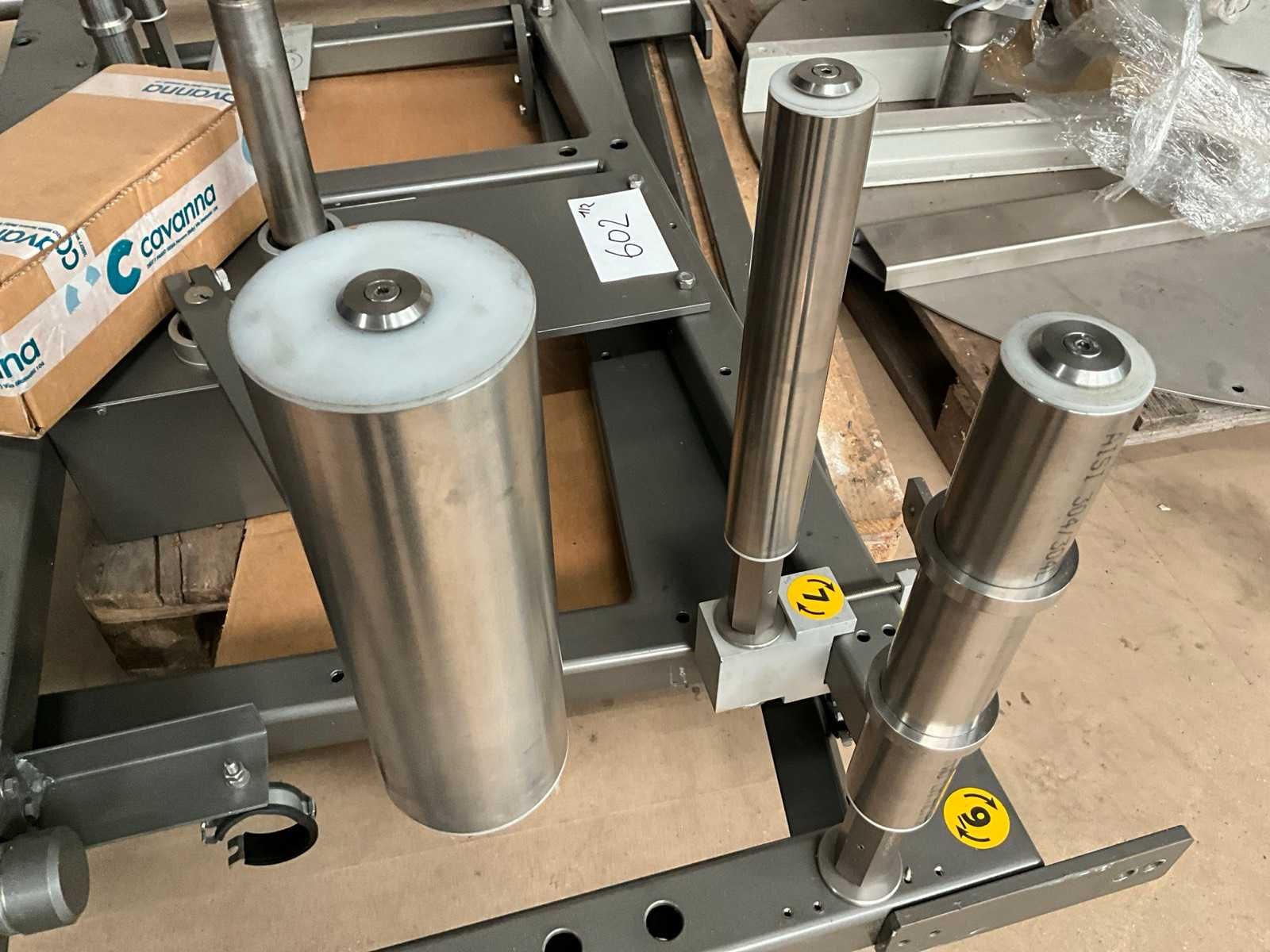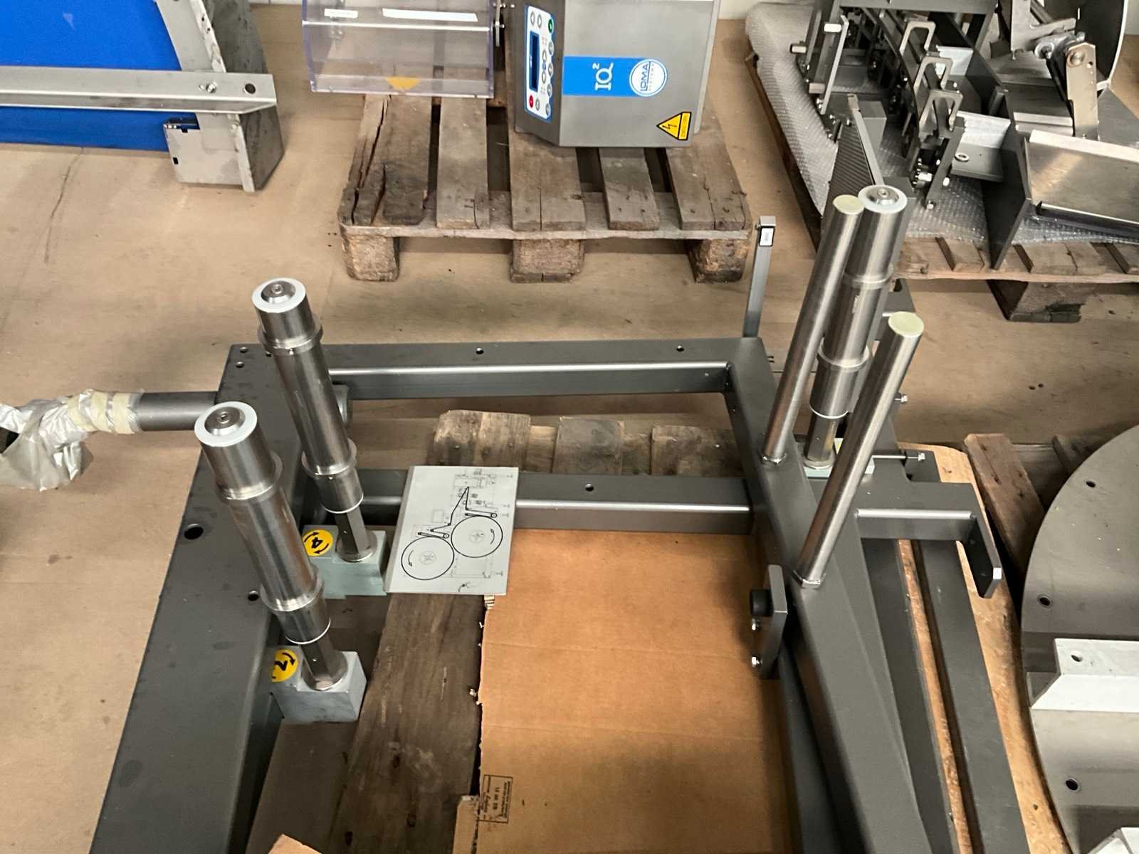 Waaronder 3x metalen frame voorzien van diverse rollen met AFM circa 170 x 105cm, compleet met metalen onderstel transportband voorzien van tandwielen en sturingskast. Liggende op 2 pallets. Nee