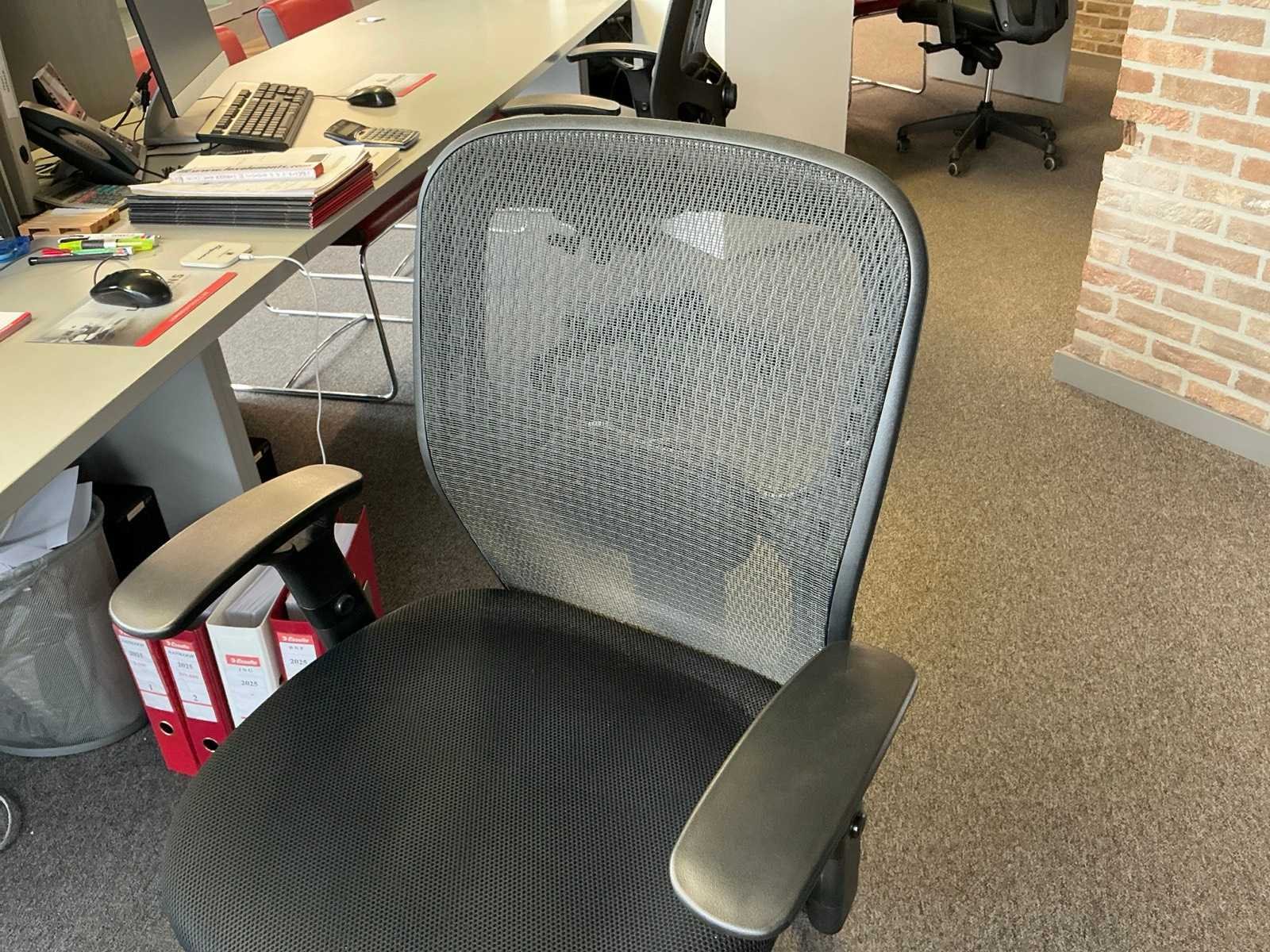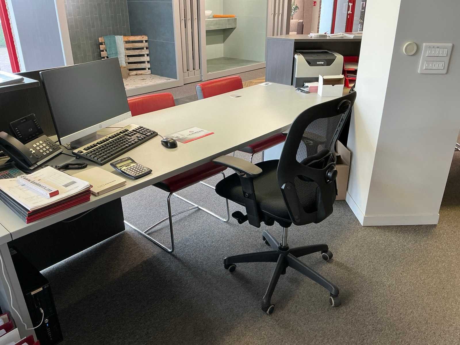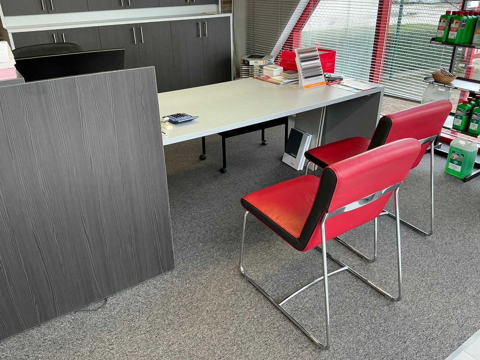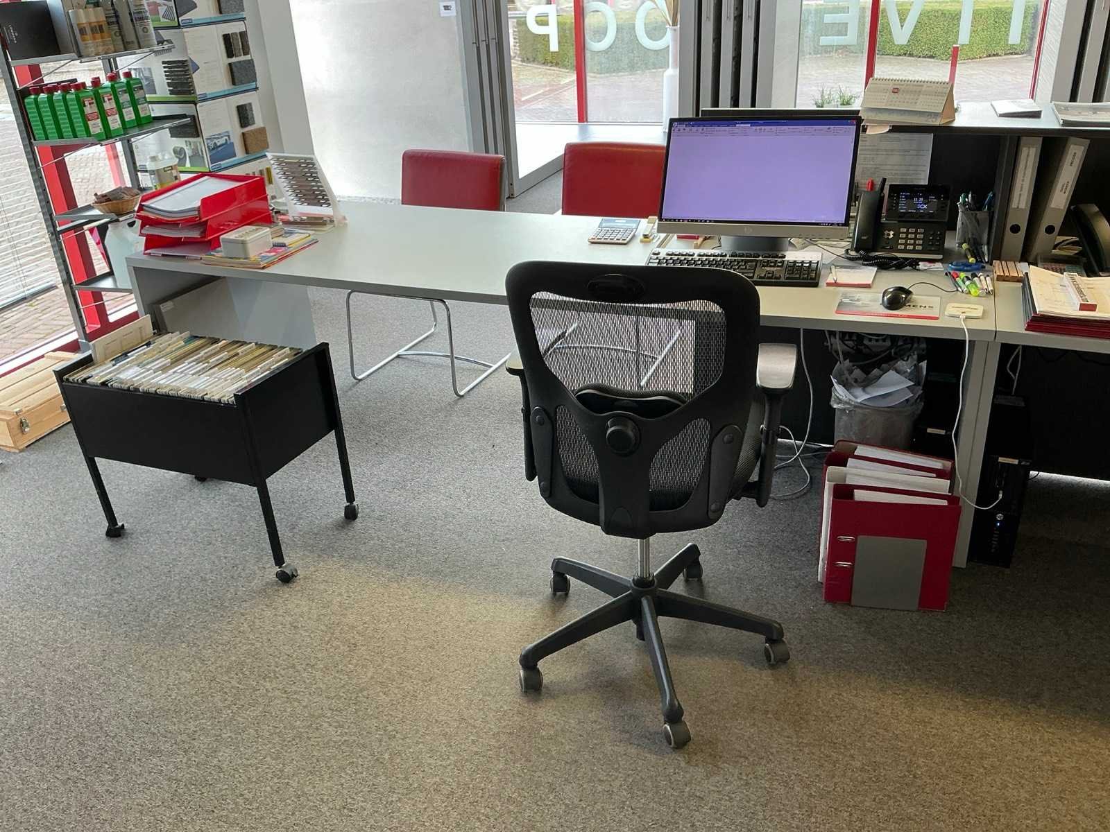 Compleet met 6x bijzetstoel Leolux voorzien van lederen zitting en metalen onderstel, 3x typistestoel en 2x wandkast elk voorzien van 6x kastdeuren waaronder 1x met afmetingen ca. 250 x 40 x 130cm en 1x met afmetingen ca. 250 x 65 x 100cm. ZONDER SCHERMEN EN TOEBEHOREN. Nee Lengte: 700cm Breedte: 250cm Hoogte: 110cm