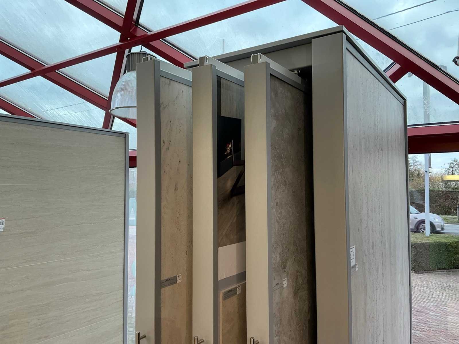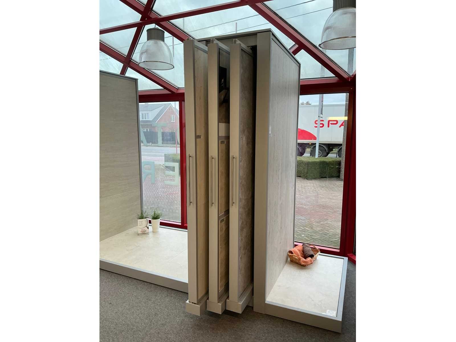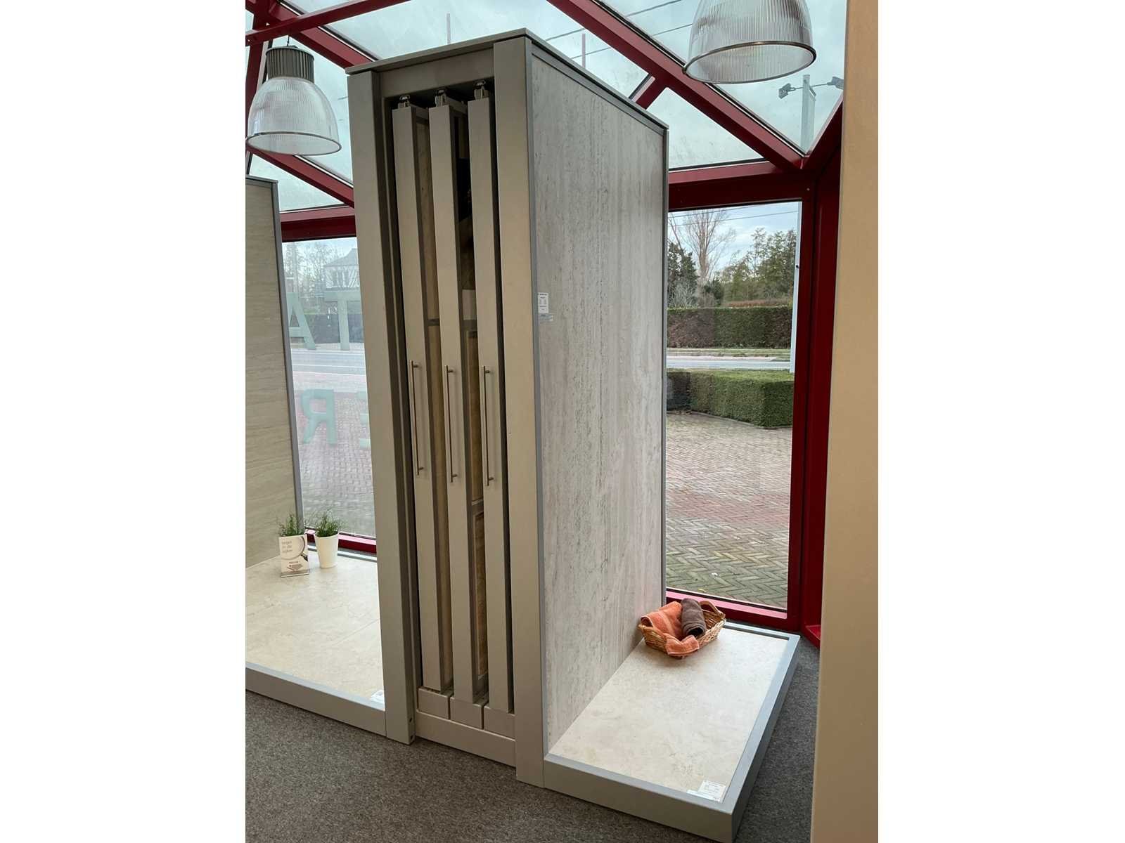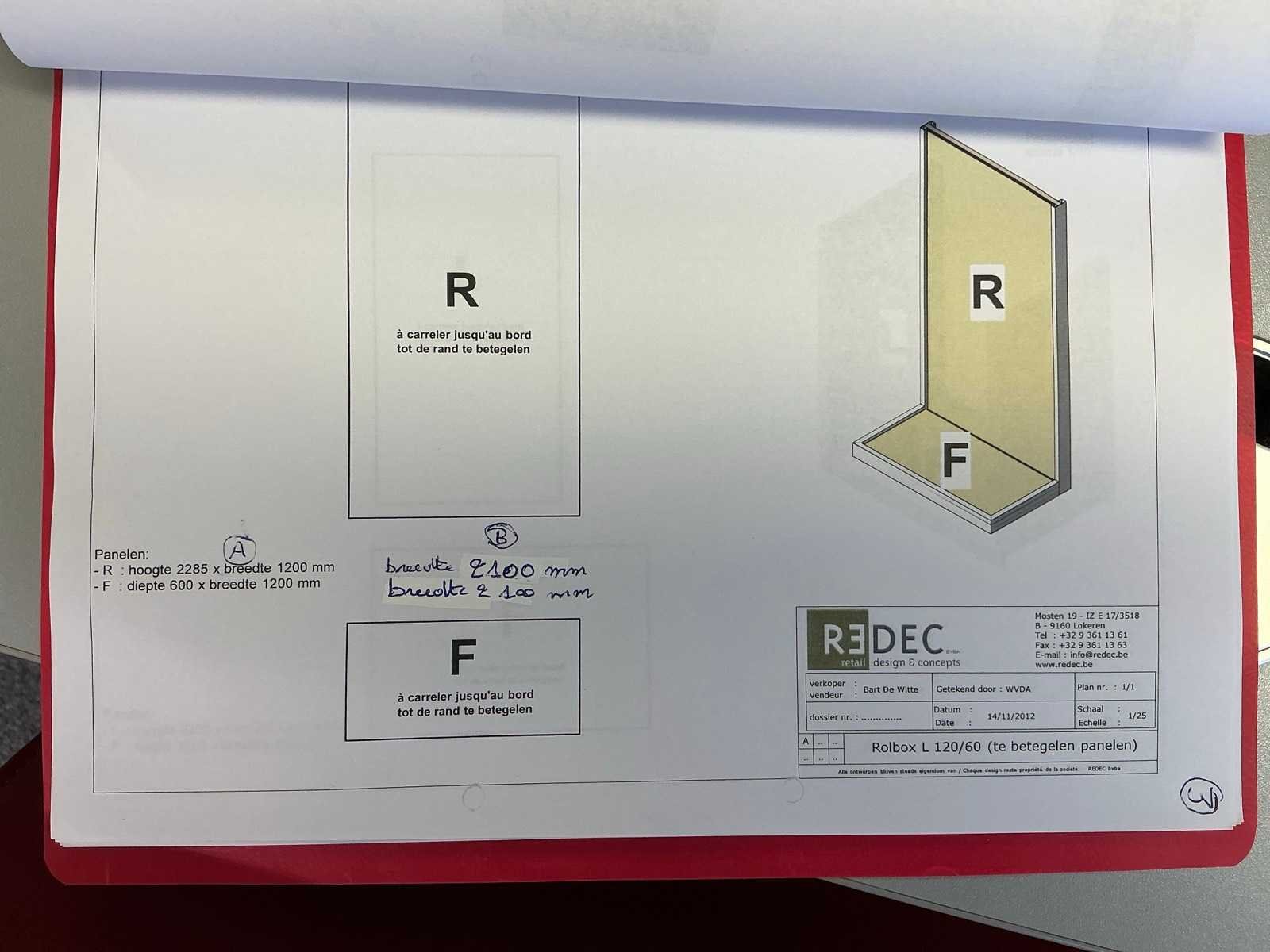 Bestaande uit REDEC Zeta 3 (3x), elk met afmetingen ca. 130 x 70 x 240cm + REDEC Rolbox L 120/60 (2x) met afmetingen ca. 130 x 75 x 240cm + REDEC Rolbox U 180/120 met afmetingen ca. 130 x 200 x 240cm + cornerbox met afmetingen ca. 220 x 220 x 240cm. Door koper te demonteren van omgeving. Alle aangekleefde tegels MOETEN meegenomen worden door koper. Nee Merk: REDEC