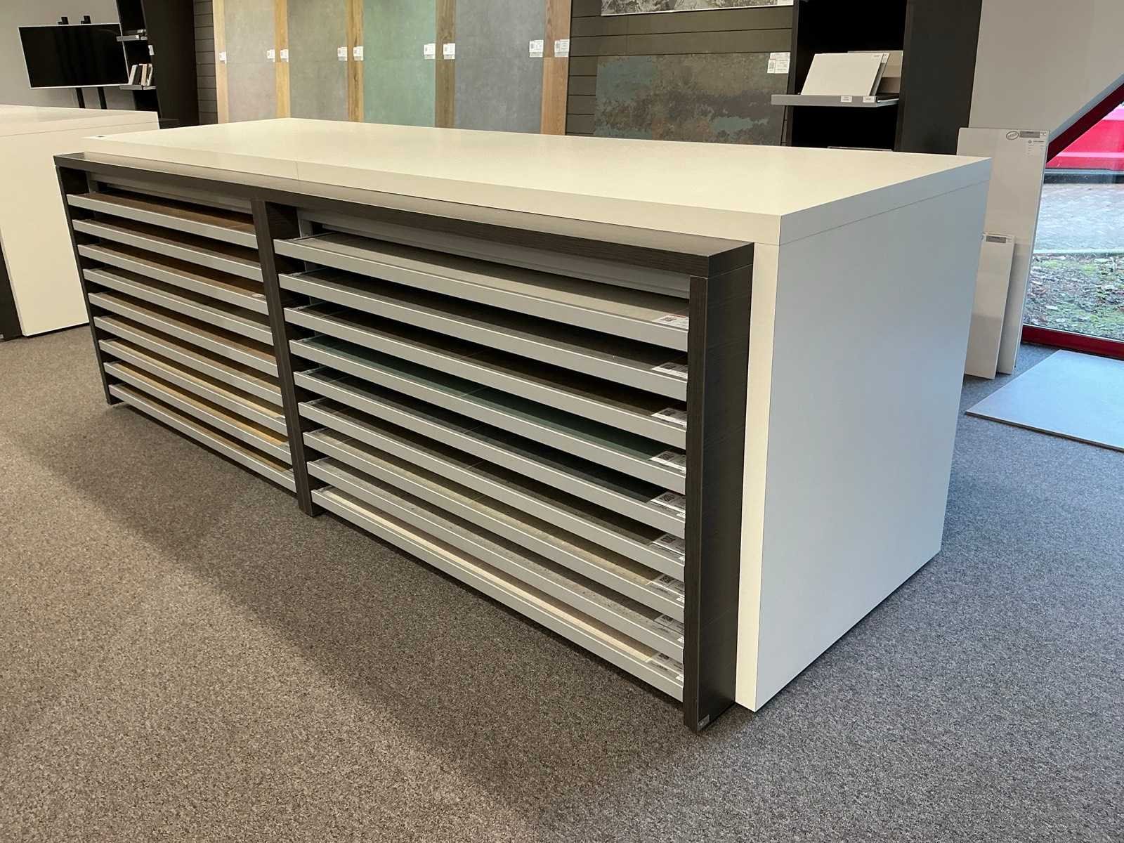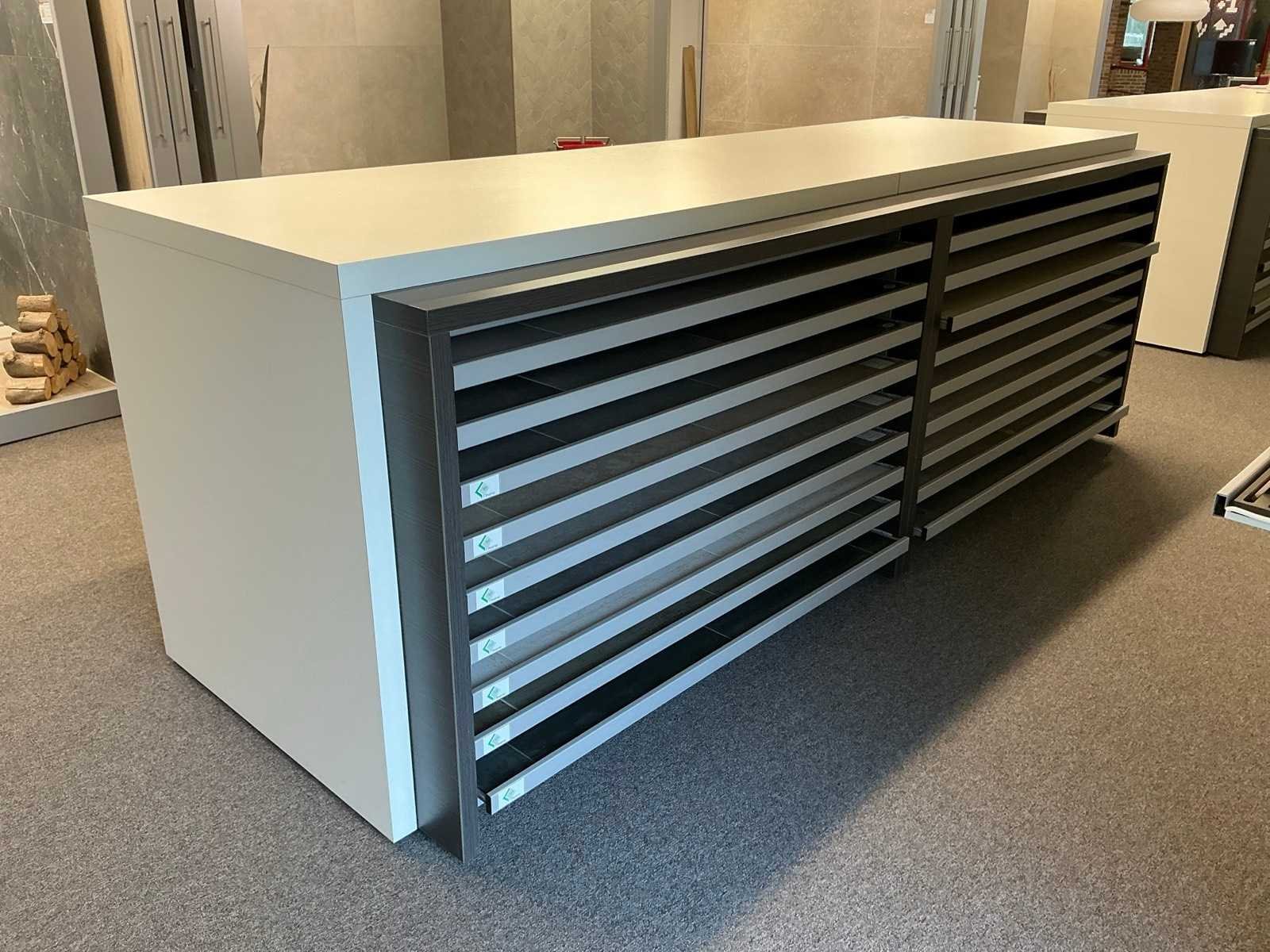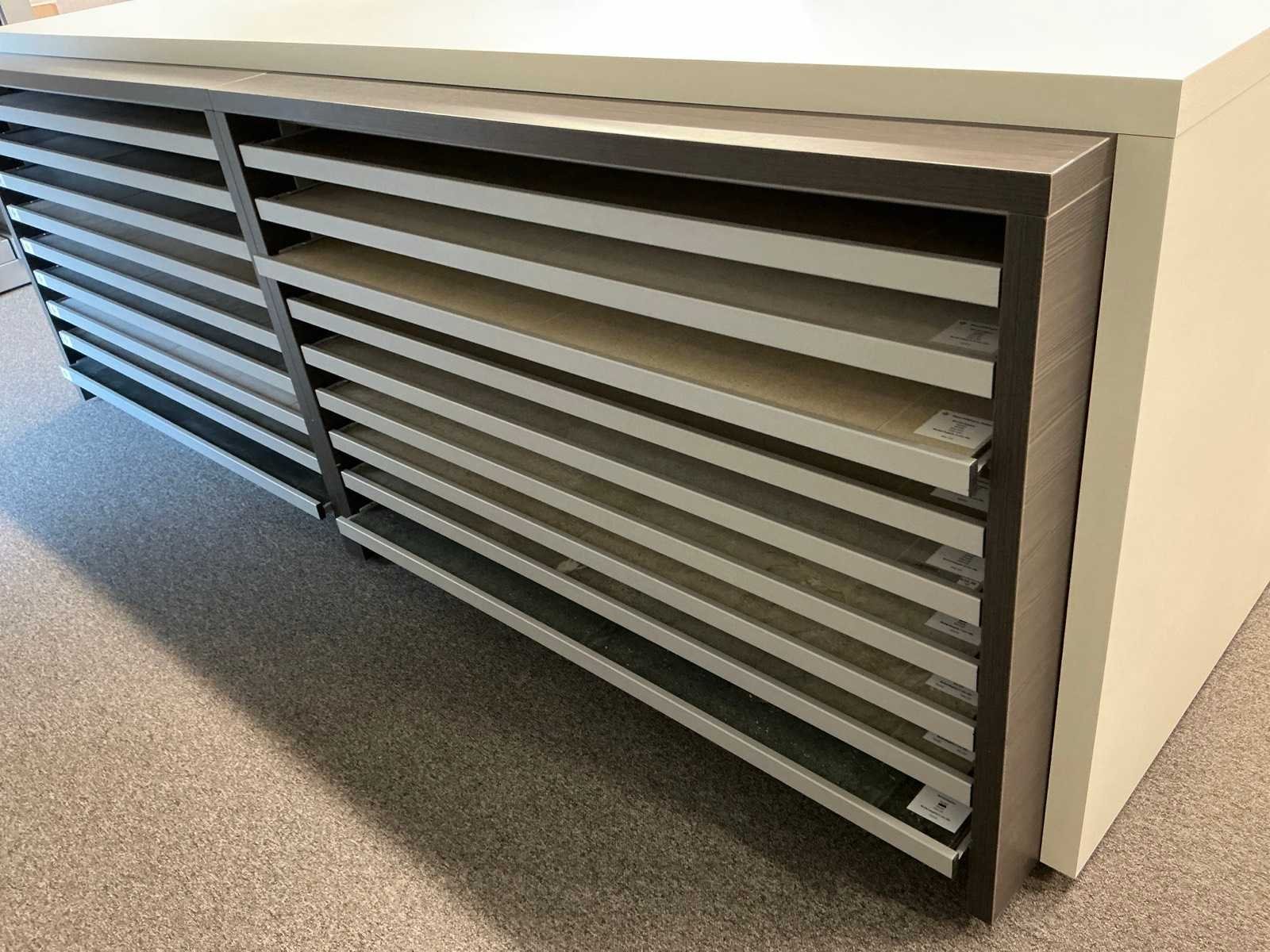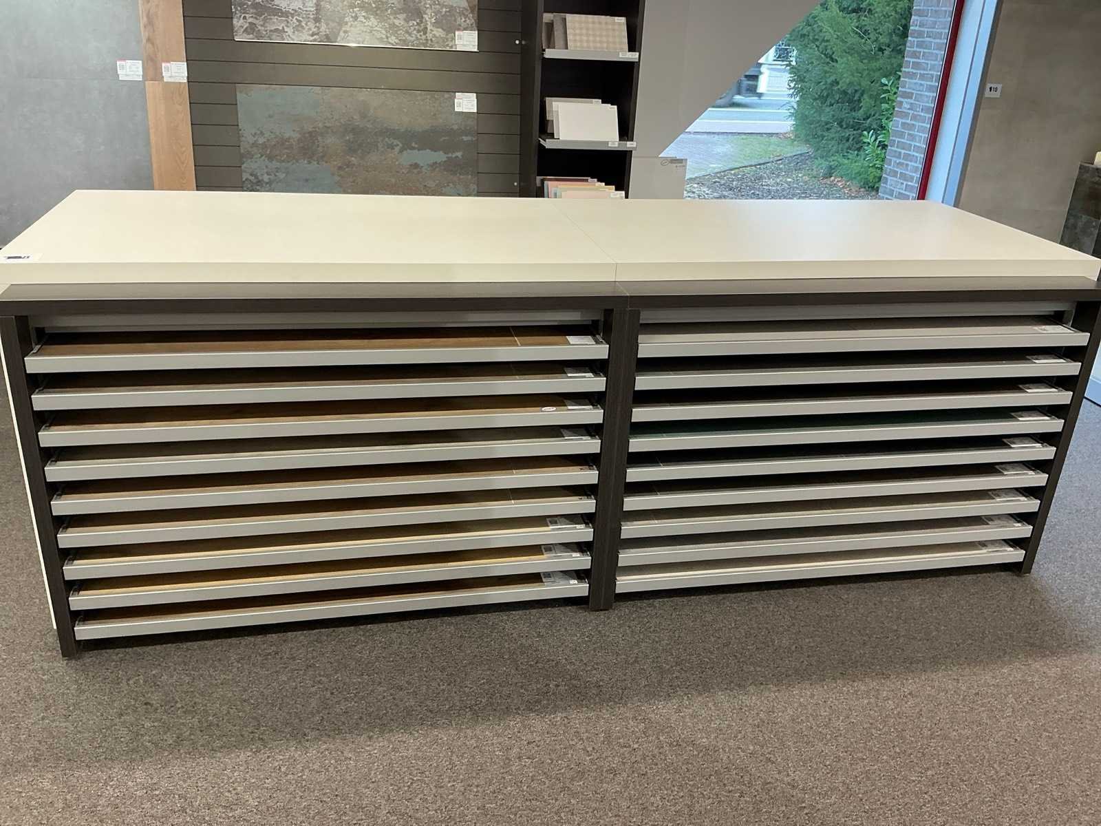 Bestaande uit 1x decorblok (320 MEL) en 2x REDEC Delta 18-142 R, elk voorzien van 18x schuifplateau. Te demonteren/verplaatsen van meubel door koper. Alle aangeplakte tegels en toebehoren MOETEN worden meegenomen door koper. Nee Merk: REDEC