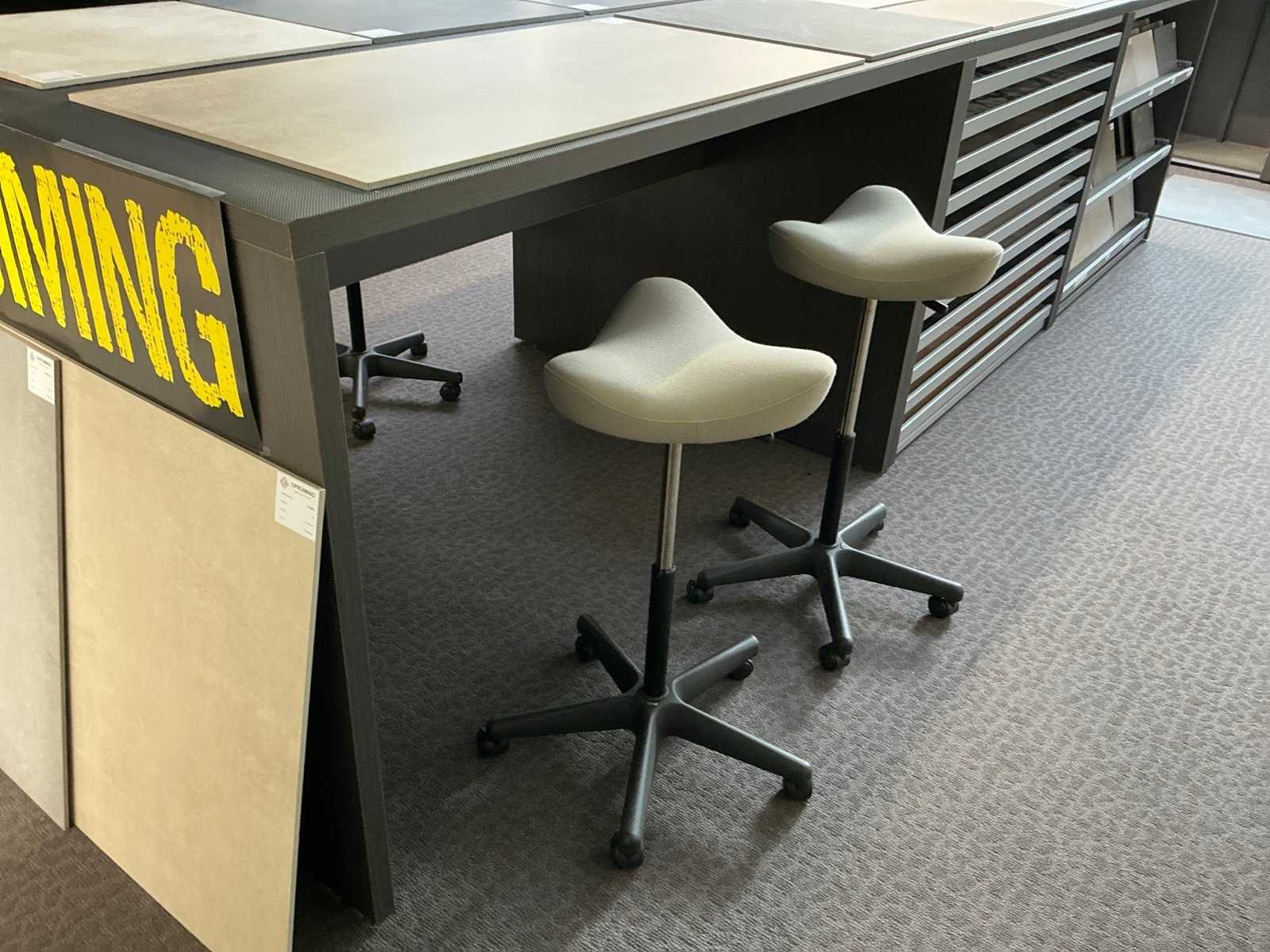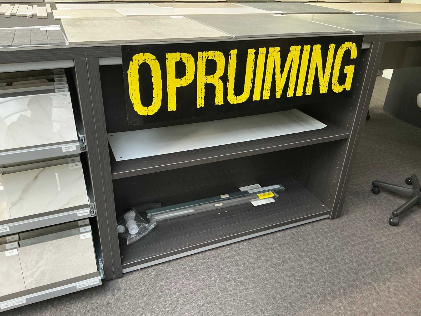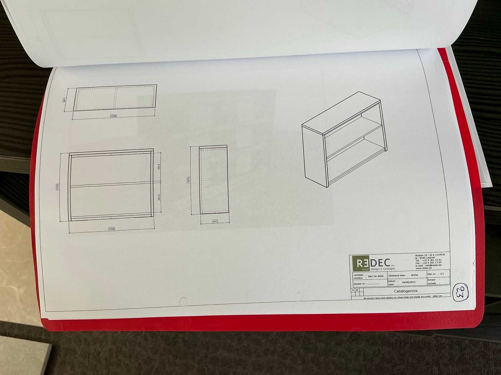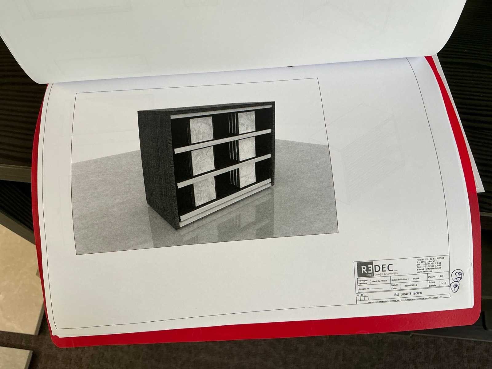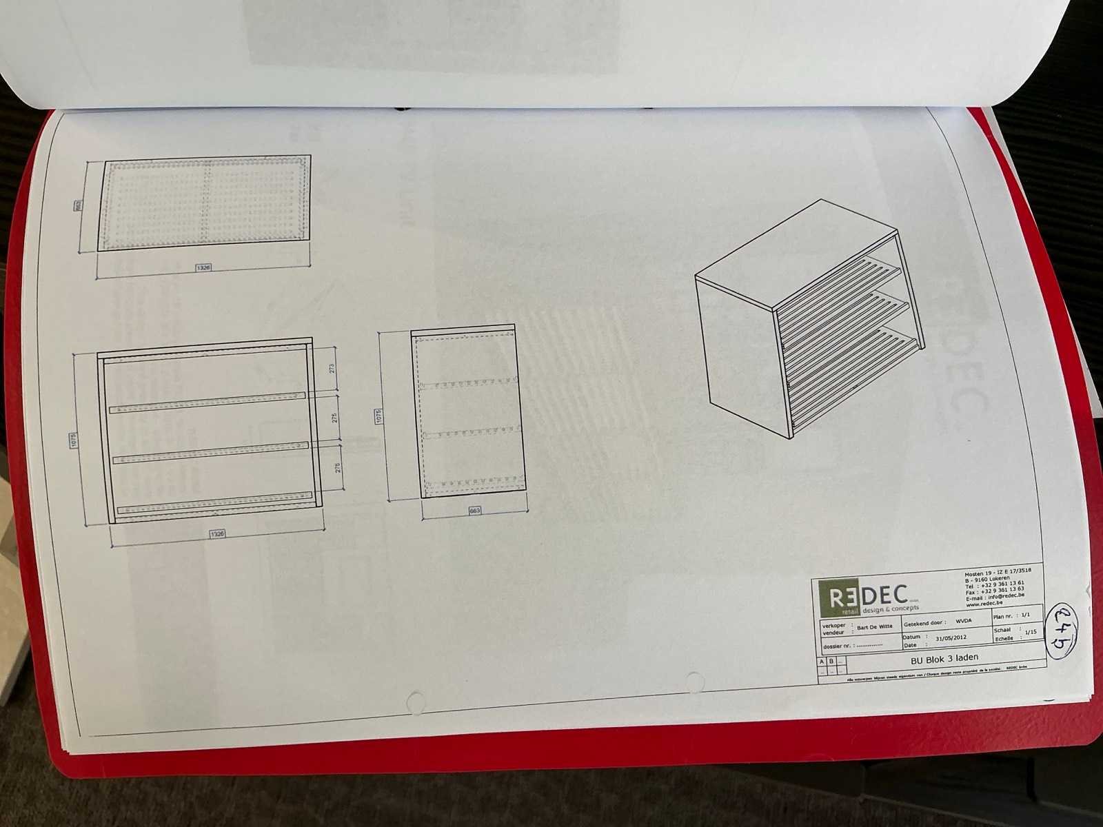 Bestaande uit tafel, voorzien van 4x krukken, met afmetingen ca. 180 x 132 x 110cm, 2x REDEC BU Blok 3 laden, met afmetingen ca. 133 x 66 x 110cm, 1x REDEC Catalogennis, met afmetingen ca. 133 x 44 x 110cm en 1x REDEC Delta 12/121, met afmetingen ca. 132 x 88 x 110cm. Te demonteren/verplaatsen van omgeving door koper. Alle aangeplakte tegels en toebehoren MOETEN meegenomen worden door de koper. Zich bevindend op het 1e verdiep. Nee Merk: REDEC