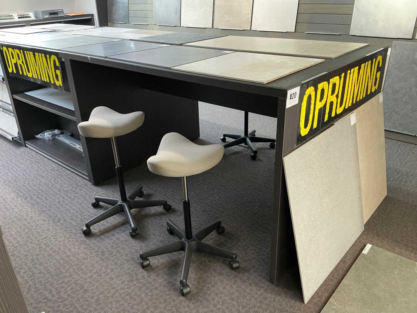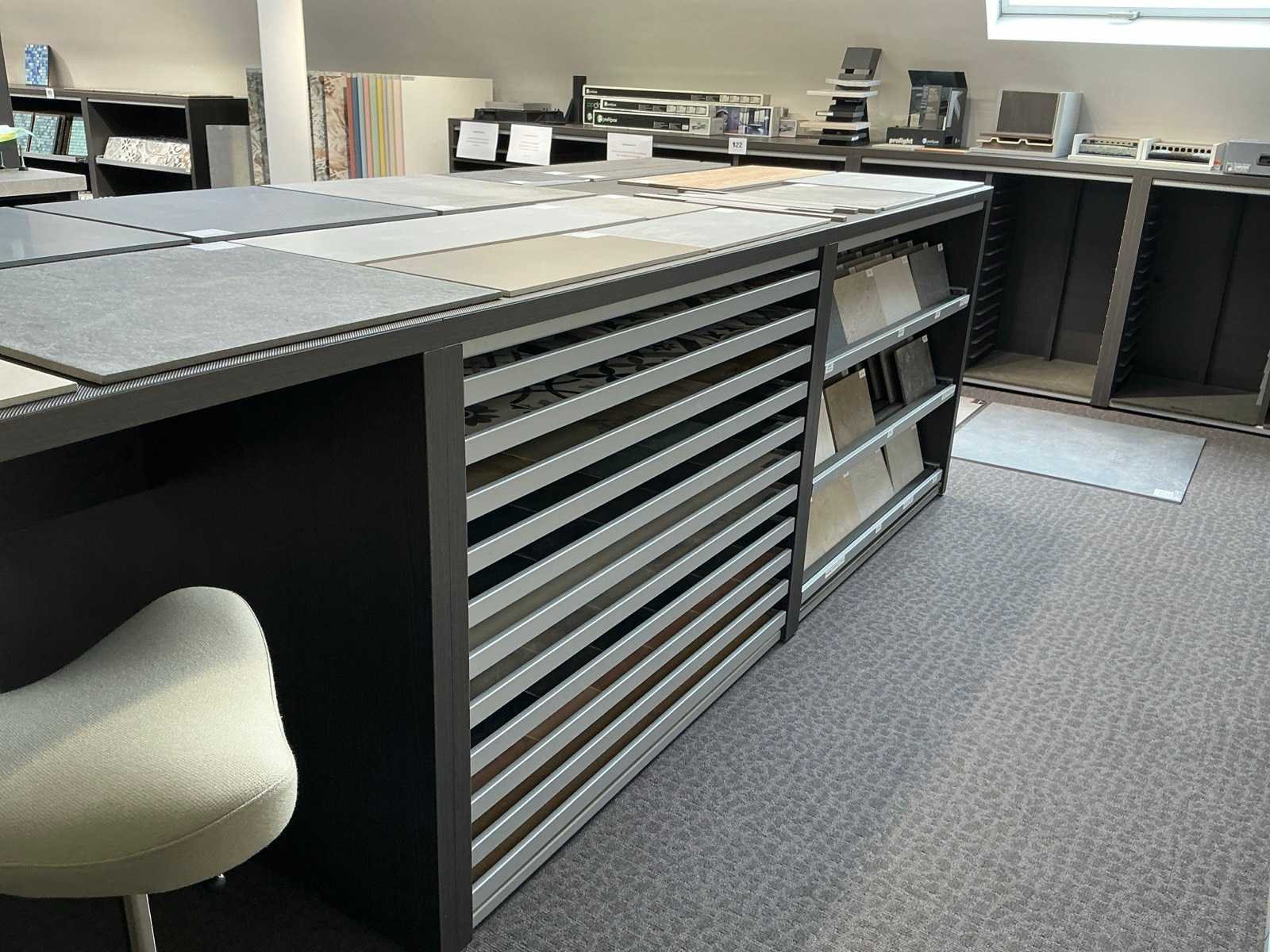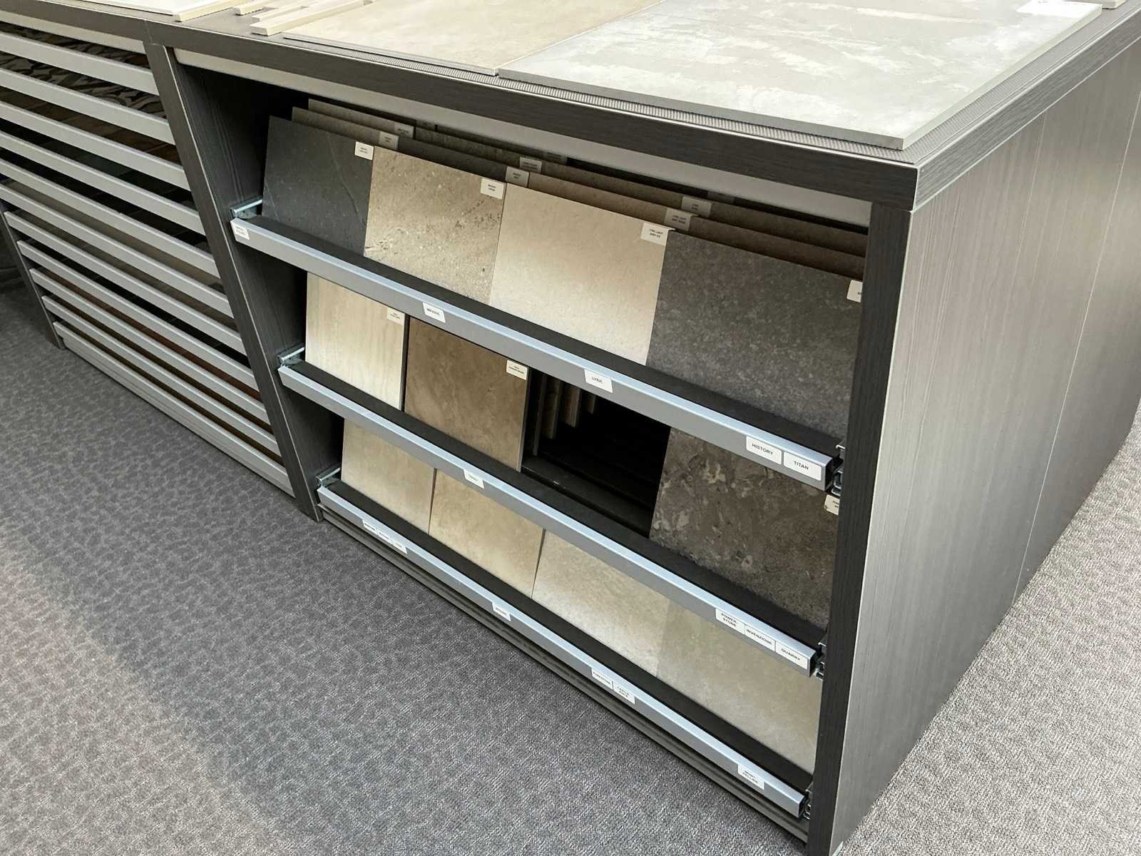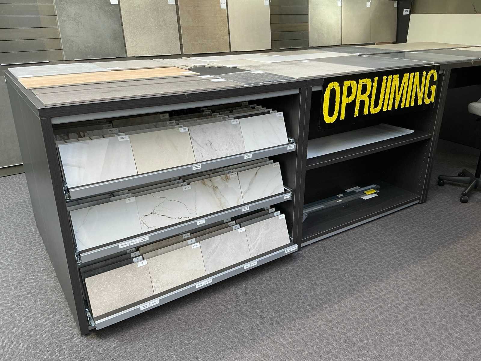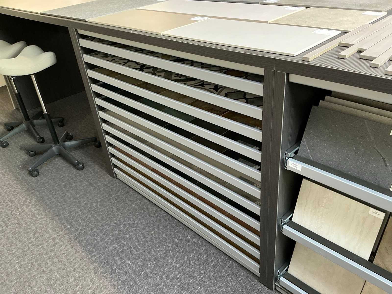 Bestaande uit tafel, voorzien van 4x krukken, met afmetingen ca. 180 x 132 x 110cm, 2x REDEC BU Blok 3 laden, met afmetingen ca. 133 x 66 x 110cm, 1x REDEC Catalogennis, met afmetingen ca. 133 x 44 x 110cm en 1x REDEC Delta 12/121, met afmetingen ca. 132 x 88 x 110cm. Te demonteren/verplaatsen van omgeving door koper. Alle aangeplakte tegels en toebehoren MOETEN meegenomen worden door de koper. Zich bevindend op het 1e verdiep. Nee Merk: REDEC