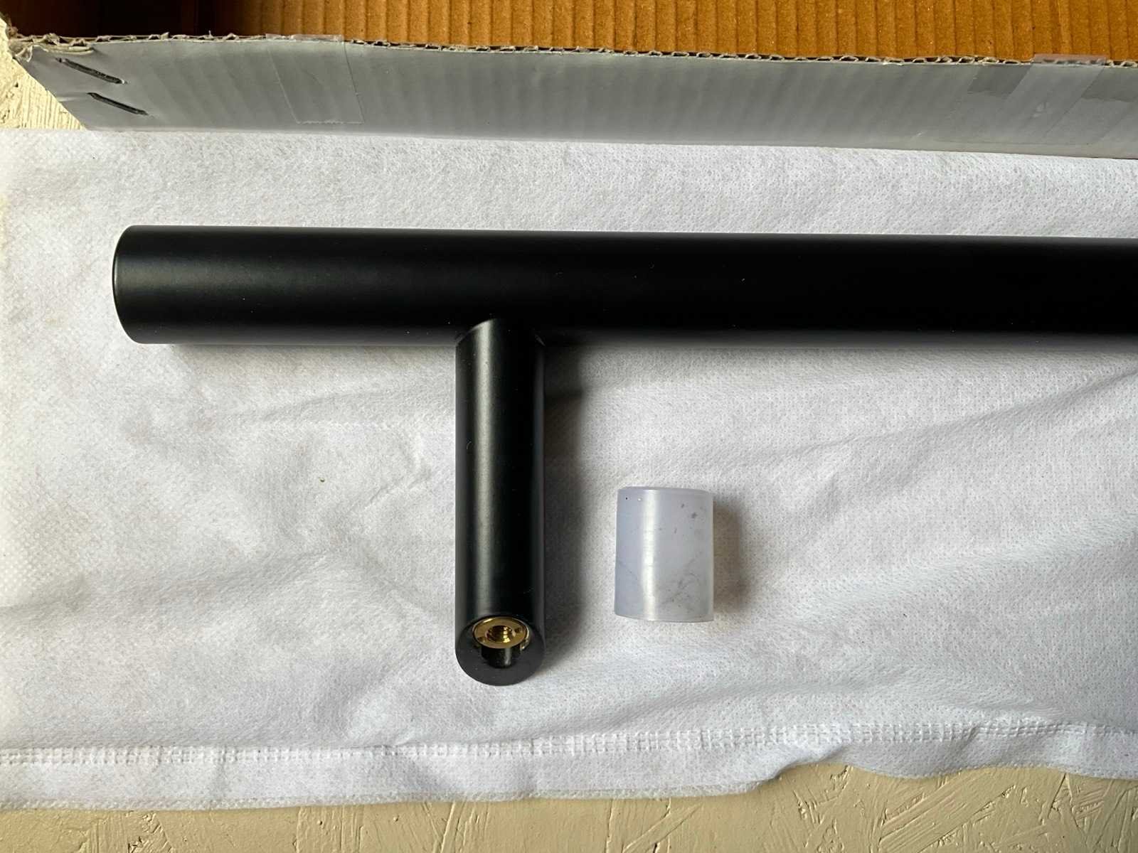 Deurgreep RVS en zwart gecoat, Kleur: Ral 8019 met schuine voeten. Diameter 30mm. Asmaat 300mm. Totale lengte 500mm. T-model. Inclusief bevestigingsmateriaal. Kan gemonteerd worden op hout, PVC en aluminium Nee