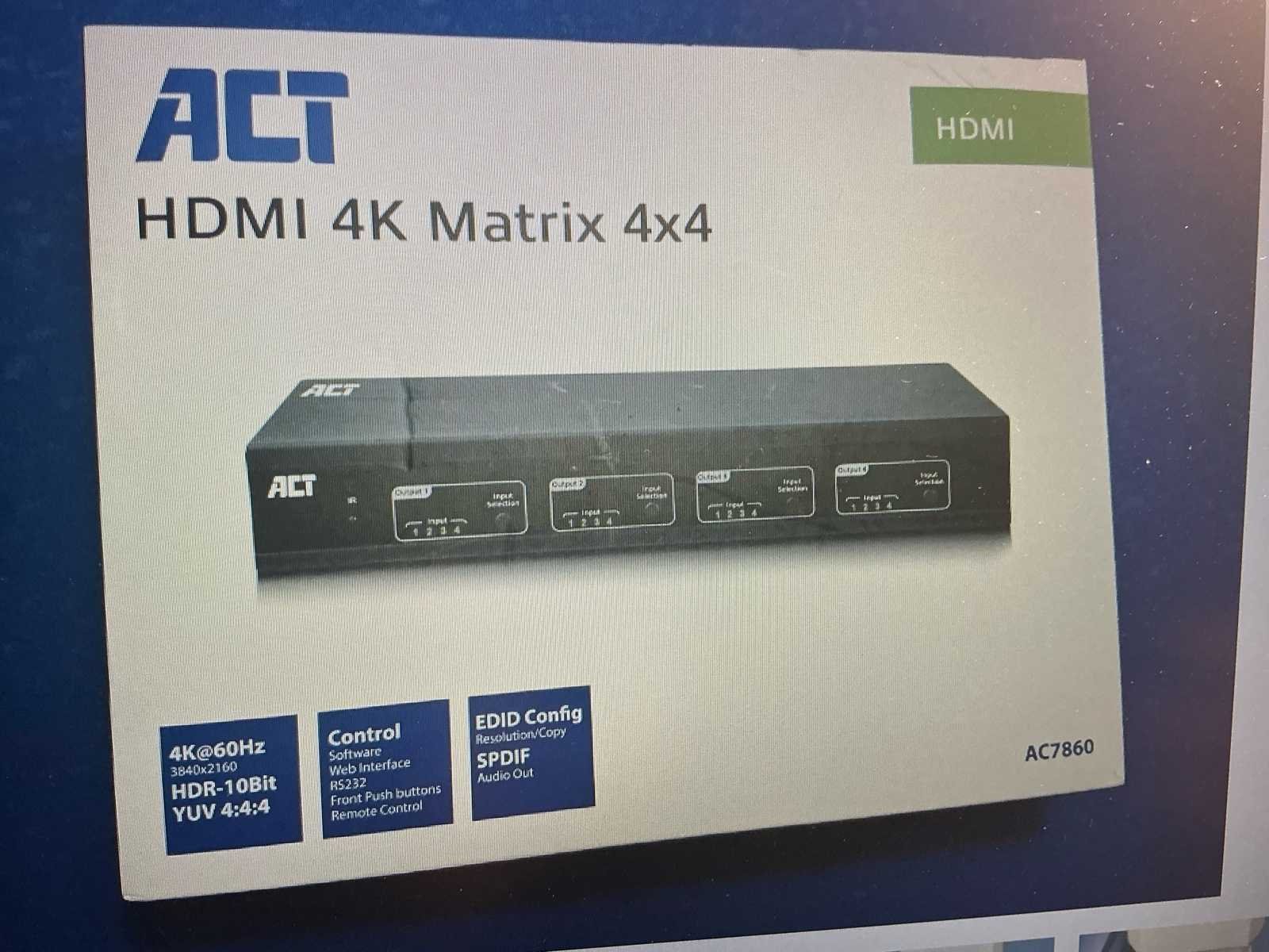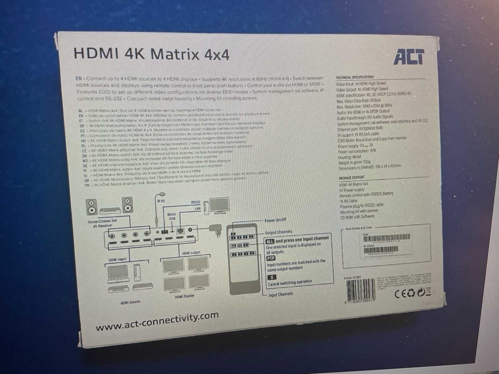 NIEUW, projector scherm ongeopend in originele verpakking, 92inch op 1.15 inch. NIEUW, merk ACT - HDMI Matrix 4K. 4x 4 . Deze ondersteunt 4 HDMI-ingangen, 4 HDMI-uitgangen, 4K @ 60 Hz, HDCP 2.2, audio via HDMI of SPDIF/coaxiaal, en schakelen via afstandsbediening, knoppen, RS-232 of IP/ethernet.  • Dit is een “full-featured” matrix switch (niet zomaar een splitter) — je kunt 4 bronnen onafhankelijk routeren naar 4 schermen, met behoud van 4K-resolutie.  No Merk: ACT Model: Projector scherm Product type: DS 9092 Breedte: 114cm Hoogte: 230cm