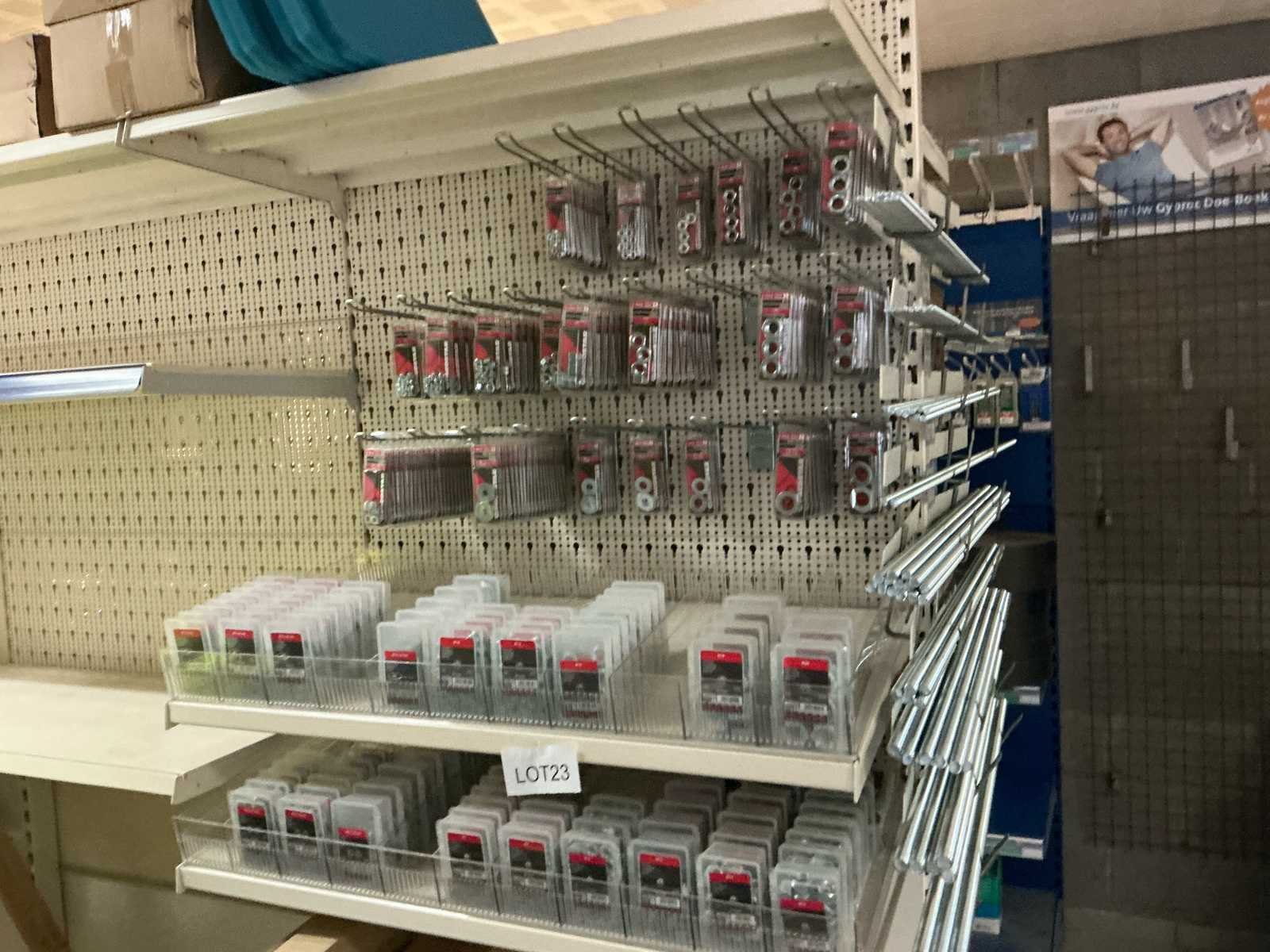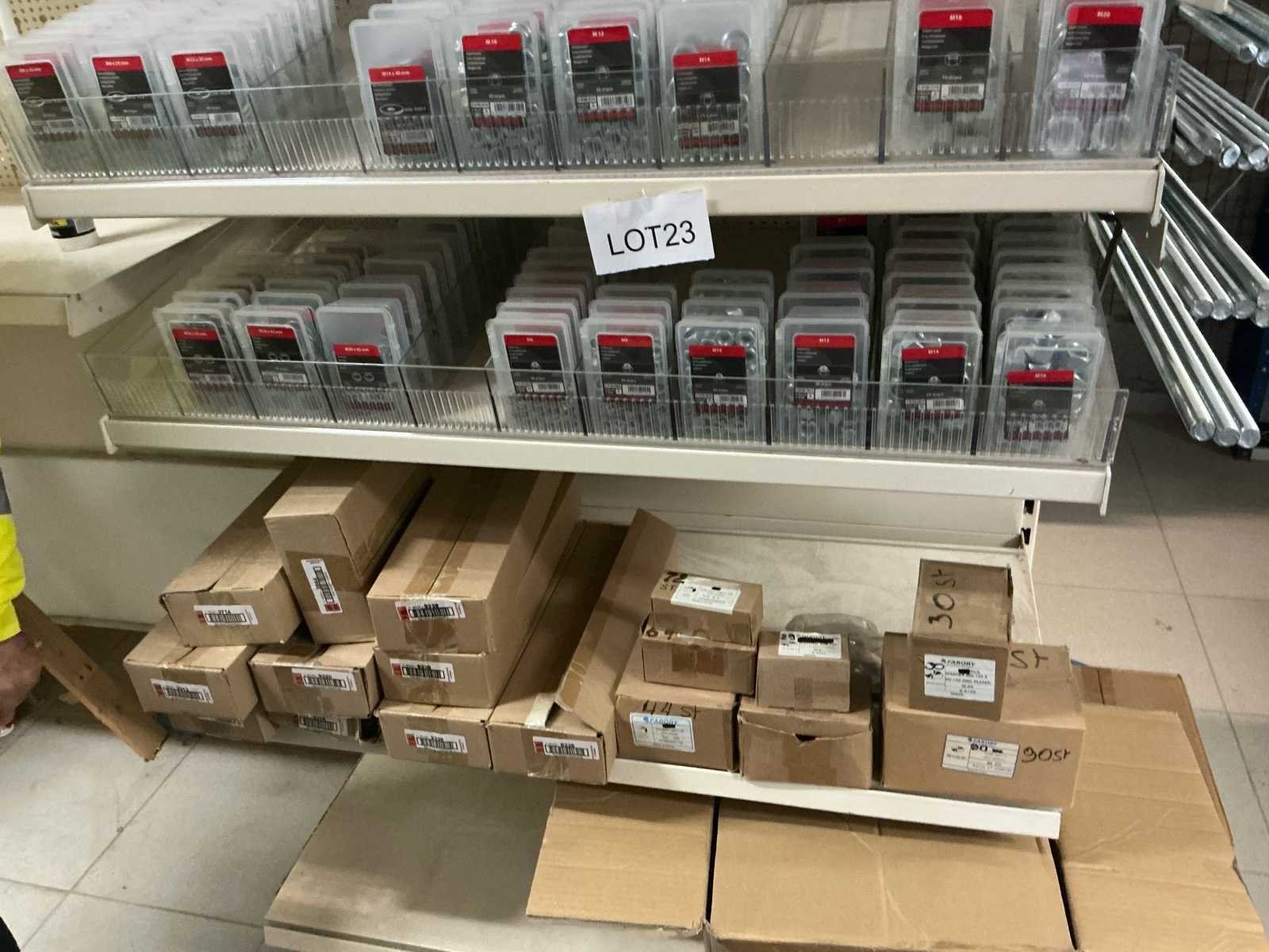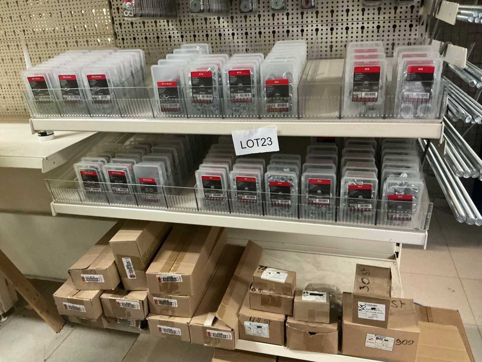 Totaal van duizenden moeren, draadstang, borgmoeren, rondelen en bladvangers. Groot lot te koop wegens stopzetting bedrijf. Nieuw nieuw in originele verpakking. No Merk: Fabory Type: Moeren-en borgmoeren, zeskant, tijger filtée, onderlegring en bladvanger.