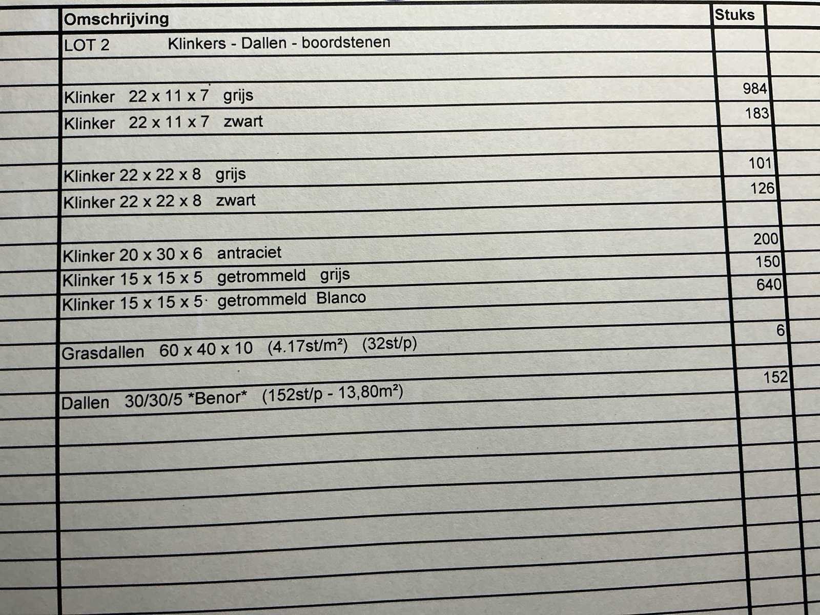 Verkoop in lot wegens stopzetting bedrijf. No Product type: Klinkers, grasdallen en dallen.