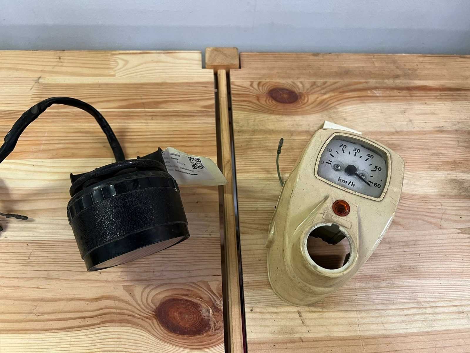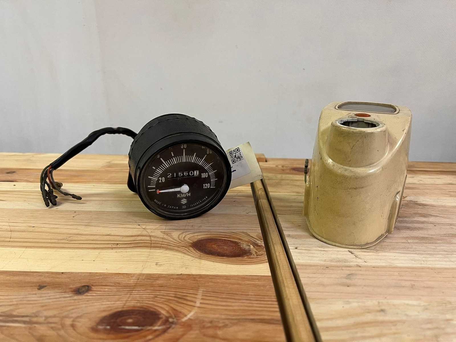 Set bestaande uit: Zwarte ronde kilometerteller, schaal tot 120 km/h - Mechanisch - Afgelezen stand: 21.560 km - Inclusief kabel en bevestigingsbeugel - Gebruikte staat, werking niet getest Beige kilometertellerunit met geïntegreerde behuizing (oldtimer-stijl) - Snelheidsmeter tot 60 km/h - Inclusief bedrading - Behuizing heeft ouderdomssporen - Werking niet getest Ideaal voor restauratieproject, oldtimer brommer, custom build of onderdelen. Wordt verkocht in de staat zoals gezien op de foto’s. Nee Merk: Suzuki Product type: Kilometerteller / snelheidsmeter (mechanisch) Kleur: Zwart & Beige Materiaal: Kunststof & metaal