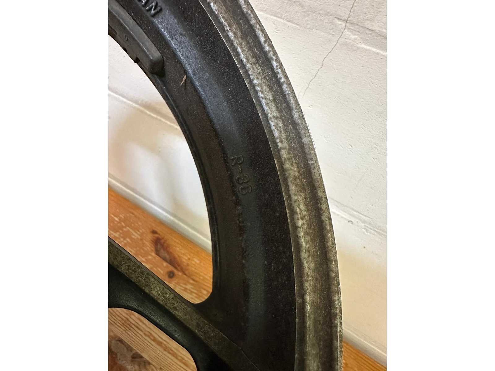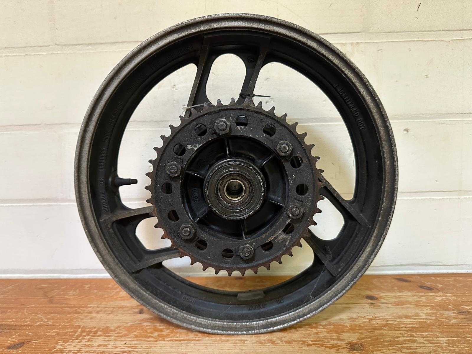 Velg achterwiel Yamaha FJ1100. Inclusief achtertandwiel, lagers aanwezig maar staat onbekend, sporen van gebruik en duidelijke corrosie/oxidatie aan de randen. Velg heeft zichtbare slijtage en roestvorming aan de buitenrand. Zie foto’s voor staat. MPN op label: 36Y253380098. Nee Merk: Yamaha Model: FJ1100 Product type: Velg Achterwiel Kleur: Zwart (verbleekt / oxidatiesporen zichtbaar)