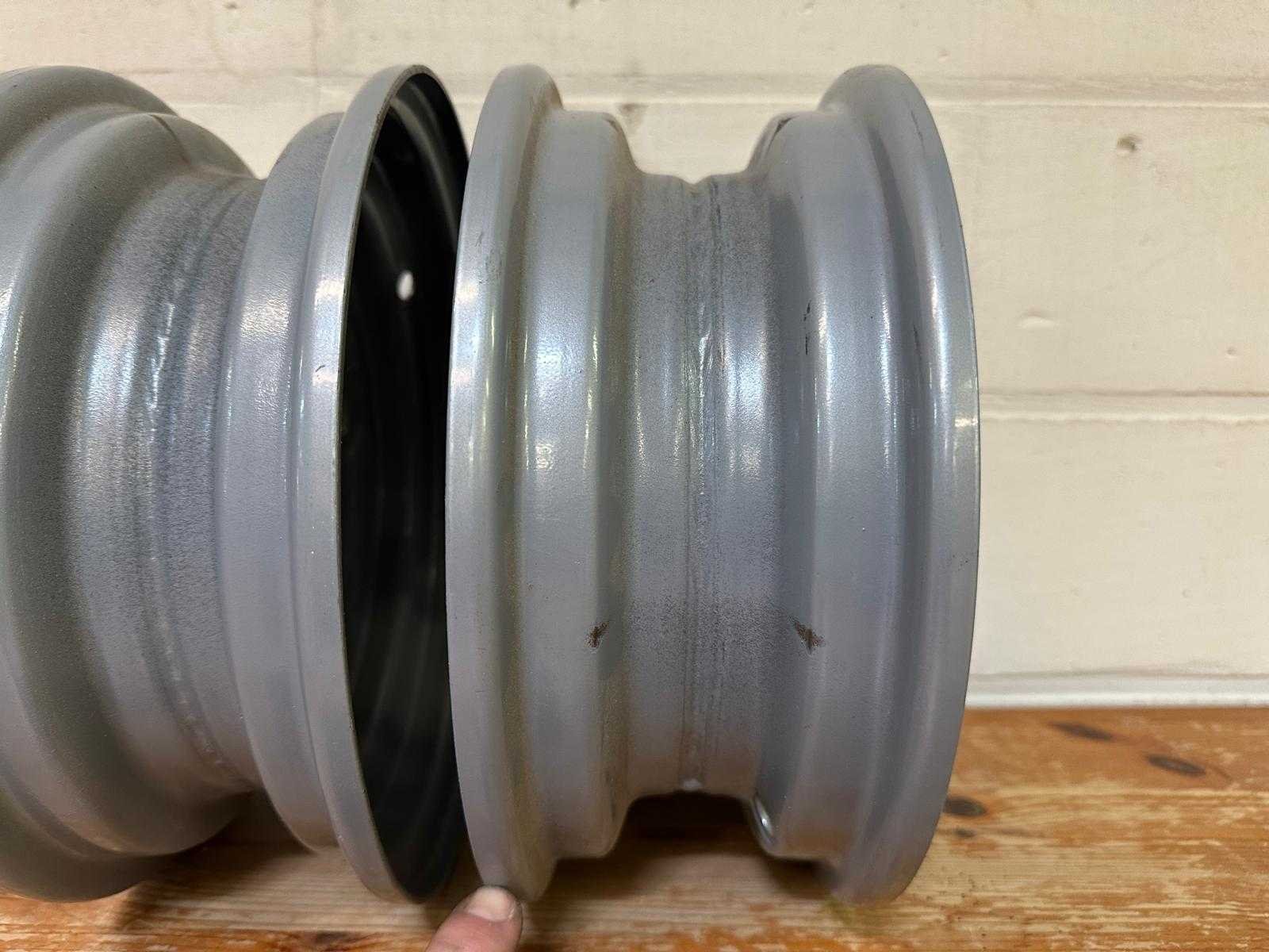Set van 2 stalen velgen. Diameter vermoedelijk 8–10 inch (zie foto’s). Geschikt voor tuinwagens, kleine karren, zitmaaiers of lichte aanhangwagens. Markeringen: CLM, V629, 06-19. In goede gebruikte staat. Nee Merk: CLM (vermoedelijk)