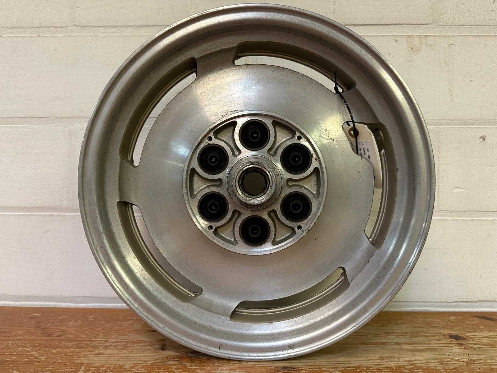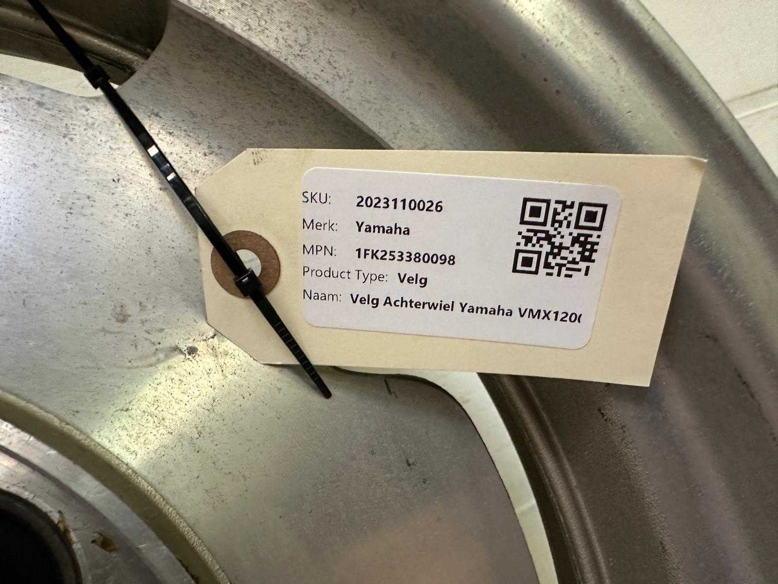 Originele Yamaha achtervelg. Markeringen zichtbaar: J 15M/C×MT 3.50 DOT, R-47, Japan. Geschikt voor Yamaha VMX1200 / V-Max (oud model). Gebruikte staat, met lichte oxidatie en normale gebruikssporen. MPN op label: 1FK253380098 maar lijkt interne magazijncodering; officiële Yamaha-onderdeelcode is 1FK-25338-00. Nee Merk: Yamaha Model: VMX1200 Product type: Achterwiel / Velg Kleur: Zilver
