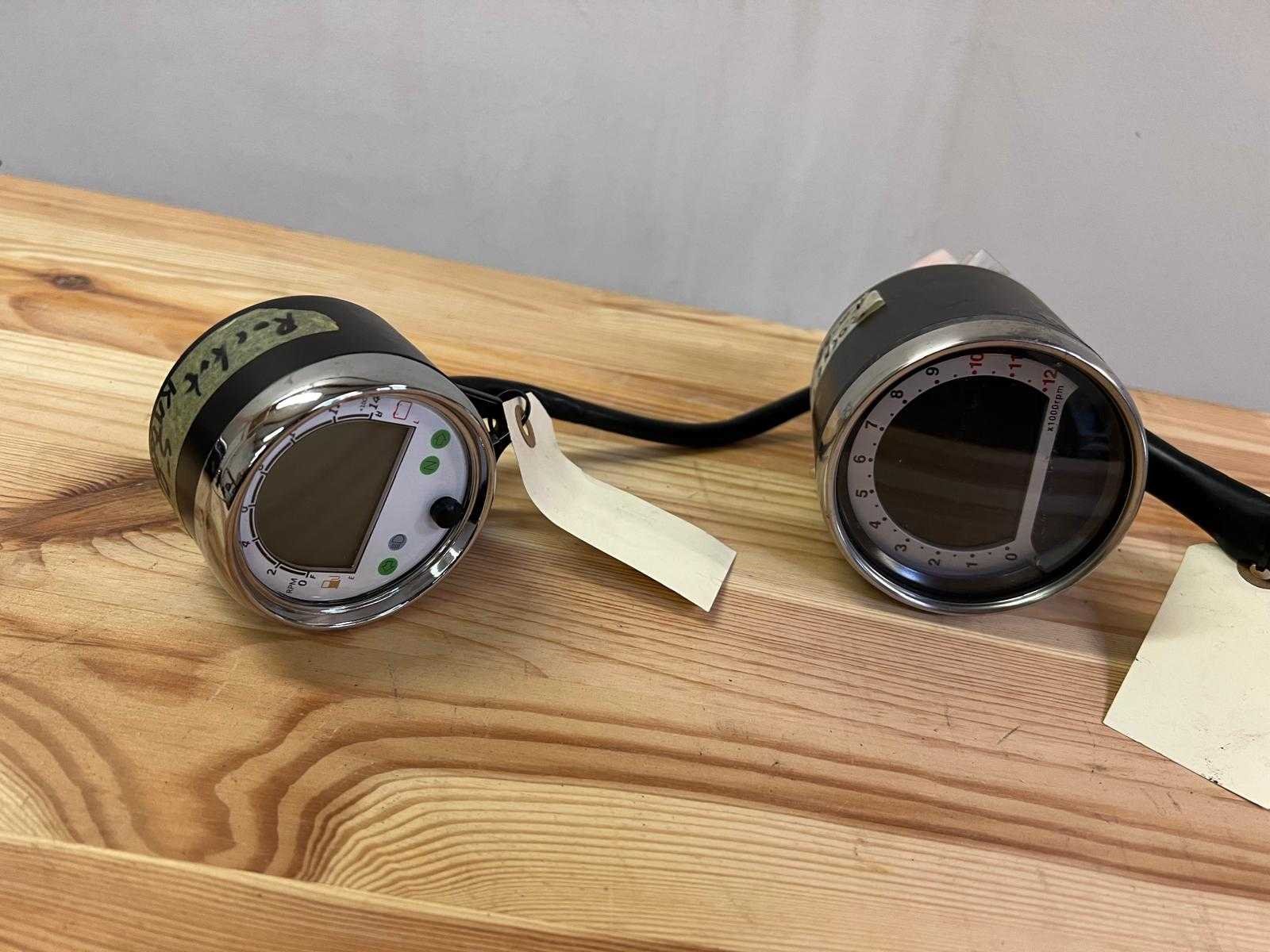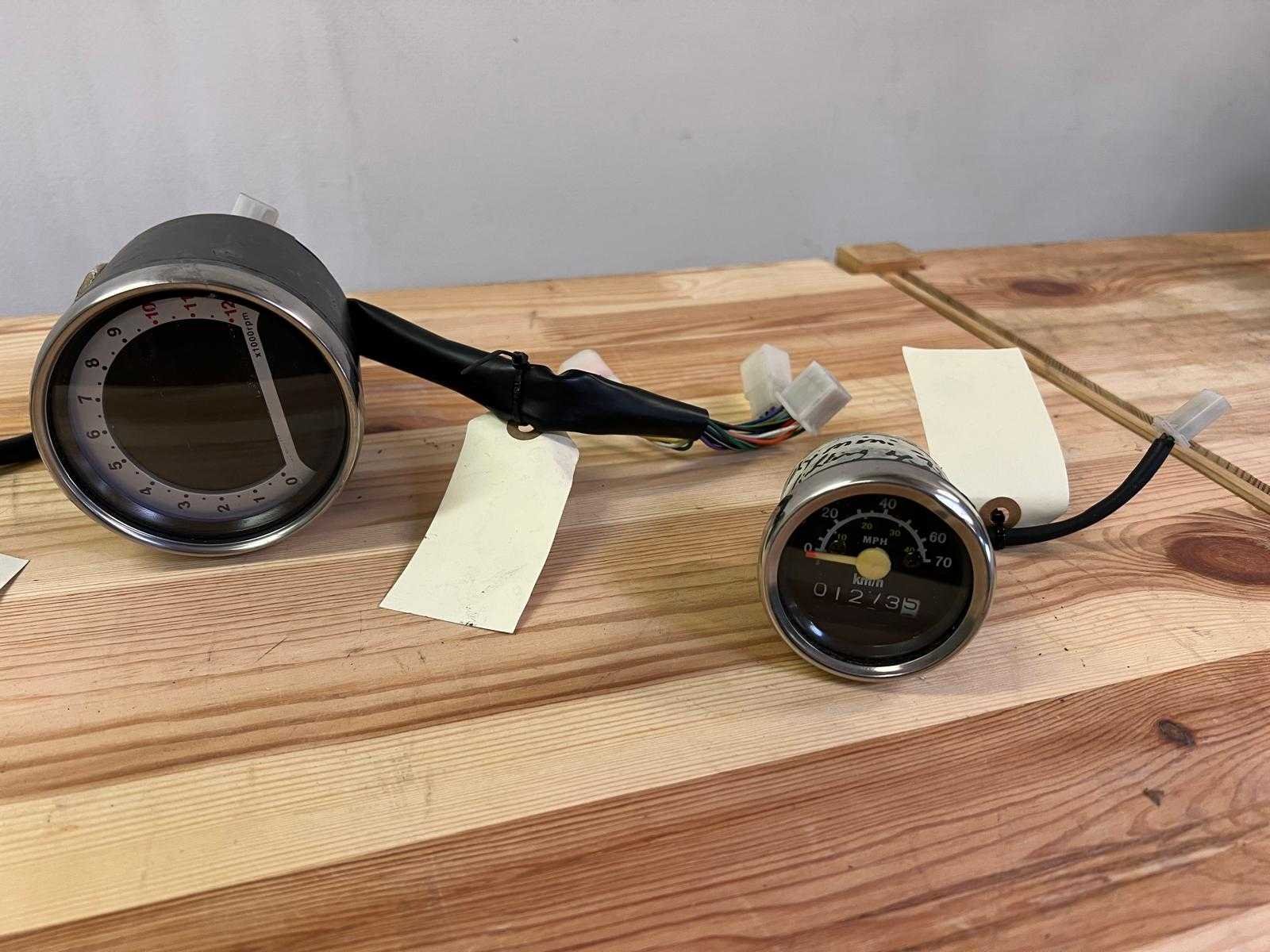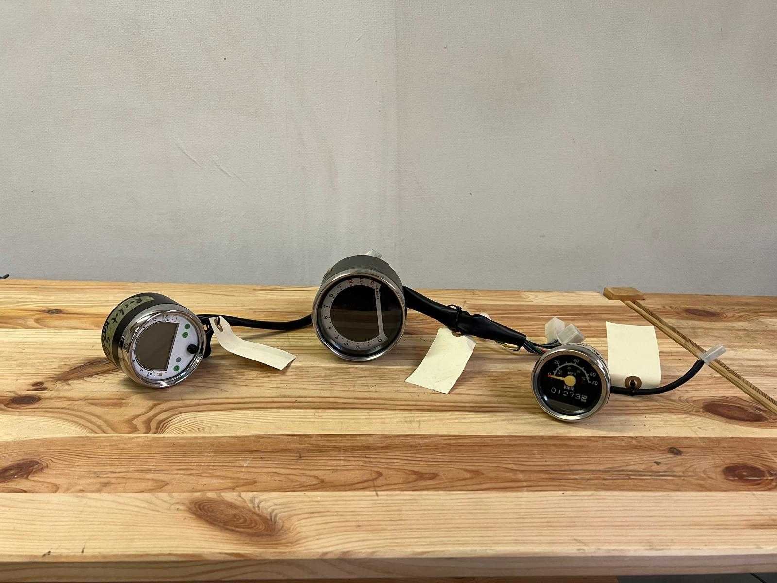 Set bestaat uit meerdere Skyteam meters: – Analoge kilometerteller (mph/kmh) – Analoge toerenteller Bekabeling en stekkers aanwezig Staat: gebruikt, functionele staat onbekend Oorspronkelijk afkomstig van Skyteam minibike / dax-achtige modellen Nee Merk: Skyteam Model: Diverse modellen Product type: Tellerset / kilometerteller / toerenteller Kleur: Zwart / Chroom Materiaal: Metaal / Kunststof