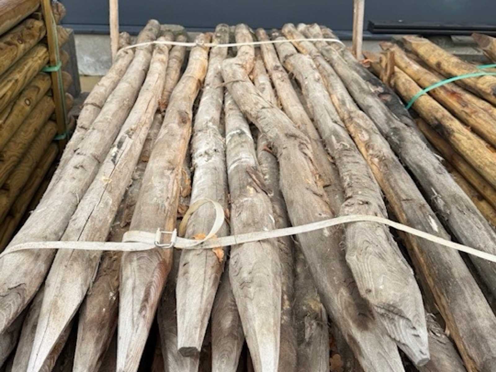 Lot bestaande uit: Pallet acacia palen: 150 stuks 2m Ø6/8 Gepund, gekroond No Houtsoort: Acaia Materiaal: Hout Breedte: 80mm Hoogte: 2000mm
