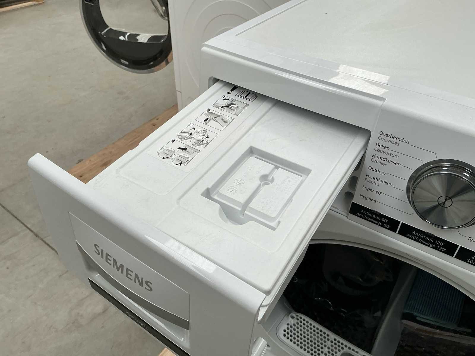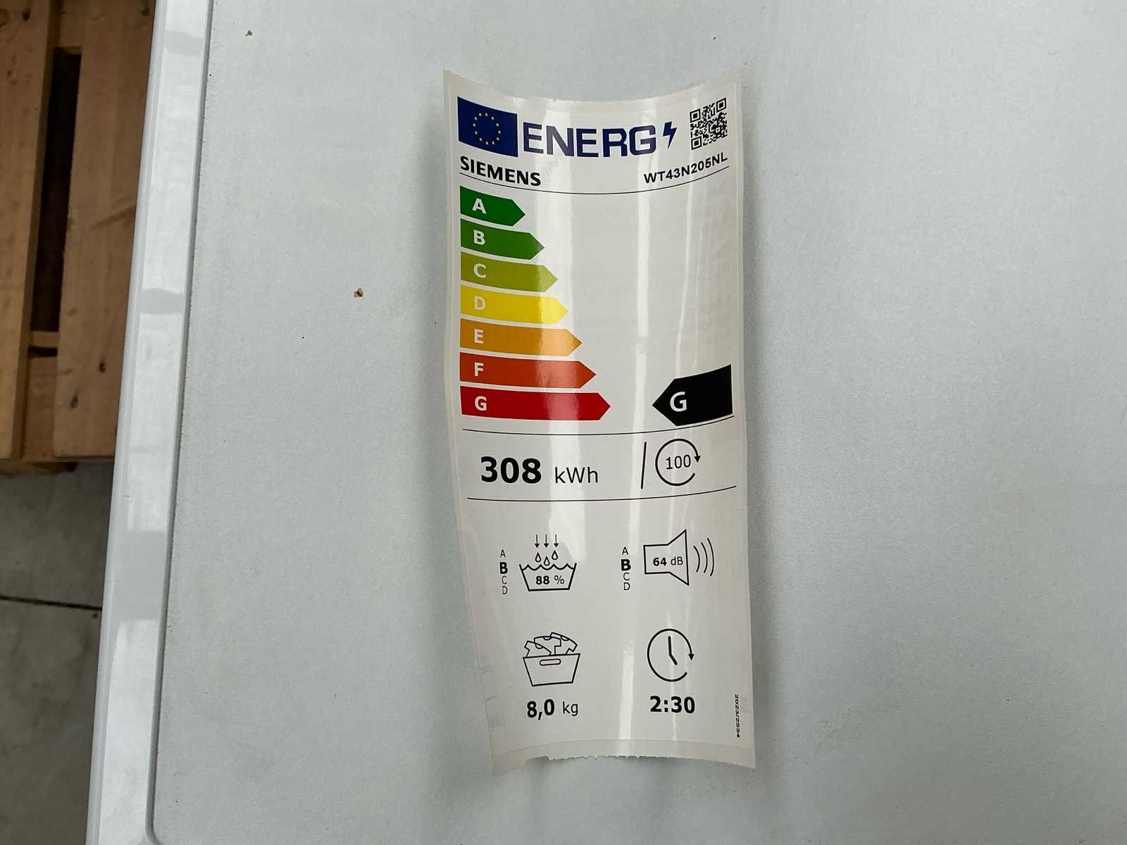 Showroommodel droger No Merk: Siemens Model: WT43N205NL Product type: IQ700 Spanning: 240V Volume: 64dB Energielabel: G Kleur: Wit Lengte: 60cm Breedte: 60cm Hoogte: 86cm Laadvermogen: 8kg