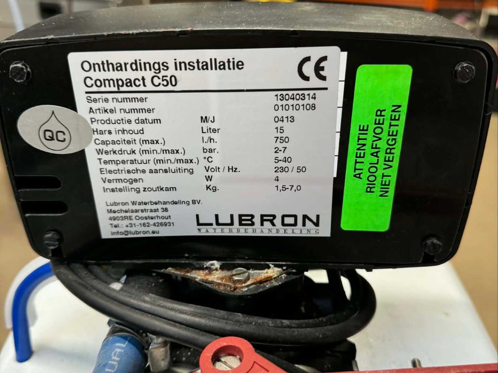 Lubron Professionele Waterontharder – Compact Model C50 Verzachtingssysteem voor kalkvermindering, geschikt voor professionele omgevingen (keuken, lichte industrie, wasserij, catering, enz.). Technische kenmerken: Merk: Lubron Waterbehandeling BV Model: Compact C50 Harsinhoud: 15 liter Maximale capaciteit: 750 L/u Bedrijfsdruk: 2 – 7 bar Bedrijfstemperatuur: 5 – 40°C Voeding: 230 V / 50 Hz Zoutstand: 1,5 – 7 kg Besturing door mechanische timer (tijdklok gestuurd) Ingebouwde harstank en zouttank met deksel No Merk: Lubron Aansluiting: 230V Type: Compact C 50 Tankinhoud: 15l
