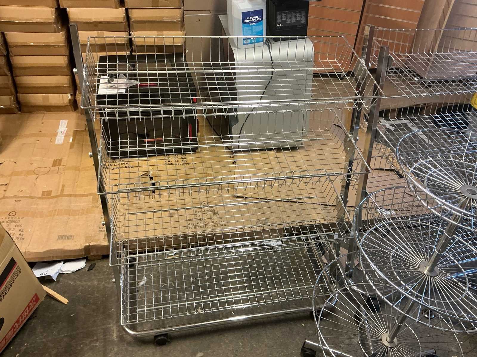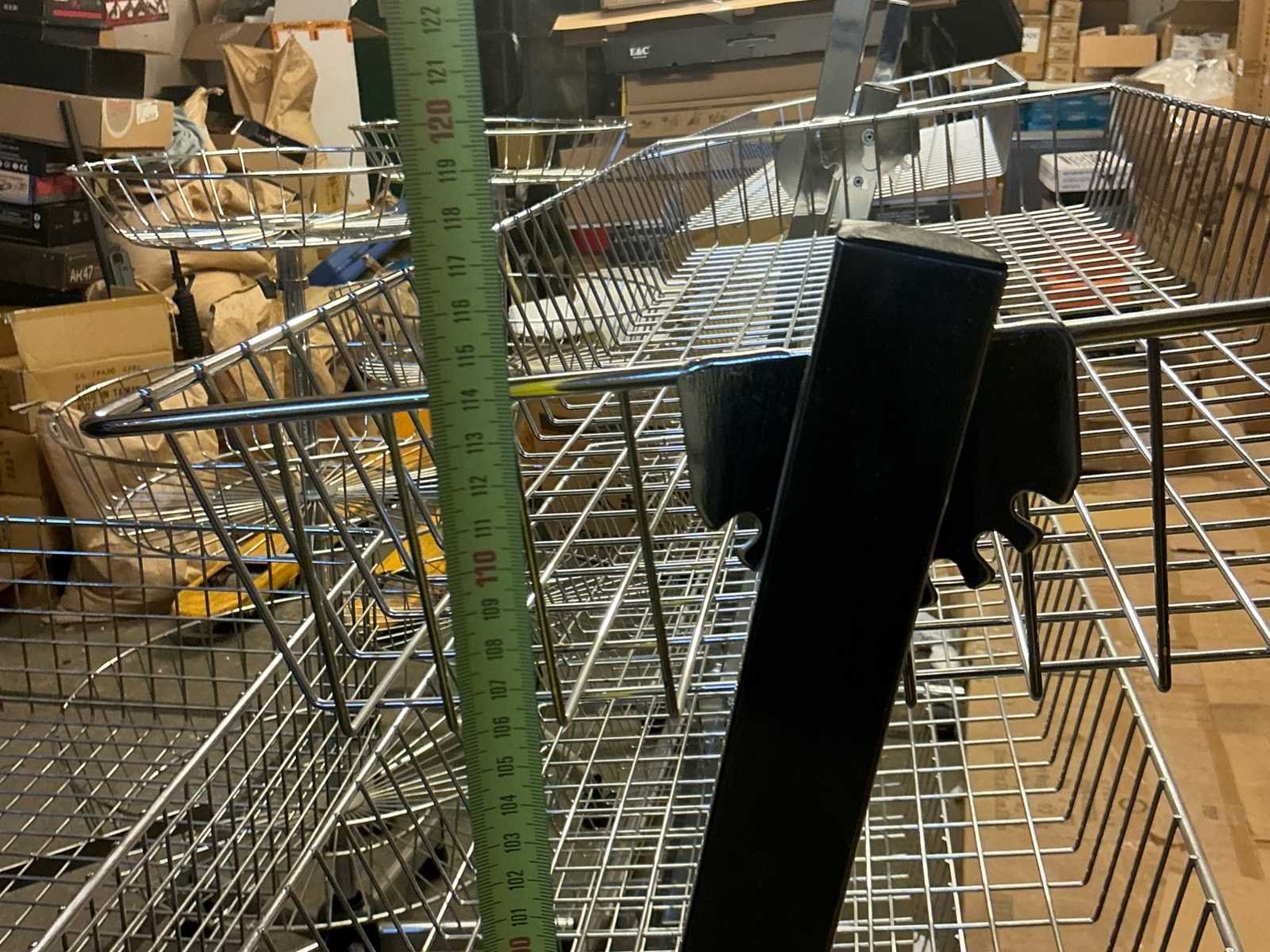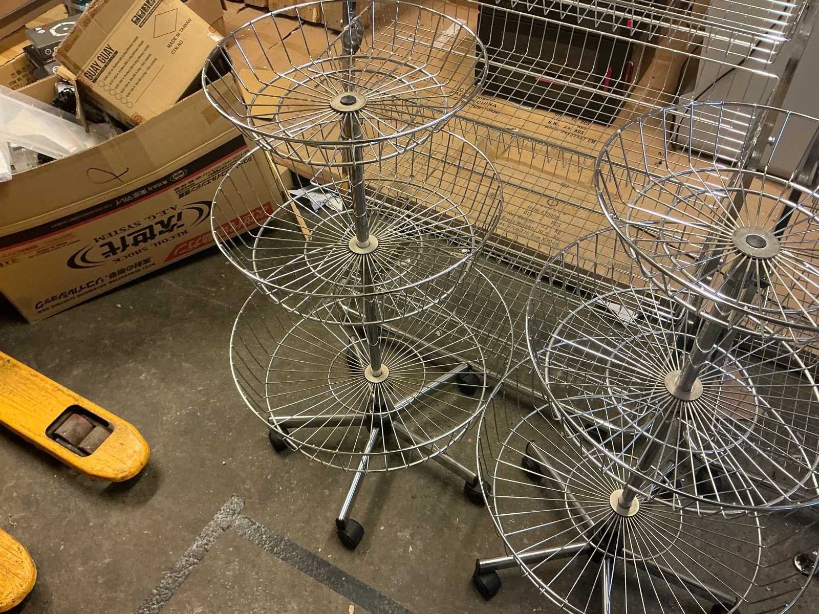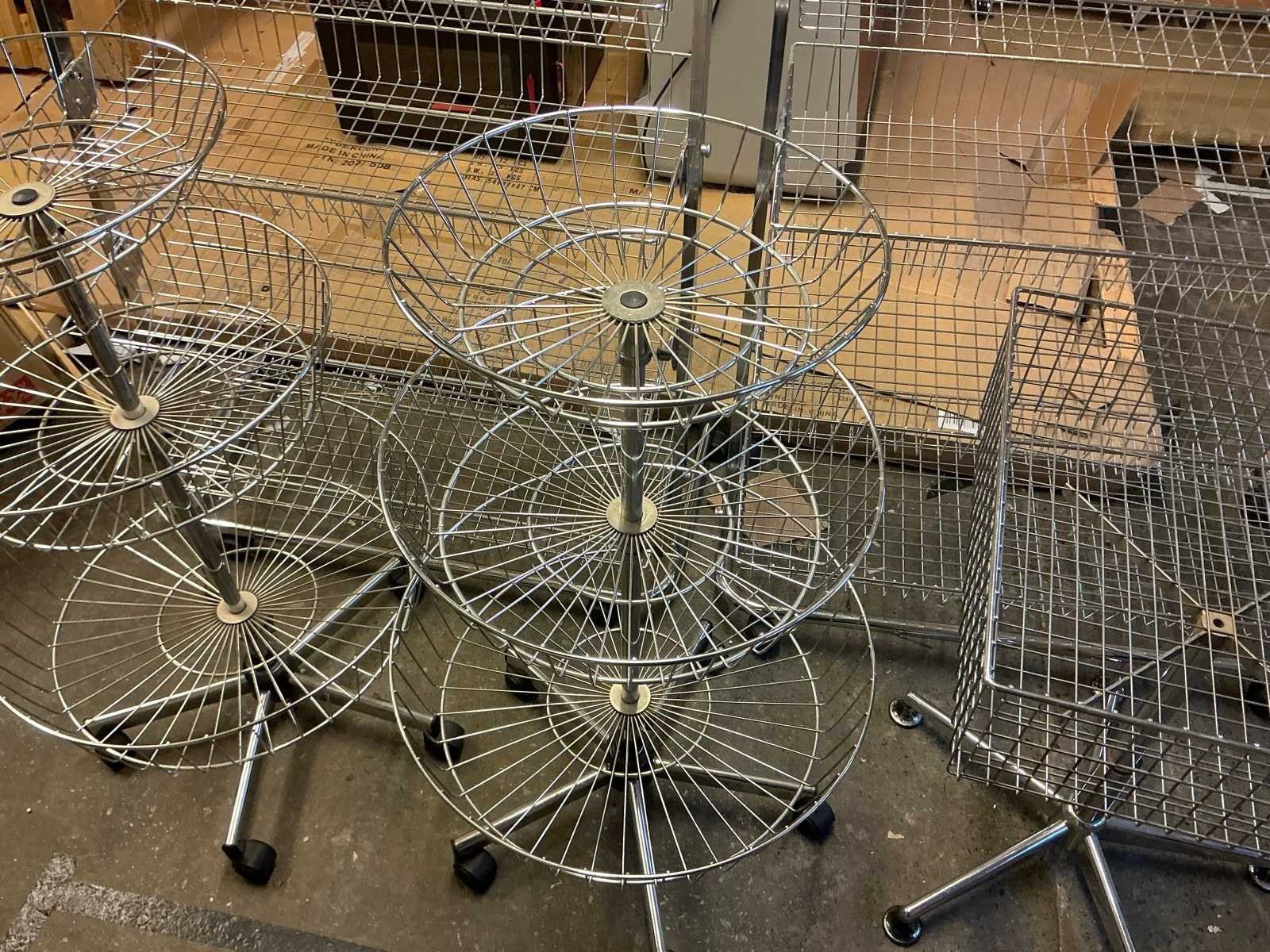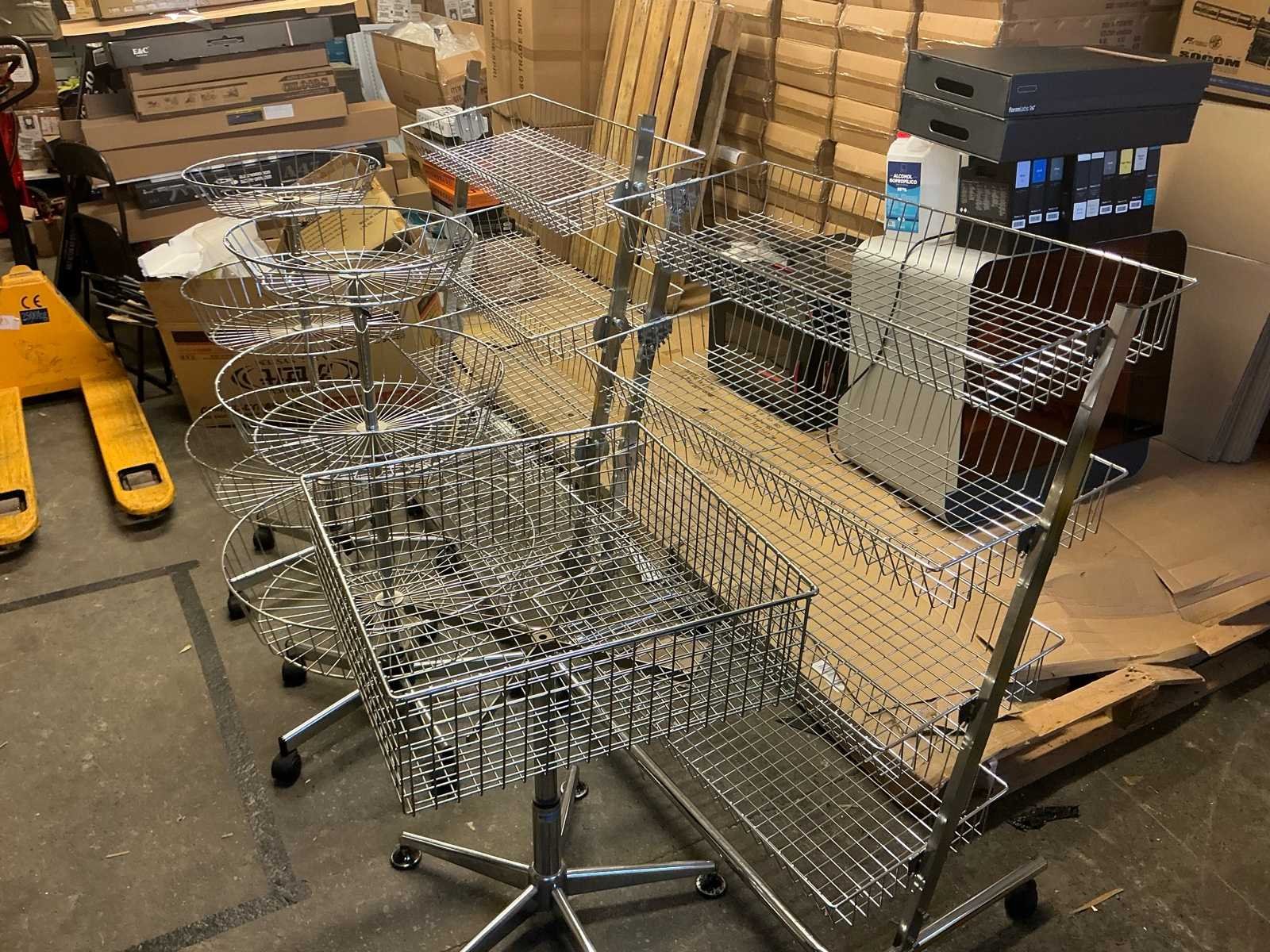 Het lot bevat verschillend winkel meubilair. -4 Presentatie-rekken met manden L65 x H118 cm -1 vierkant rek 60x60 cm -2 Presentatie-rekken met ronde manden. No