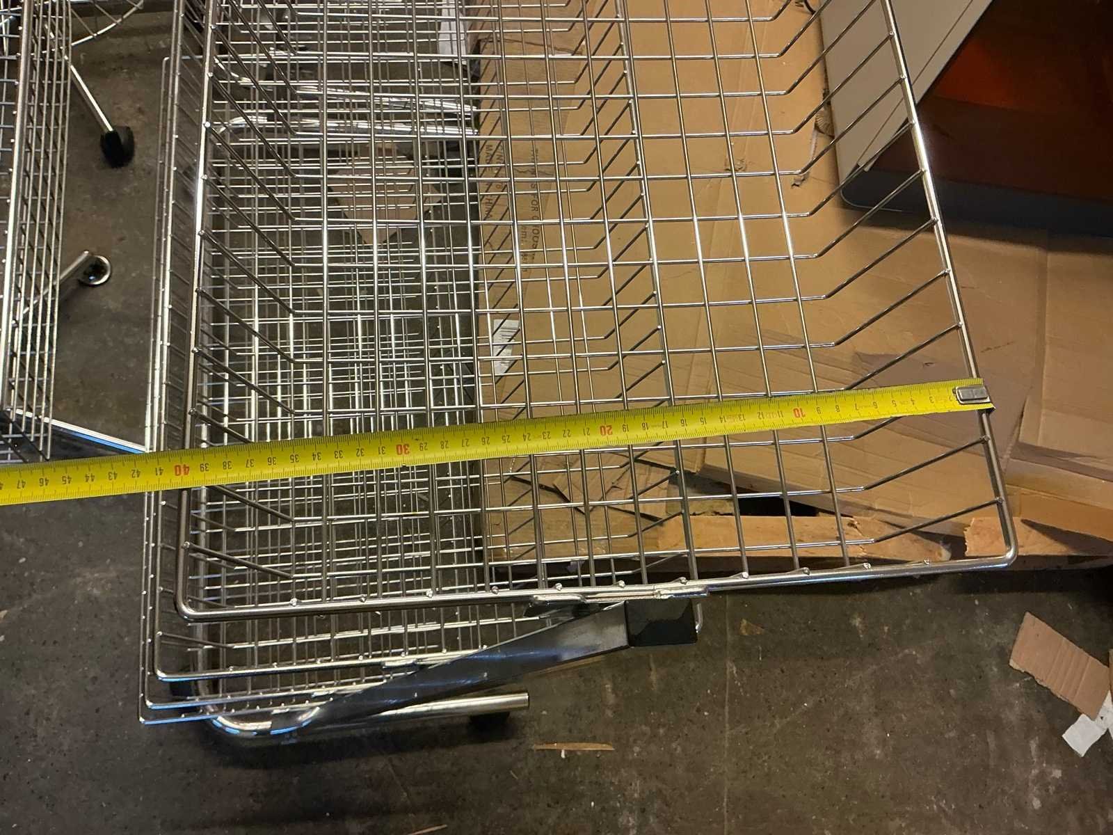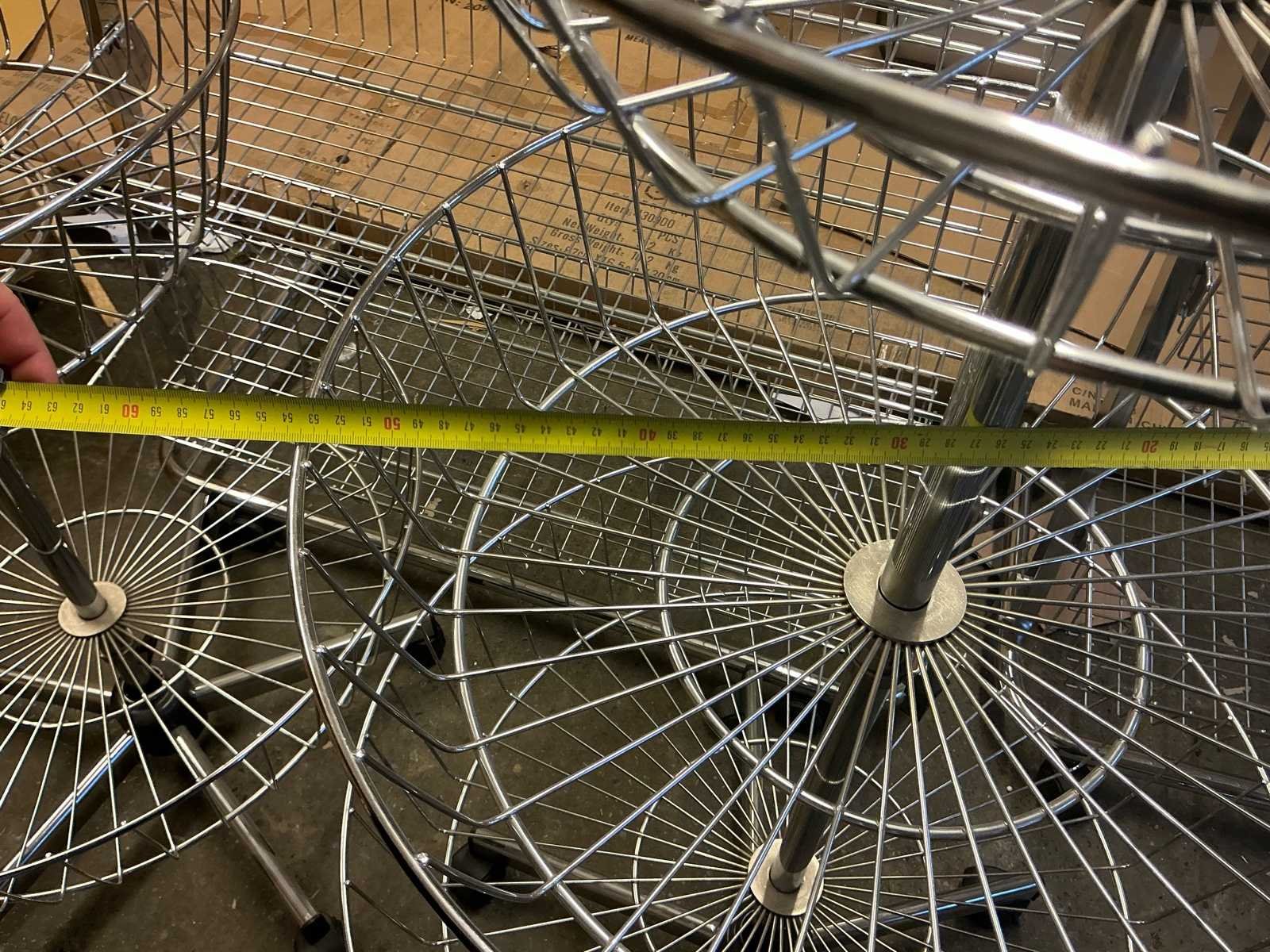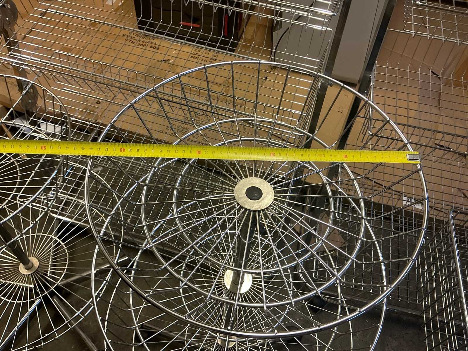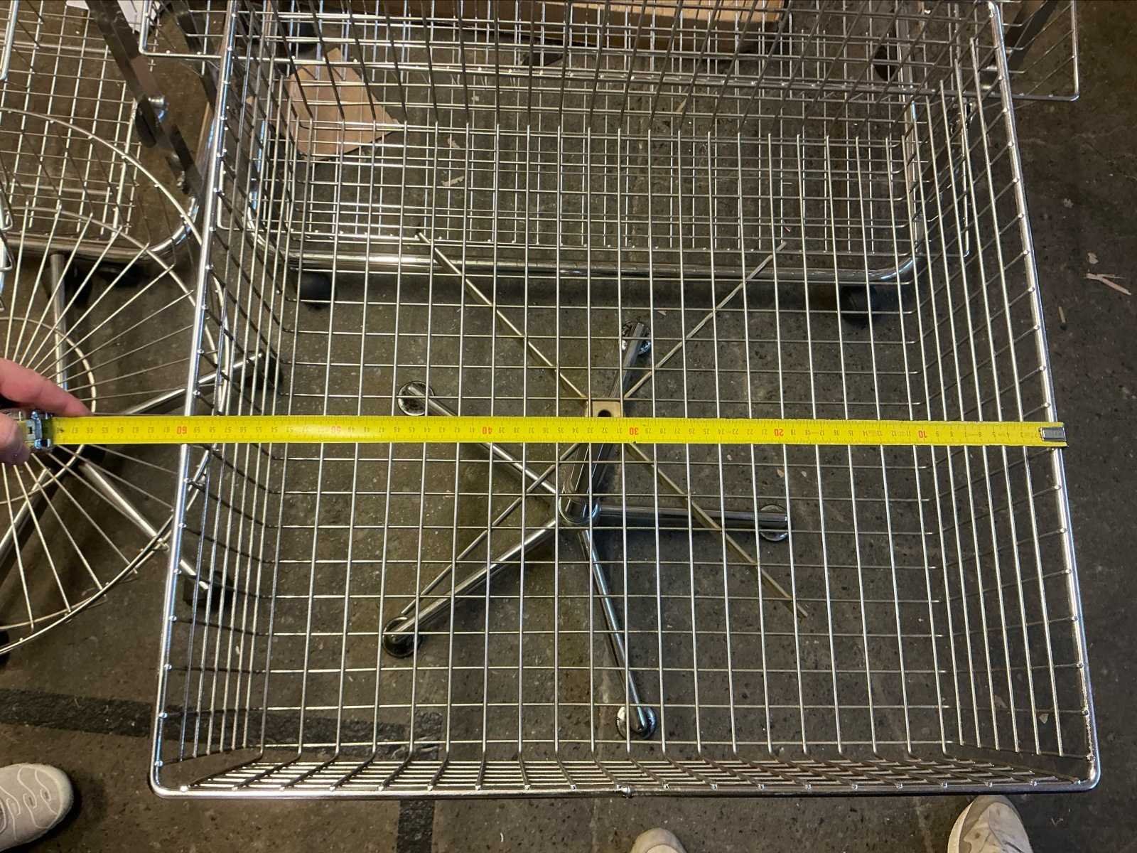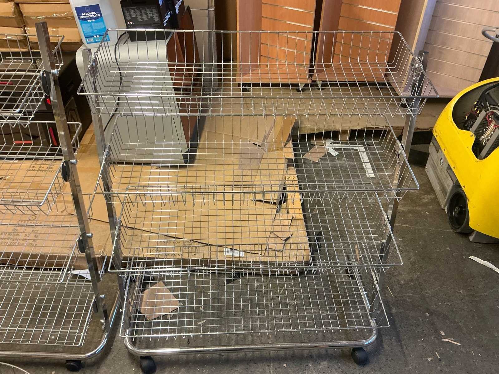 Het lot bevat verschillend winkel meubilair. -4 Presentatie-rekken met manden L65 x H118 cm -1 vierkant rek 60x60 cm -2 Presentatie-rekken met ronde manden. No