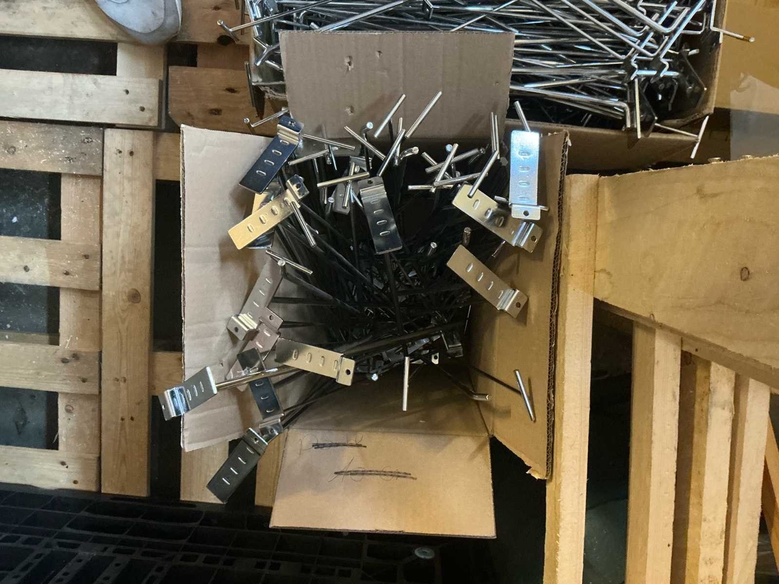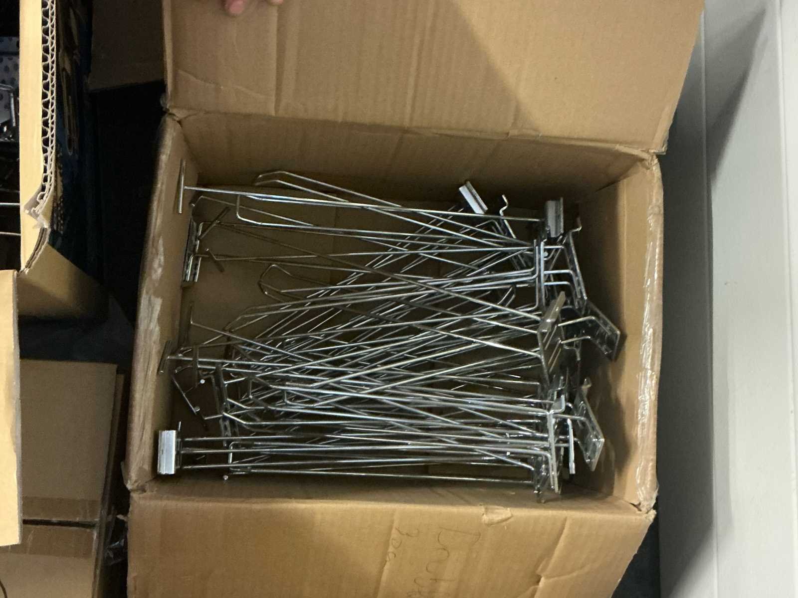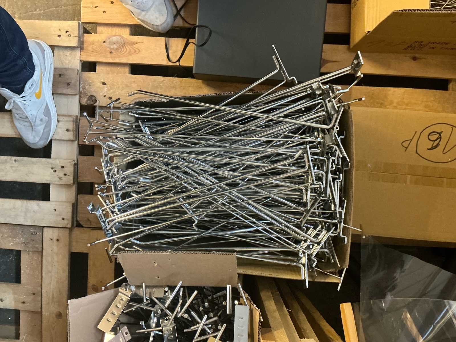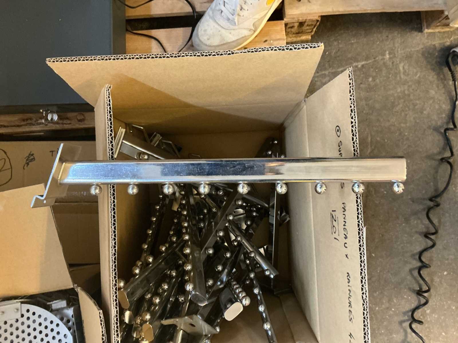 Het lot bevat verschillende winkelinrichting artikelen: -4x Houten sleufwand in esdoorn kleur. L120 X H120 Dikte 18 MM -31x Versterkte aluminium inzet voor sleufwand. -16x Pet/cap steunen voor sleufwand. -20x Ronde schuine arm voor sleufwand L30 cm -7x Kledingsstang 110 x 30 cm. -10x Helm/hoedenhouder voor sleufwand. -39x Enkele draadhaak + T voor sleufwand L30 cm -27x Dubbele draadhaak voor sleufwand L30 cm. -18x Dubbele draadhaak voor sleufwand L20 cm. -12x Enkele draadhaak + T L20 cm. -16x Enkele draadhaak + T L10 cm. -164x Enkele draadhaak + T L10 cm. -4x Metalen schuine plank voor sleufwand. -1x Elektrische Kassalade. No Hout: true