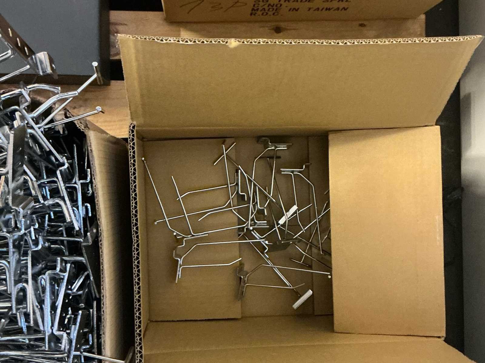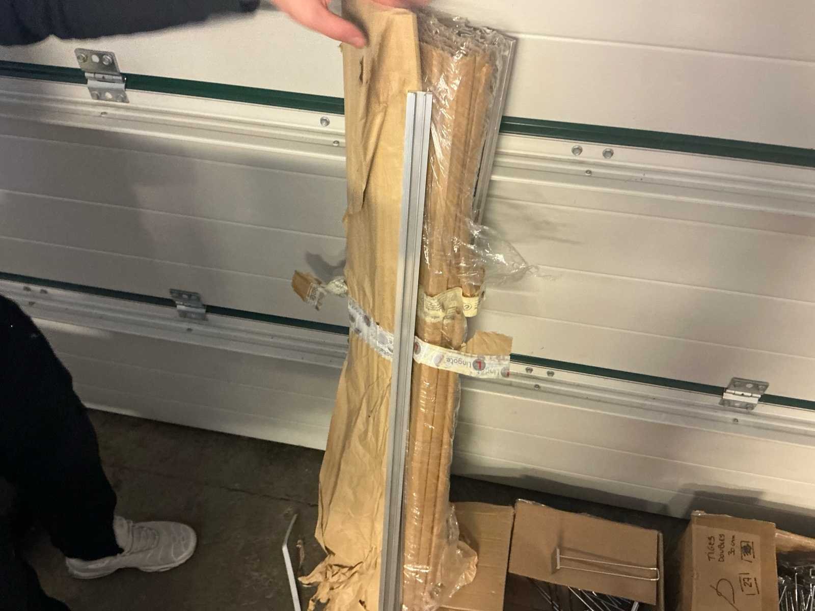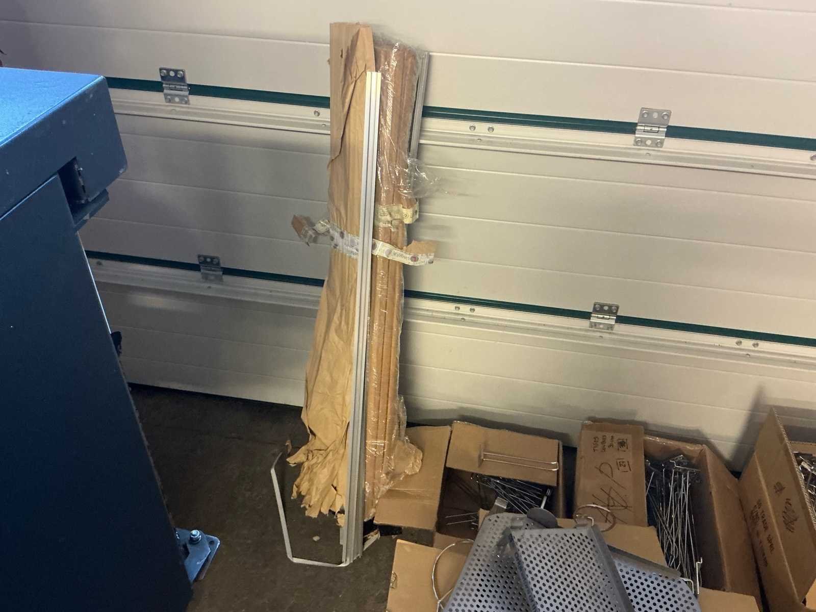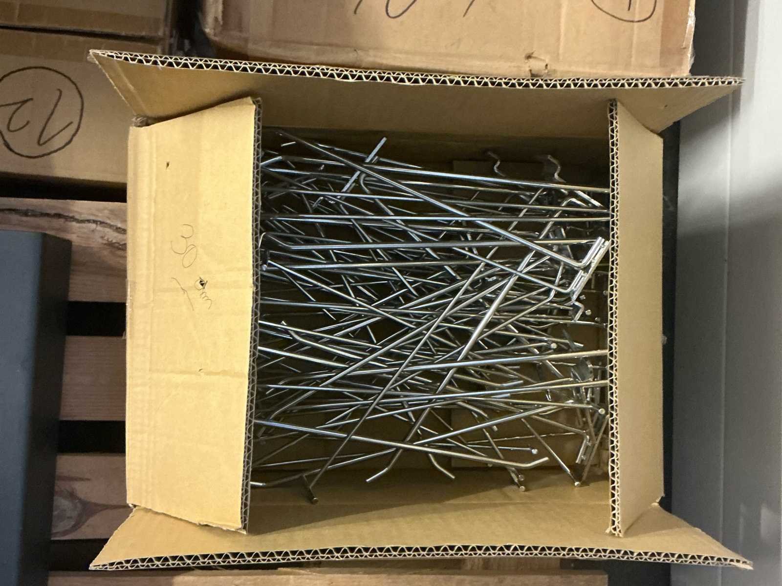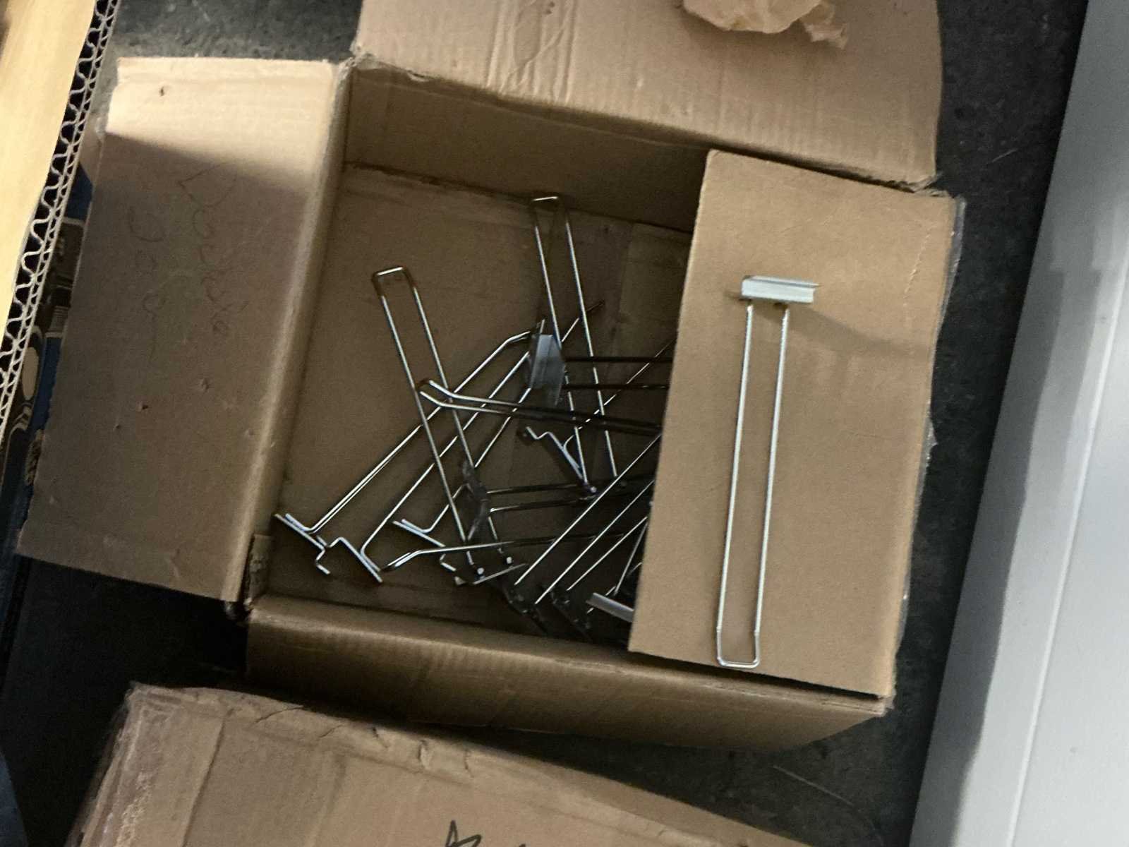 Het lot bevat verschillende winkelinrichting artikelen: -4x Houten sleufwand in esdoorn kleur. L120 X H120 Dikte 18 MM -31x Versterkte aluminium inzet voor sleufwand. -16x Pet/cap steunen voor sleufwand. -20x Ronde schuine arm voor sleufwand L30 cm -7x Kledingsstang 110 x 30 cm. -10x Helm/hoedenhouder voor sleufwand. -39x Enkele draadhaak + T voor sleufwand L30 cm -27x Dubbele draadhaak voor sleufwand L30 cm. -18x Dubbele draadhaak voor sleufwand L20 cm. -12x Enkele draadhaak + T L20 cm. -16x Enkele draadhaak + T L10 cm. -164x Enkele draadhaak + T L10 cm. -4x Metalen schuine plank voor sleufwand. -1x Elektrische Kassalade. No Hout: true