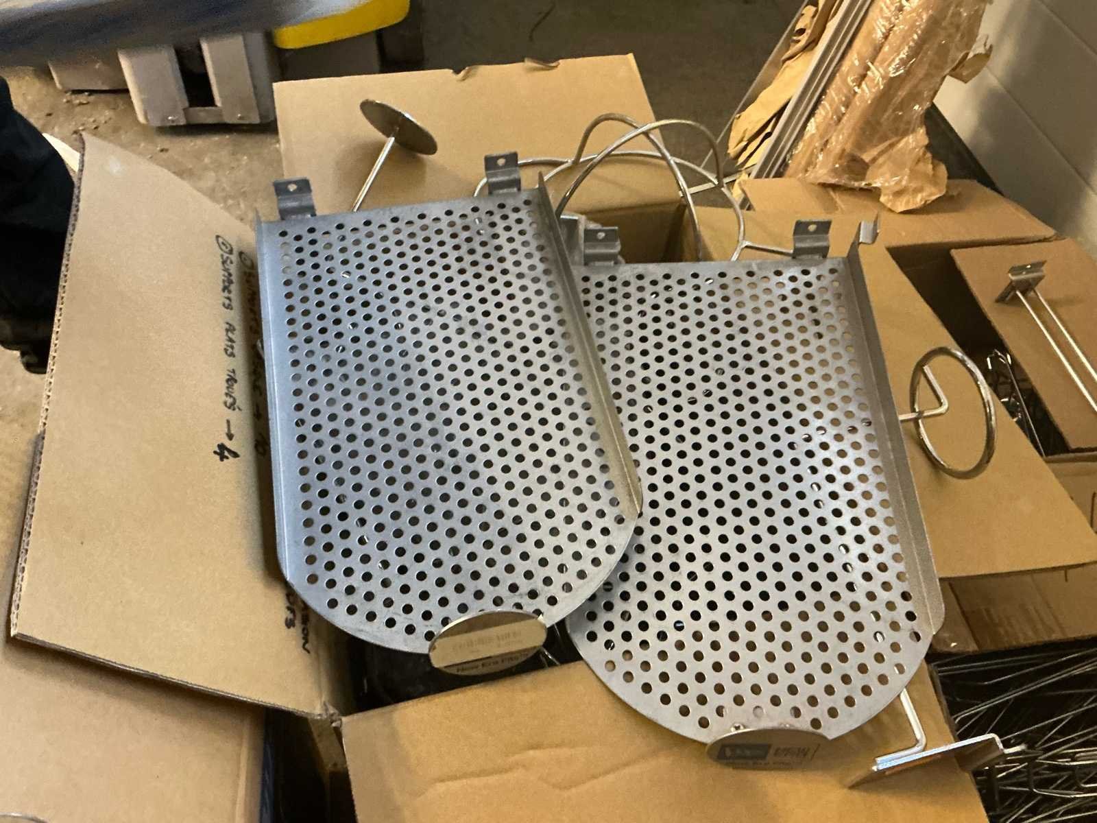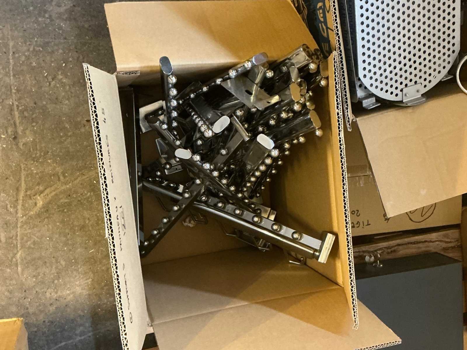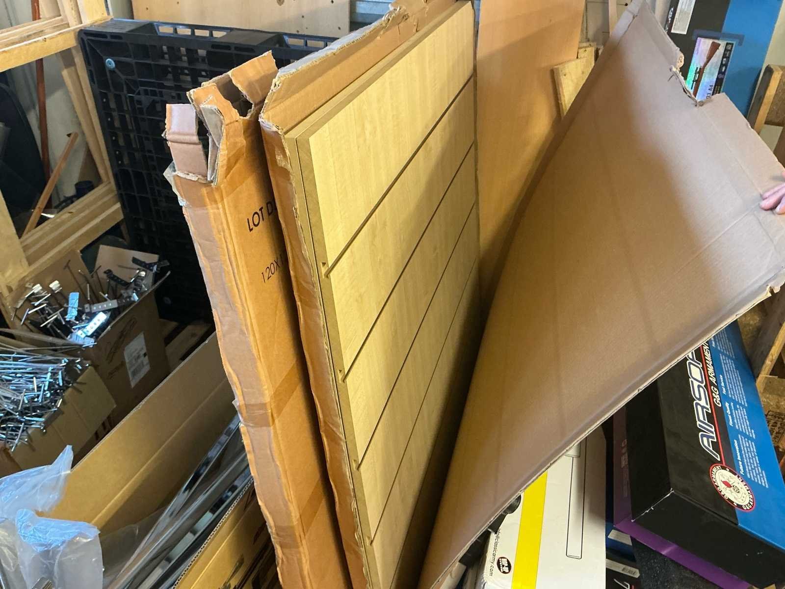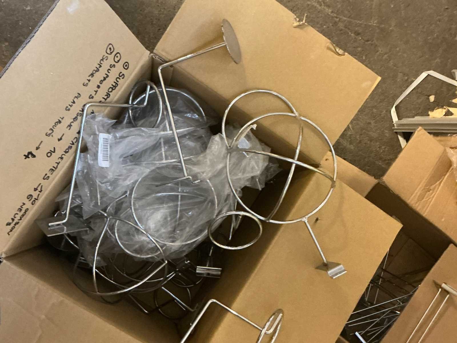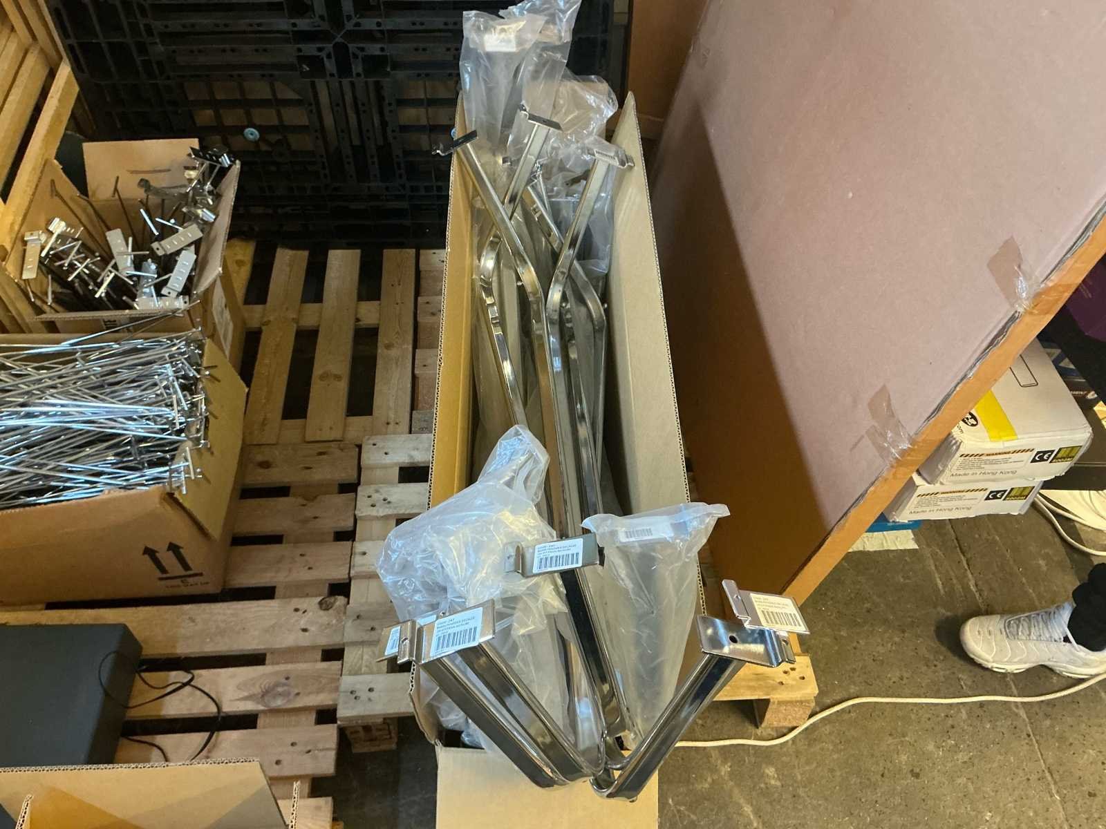Het lot bevat verschillende winkelinrichting artikelen: -4x Houten sleufwand in esdoorn kleur. L120 X H120 Dikte 18 MM -31x Versterkte aluminium inzet voor sleufwand. -16x Pet/cap steunen voor sleufwand. -20x Ronde schuine arm voor sleufwand L30 cm -7x Kledingsstang 110 x 30 cm. -10x Helm/hoedenhouder voor sleufwand. -39x Enkele draadhaak + T voor sleufwand L30 cm -27x Dubbele draadhaak voor sleufwand L30 cm. -18x Dubbele draadhaak voor sleufwand L20 cm. -12x Enkele draadhaak + T L20 cm. -16x Enkele draadhaak + T L10 cm. -164x Enkele draadhaak + T L10 cm. -4x Metalen schuine plank voor sleufwand. -1x Elektrische Kassalade. No Hout: true