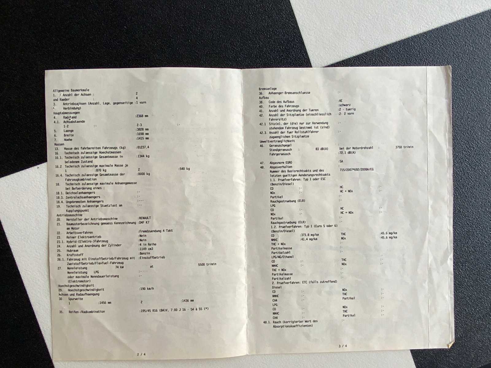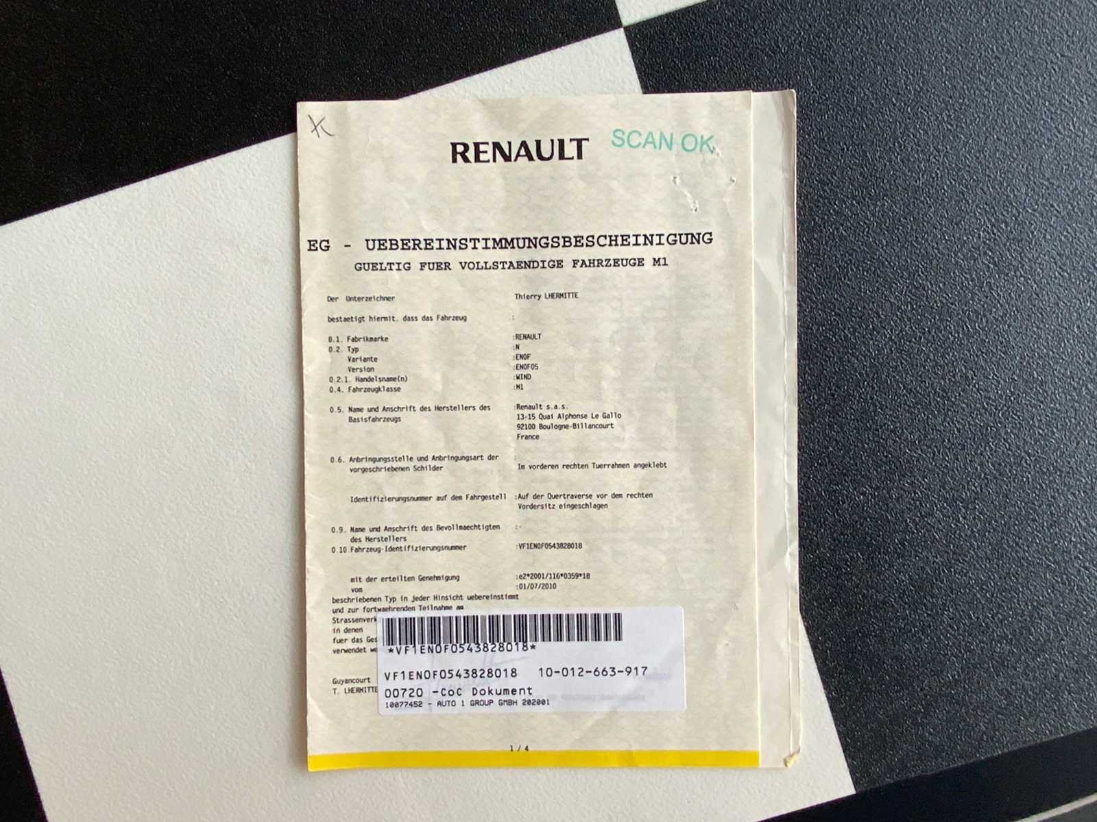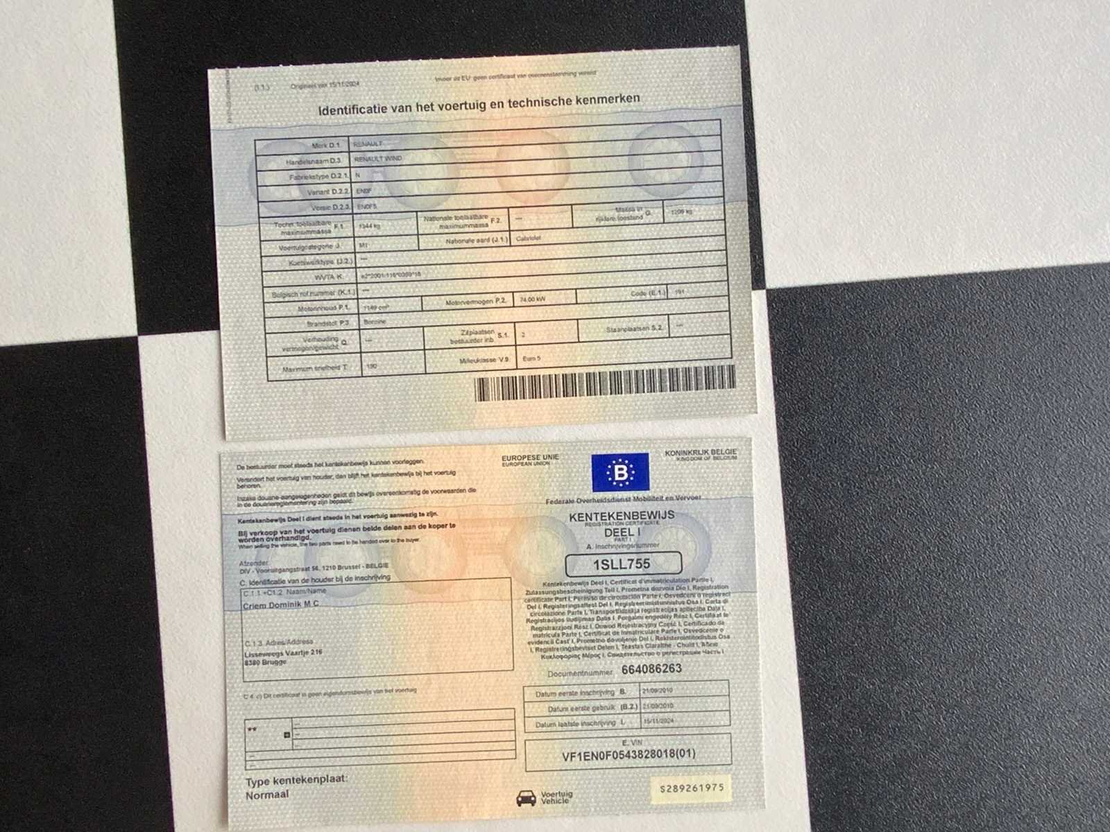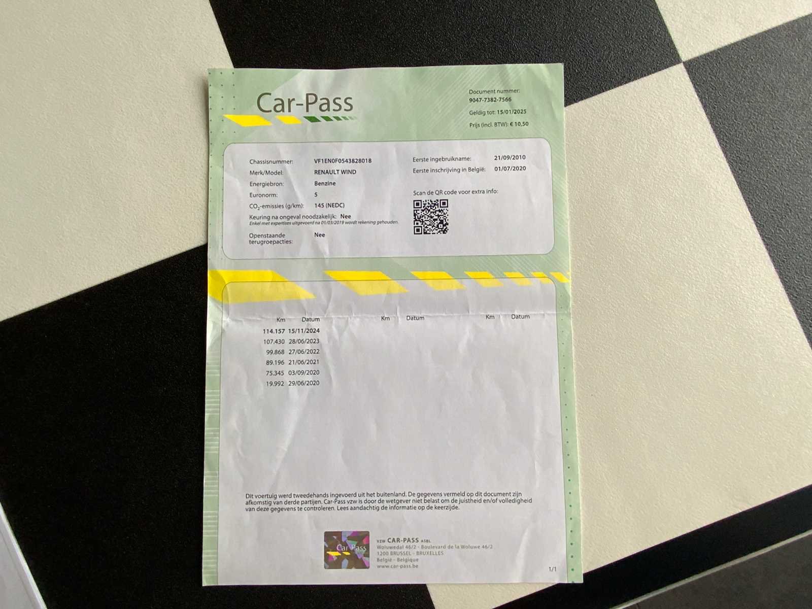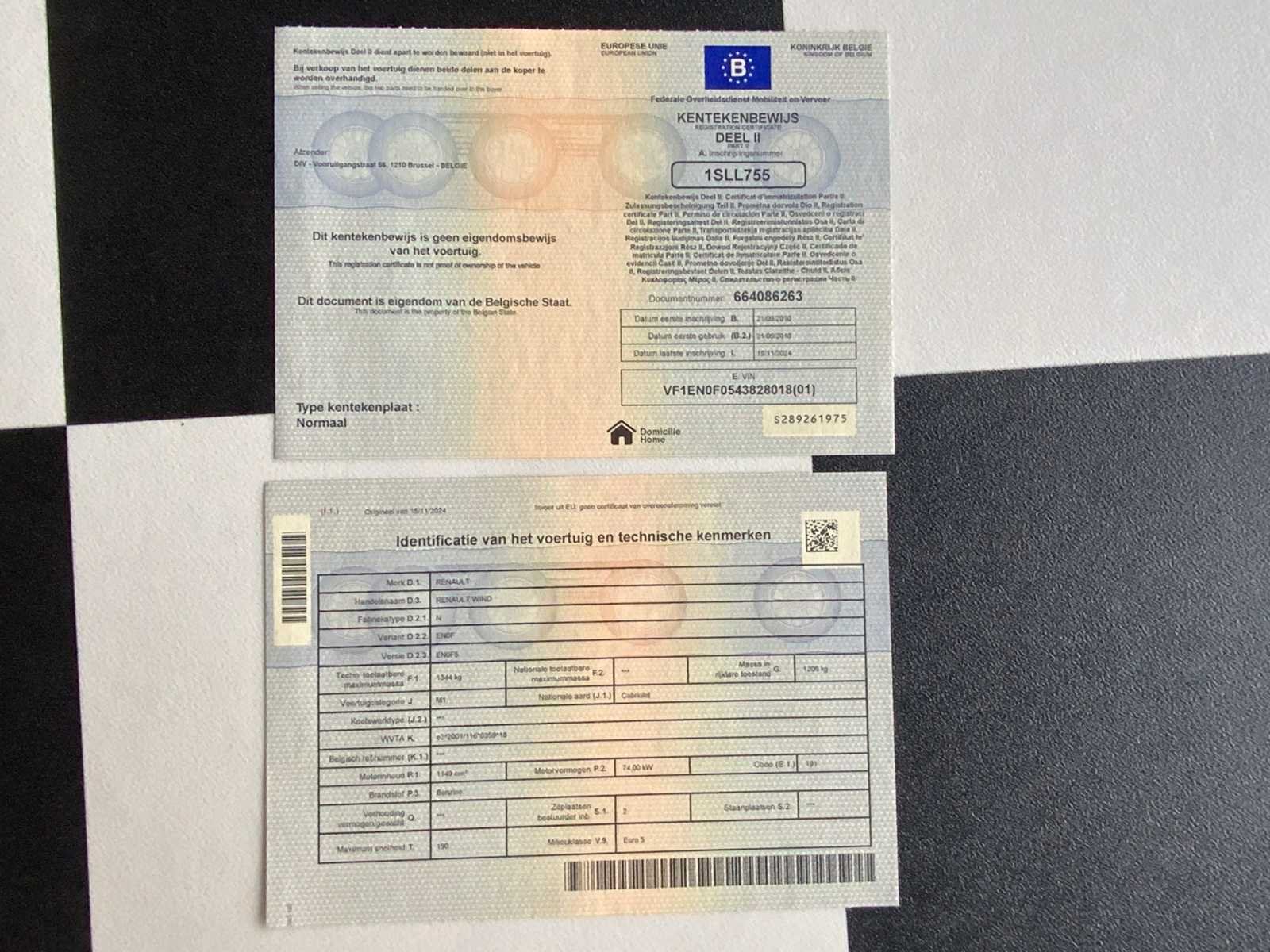 No Merk: Renault Model: Wind Type: N Bouwjaar: 2010 Afgelezen kilometerstand: 118039km Cilinderinhoud: 1149cc Vermogen (kW): 74kW Brandstof: Benzine Chassisnummer: VF1EN0F0543828018(01) Datum eerste toelating: 21/09/2010 Aantal zitplaatsen: 2 Kleur: zwart Transmissie: handgeschakeld Emissieklasse: Euro 5 Carrosserie: Cabriolet Nationaliteit documenten: Belgisch Carpass: true Vavato voert geen technische keuring uit.: true Inschrijvingsbewijs - deel 1 : aanwezig Inschrijvingsbewijs - deel 2: aanwezig