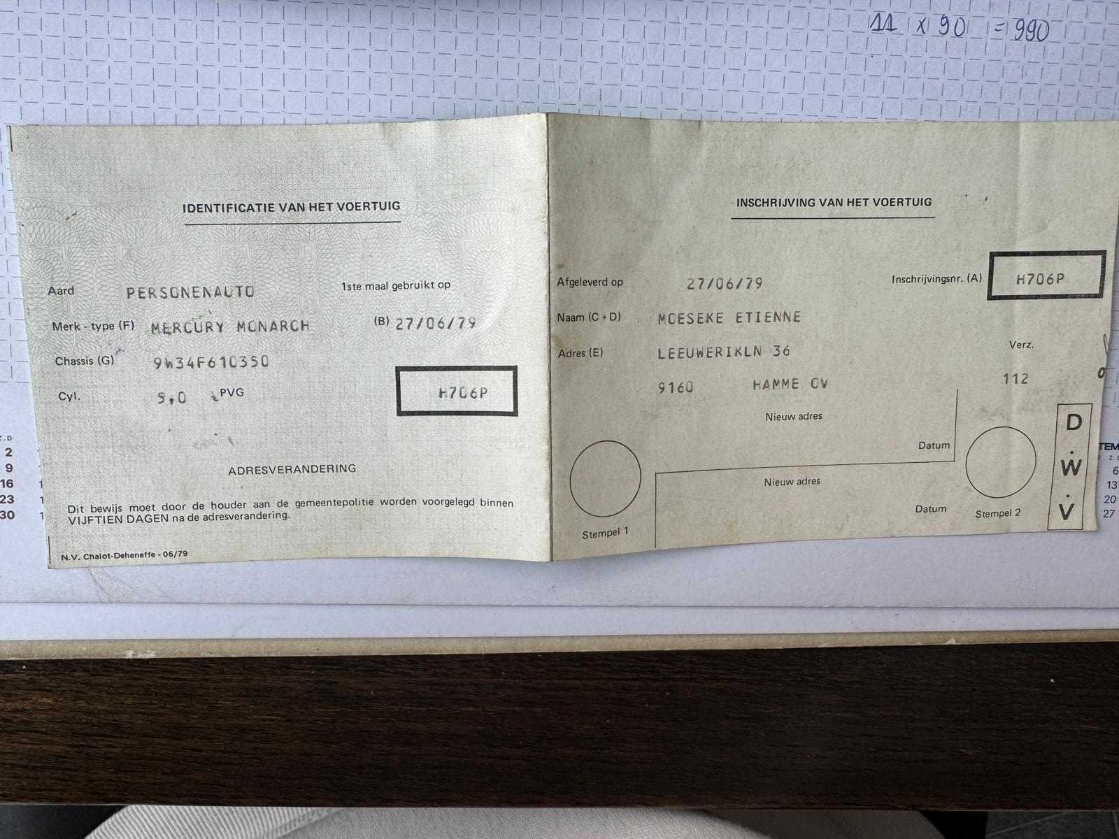 No Merk: Mercury Type: Monarch Bouwjaar: 1979 Afgelezen kilometerstand: 28571km Brandstof: benzine Chassisnummer: 9W34F610350 Datum eerste toelating: 27/06/1979 Aantal zitplaatsen: 5 Kleur: grijs Transmissie: automaat Nationaliteit documenten: Belgisch Gelijkvormigheidsattest aanwezig: true Vavato voert geen technische keuring uit.: true