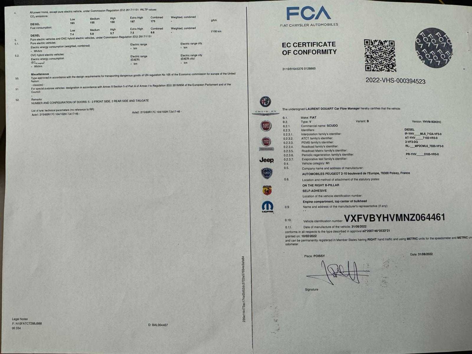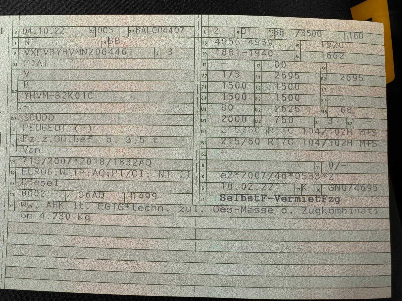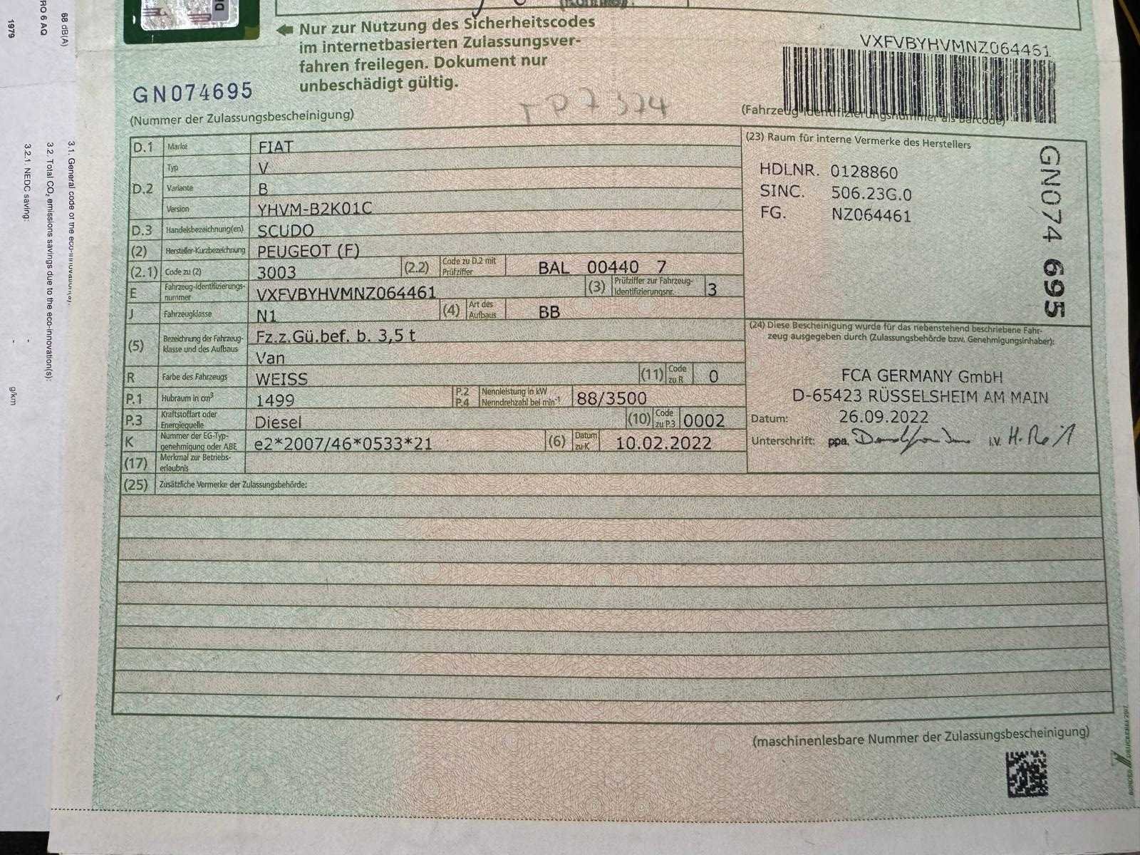 Fiat Scudo Bouwjaar 2022 KM 51 900 PK 120 Airco, navigatie, camera No Merk: Fiat Model: Scudo Type: V Bouwjaar: 2022 Cilinderinhoud: 1499cc Vermogen (kW): 85kW Brandstof: Diesel Chassisnummer: VXFVBYHVMNZ064461 Datum eerste toelating: 04/10/2022 Aantal zitplaatsen: 3 Kleur: Wit Transmissie: Handgeschakeld Nationaliteit documenten: Duits Gelijkvormigheidsattest aanwezig: true