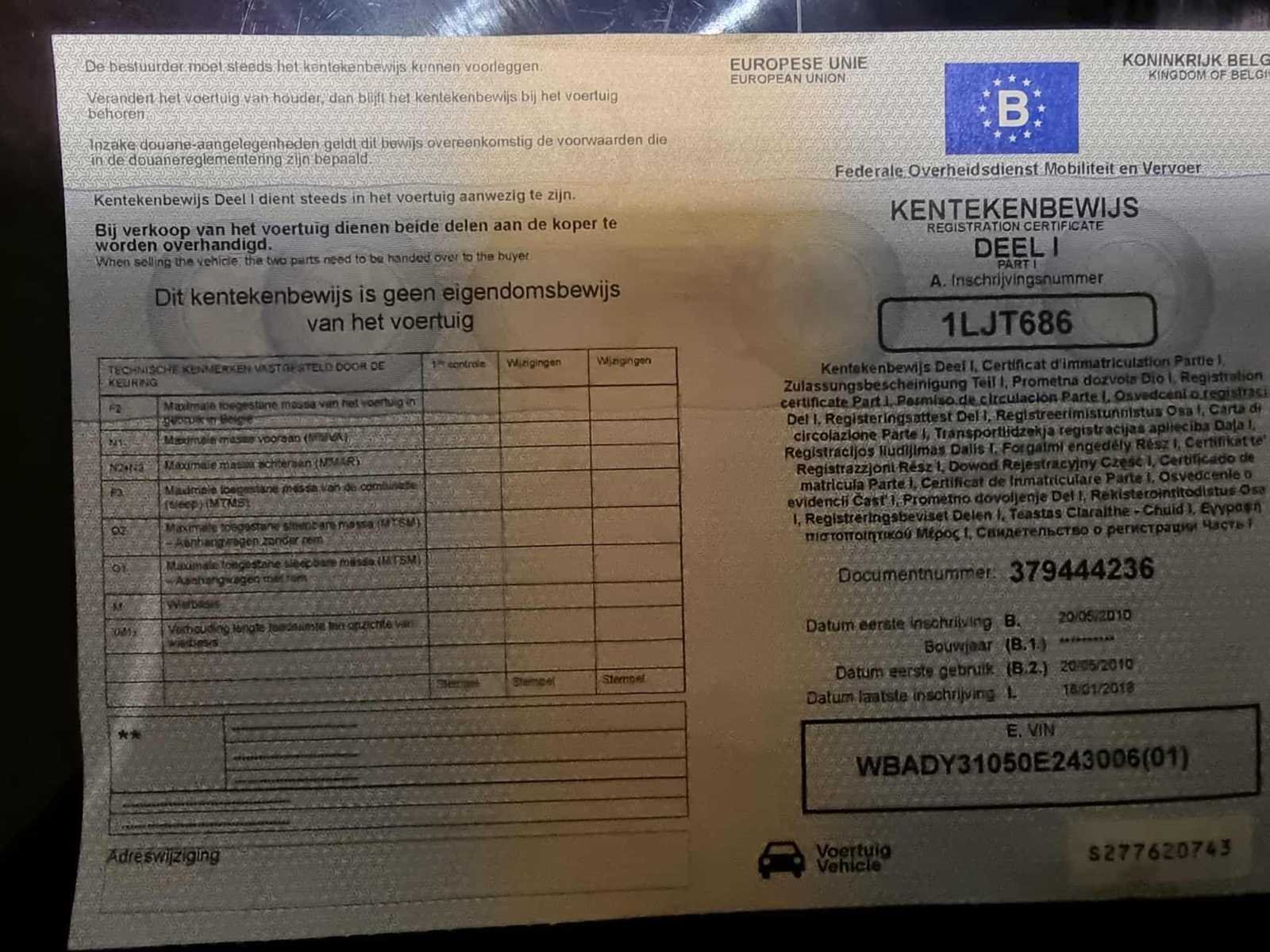 No Merk: BMW Model: DY31 Type: 3C Bouwjaar: 2010 Afgelezen kilometerstand: 124507km Cilinderinhoud: 1995cc Vermogen (kW): 120kW Brandstof: Diesel Chassisnummer: WBADY31050E243006 Datum eerste toelating: 20/05/2010 Aantal zitplaatsen: 4 Kleur: Zwart Transmissie: automaat Emissieklasse: Euro 5 Aantal deuren: 2 Carrosserie: Cabriolet Nationaliteit documenten: Belgisch Gelijkvormigheidsattest aanwezig: true Vavato voert geen technische keuring uit.: true Leder bekleed: true Inschrijvingsbewijs - deel 1 : Aanwezig Inschrijvingsbewijs - deel 2: aanwezig