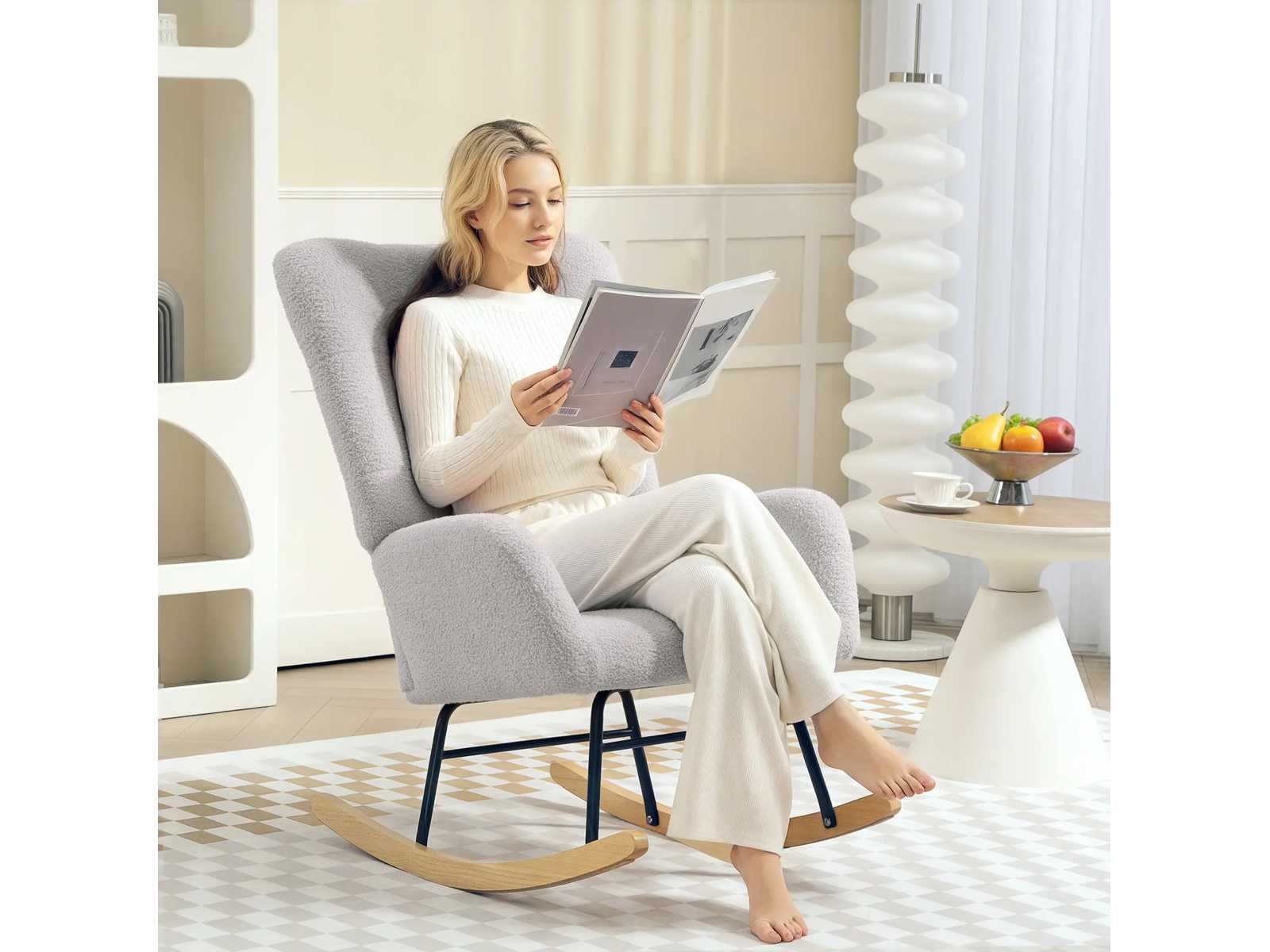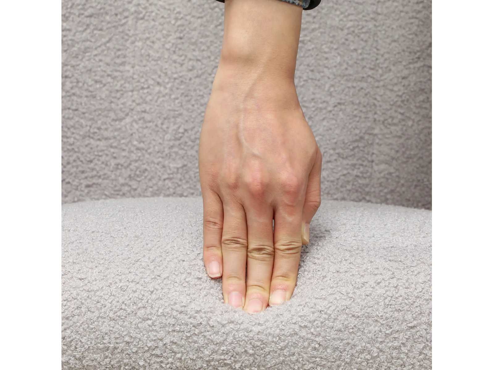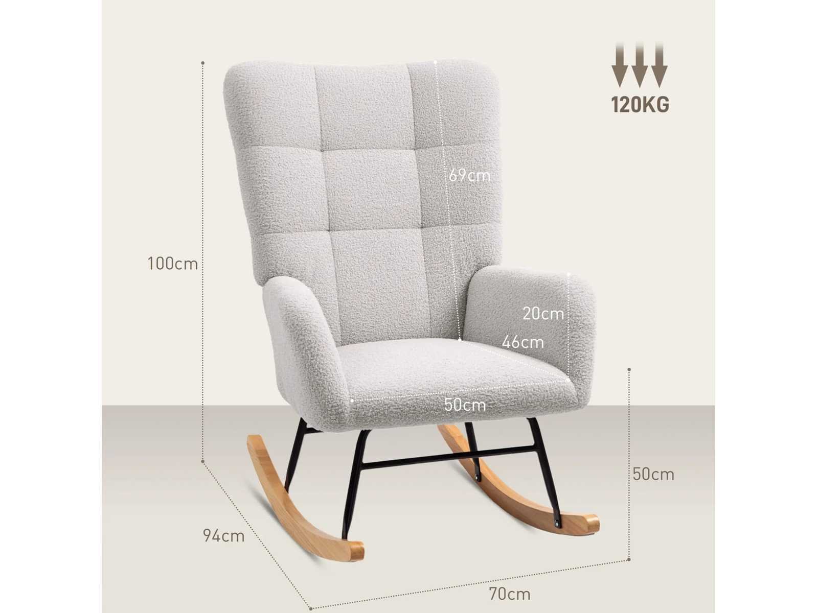 Specificaties: - Kleur: Lichtgrijs - Materialen: Teddy Velvet (polyester), schuim, metaal, rubberhout - Afmetingen: 70L x 94D x 100H cm - Zitmaat: 50B x 46D x 45-50H cm - Rugleuninggrootte: 65B x 69H cm - Rugleuningdikte: 10 cm - Maximaal ondersteund gewicht: 120 kg Non