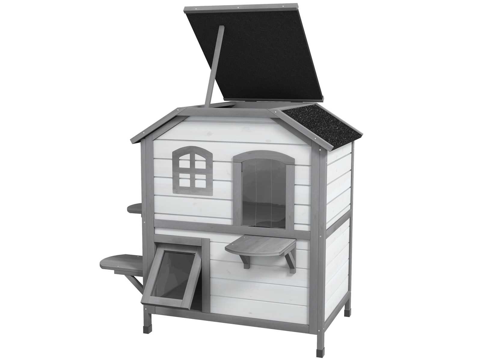Specificaties: - Materiaal: sparrenhout, asfalt dak - Totale afmetingen: L78 x W55,5 x H91 cm - Afmetingen (onderste dek): L72 x W48 x H31 cm - Afmetingen (bovendek): L72 x W48 x H43 cm - Afmetingen (bovendeur): W17 x H25 cm - Afmetingen (nooddeur): W20 x H25,4 cm - Afmetingen (zijdeur): W17 x H22 cm - Afmetingen (springplatform): L25 x W20 cm - Vloerhoogte: 8 cm - Netto gewicht: 16,2 kg - Laadcapaciteit: 30 kg Non