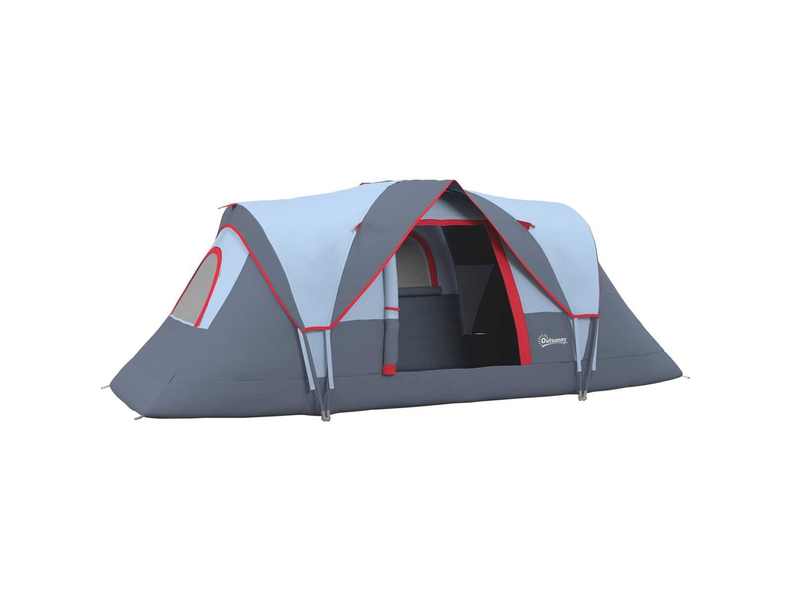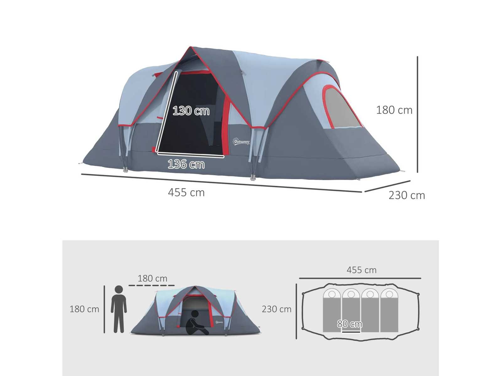 Specificaties: - Hoofdkleuren: lichtgrijs, donkergrijs, rood - Belangrijkste materialen: PE oxford, 210T polyester, glasvezel, staal -Zon. totaal: 4,55L x 2,2L x 1,8H m -Zon. deur: 1,36L x 1,3H m -Zon. Ramen: 125W x 70H cm/100W x 60H cm -Zon. opgevouwen: Ø 21 x 68L cm - Buisvormige glasvezel Ø: 9,5 mm Non