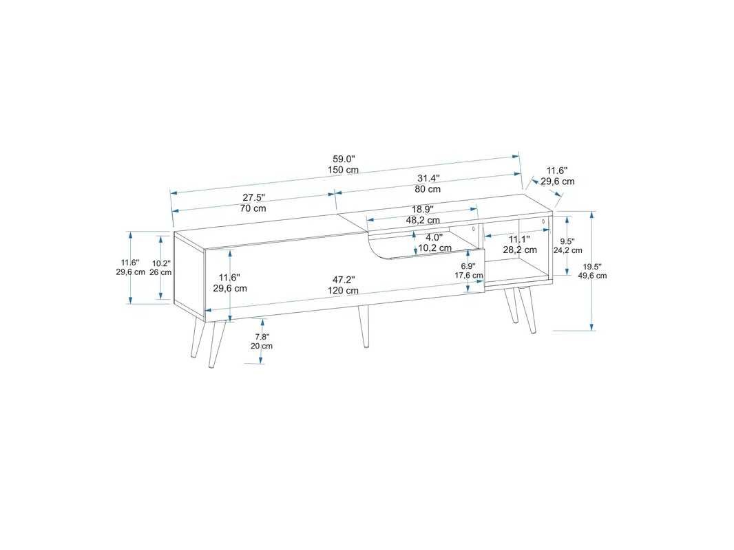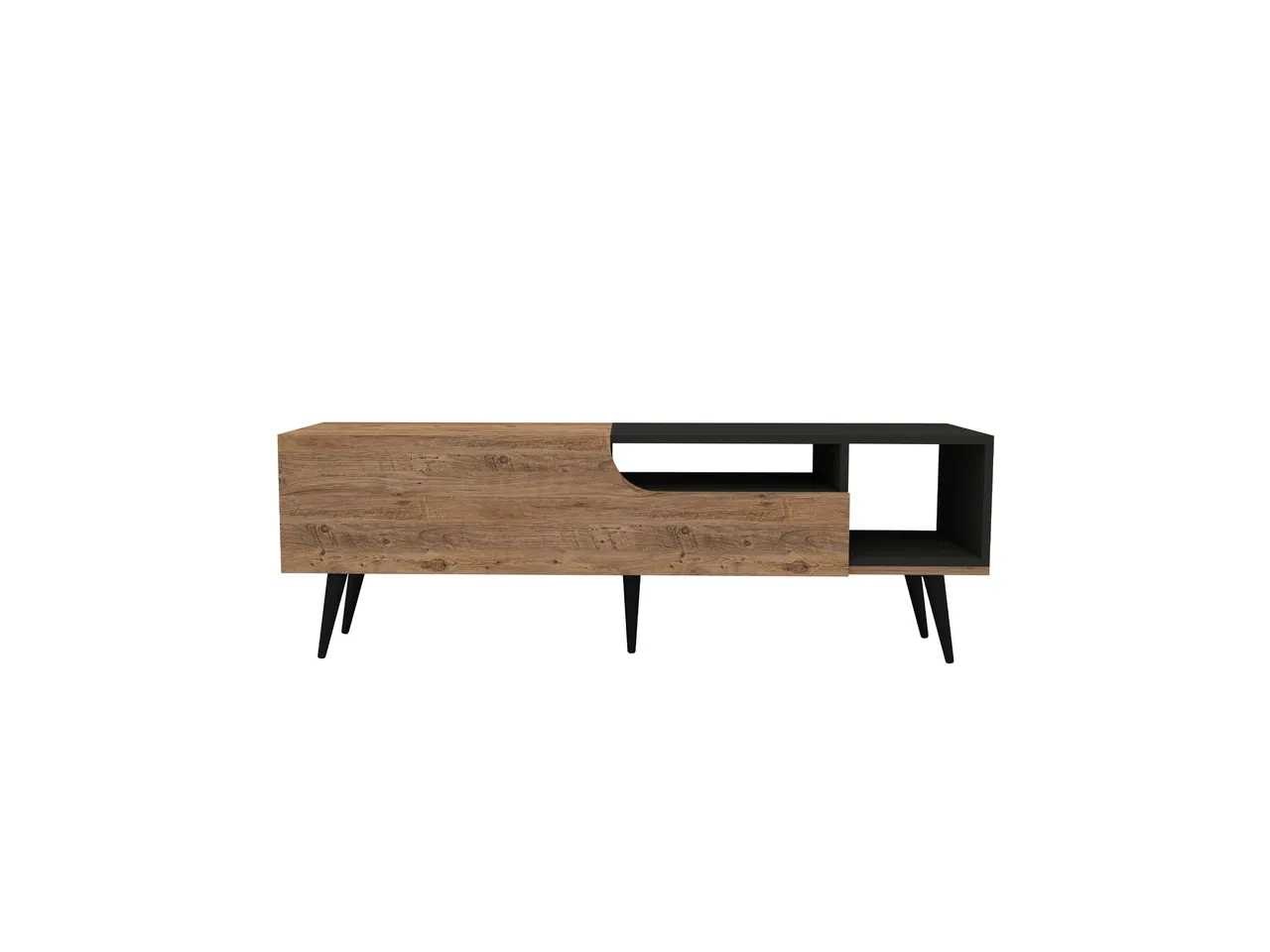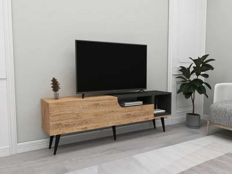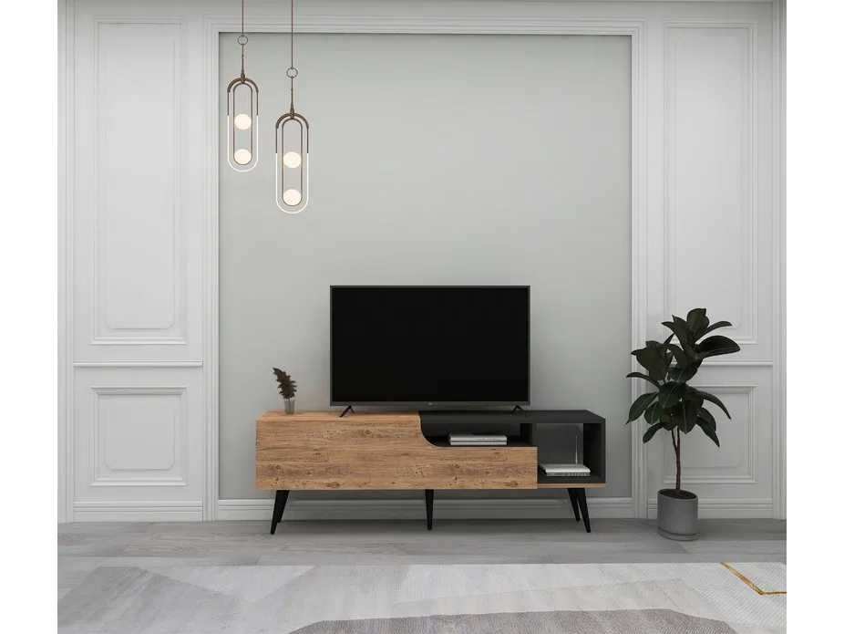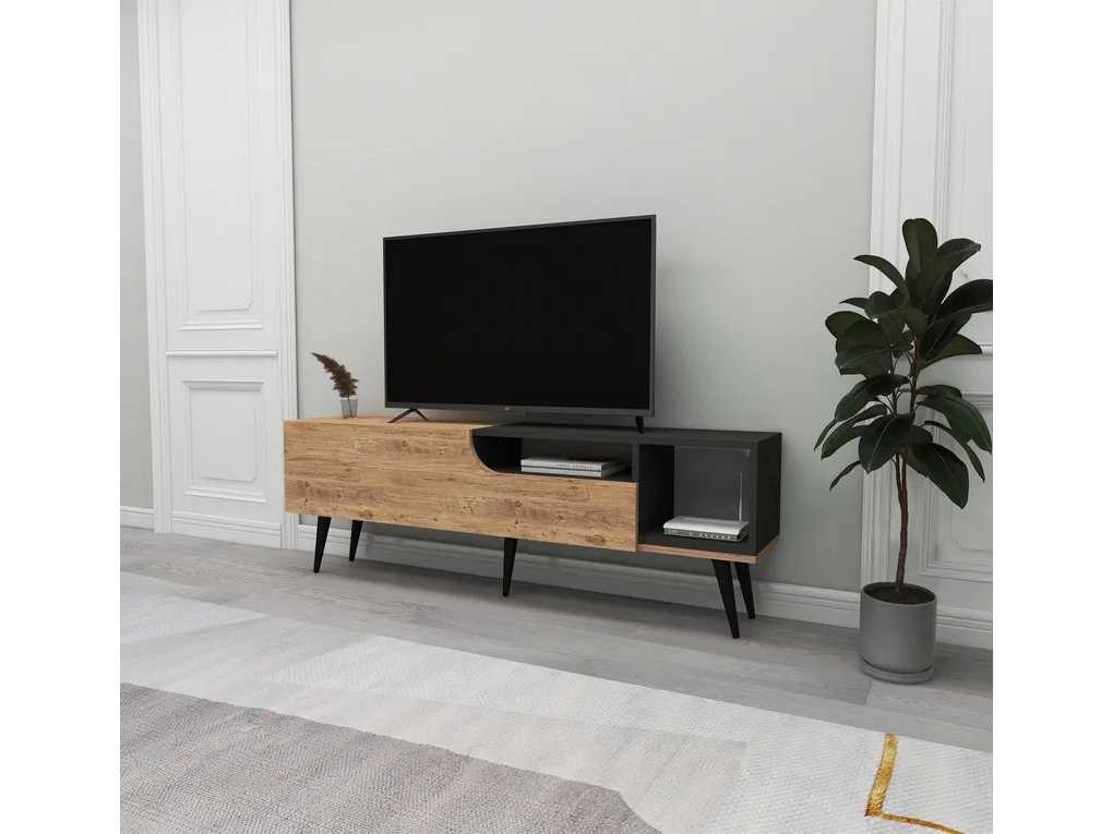 TV-meubel 150 cm breed x 49,6 cm hoog x 29,6 cm diep. Het heeft verschillende opslagruimtes. Gemaakt van 1,8 cm dik melaminespaanplaat. Anthraciet- en Atlantische dennenafwerking. De hoogte van de poten is 20 cm. Non