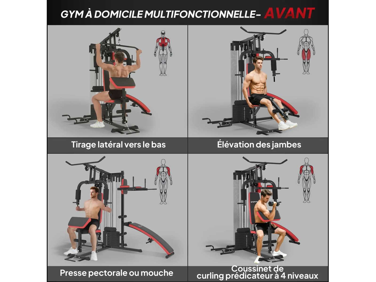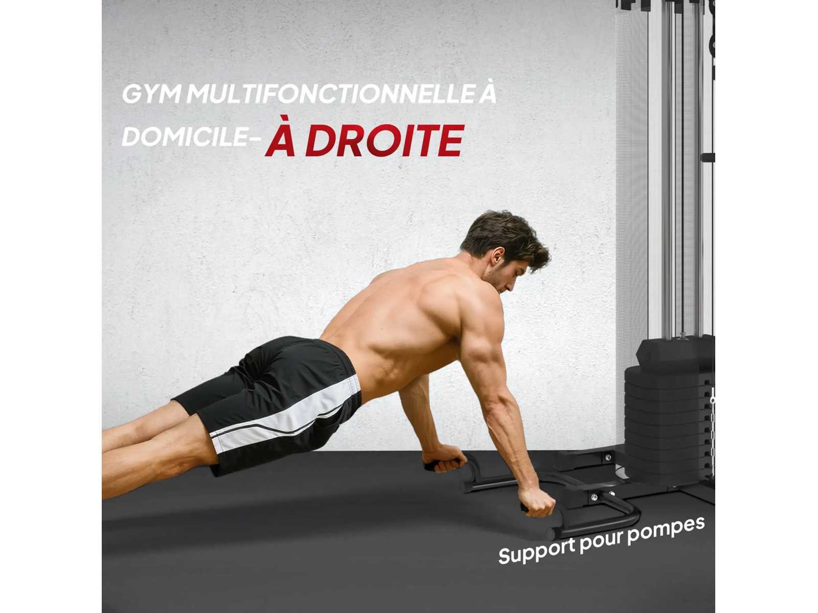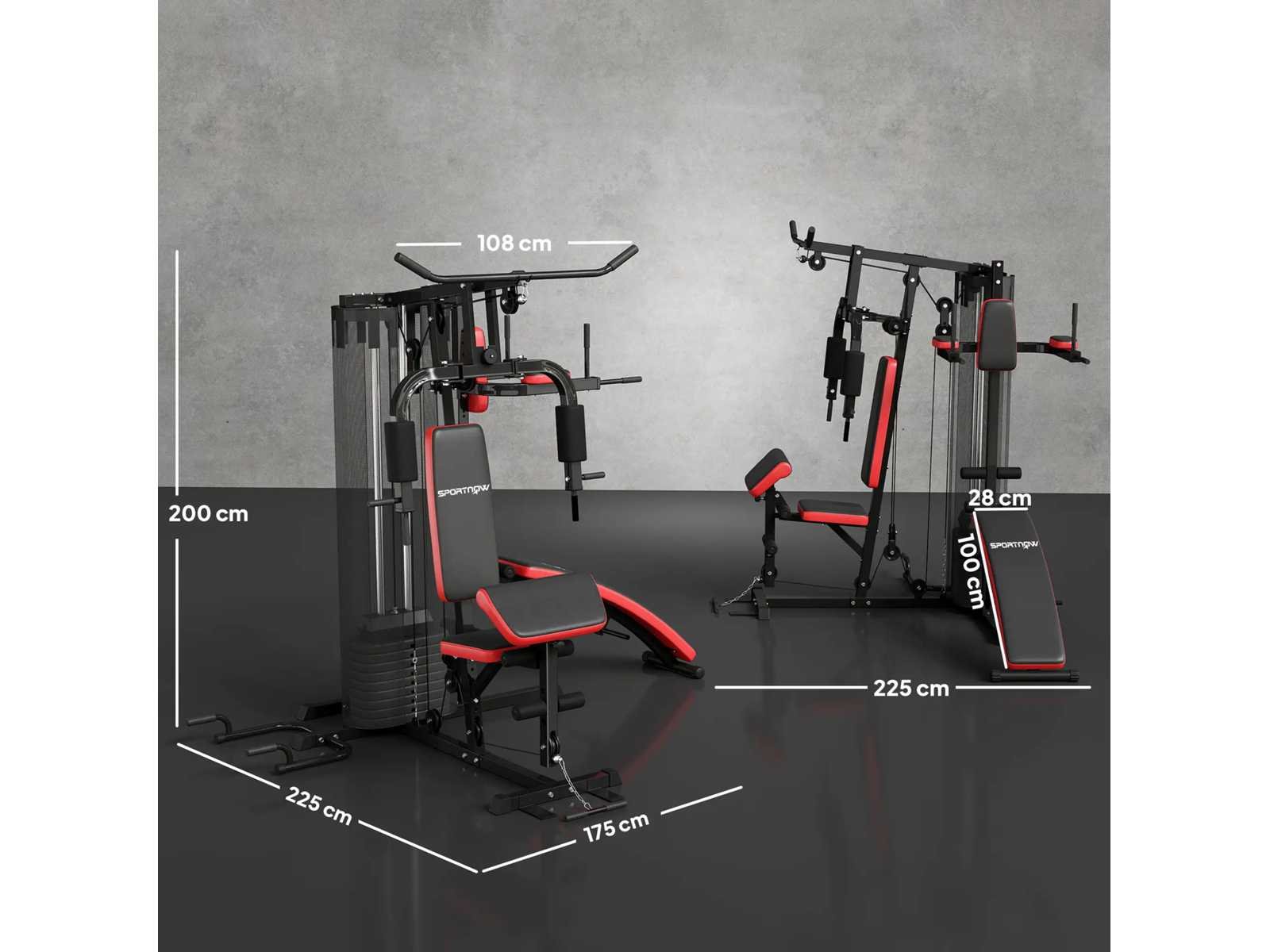 Specificaties: - Kleur: zwart, rood - Materialen: staal, PU -Zon. totaal: 225L x 175B x 200H cm -Zon. Stoel: 35L x 33B x 56H cm -Zon. Rugleuning: 70L x 28W cm (voor), 36L x 20W cm (rechts) -Zon. lessenaarkussen: 50L x 26L x 93-108H cm - Maximale trekafstand: 120 cm - Rechte bank: 100L x 28L x 52-68H cm -Zon. elleboogbeschermer: 25L x 12L x 130-170H cm - Totaal gewichttegengewicht: 65 kg - Aanbevolen maximale belasting: 110 kg Non