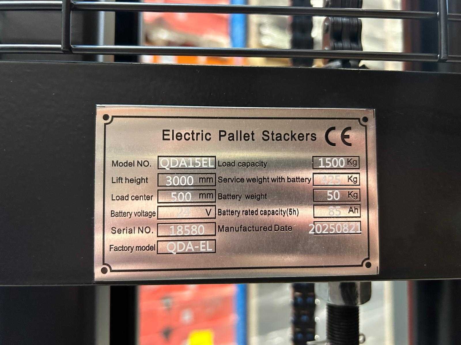 Ongebruikt; Totale hoogte 3035mm; drive motor 0,75KW; lift motor 2,2 KW; 24V; 85H battery; 5 werkuur per laadbeurt; 7861 Nee Merk: RTE Type: 7861 Bouwjaar: 2025 Hefvermogen: 1500kg Hefhoogte: 3000mm Lepellengte: 1150mm Afgelezen urenstand: 0 Eigen gewicht: 475kg Minimale doorrijhoogte: 2090mm Totale afmeting L: 1690mm Totale afmeting Breedte: 780mm Totale afmeting Hoogte: 2090mm Meerij stapelaar: true Accu lader: true