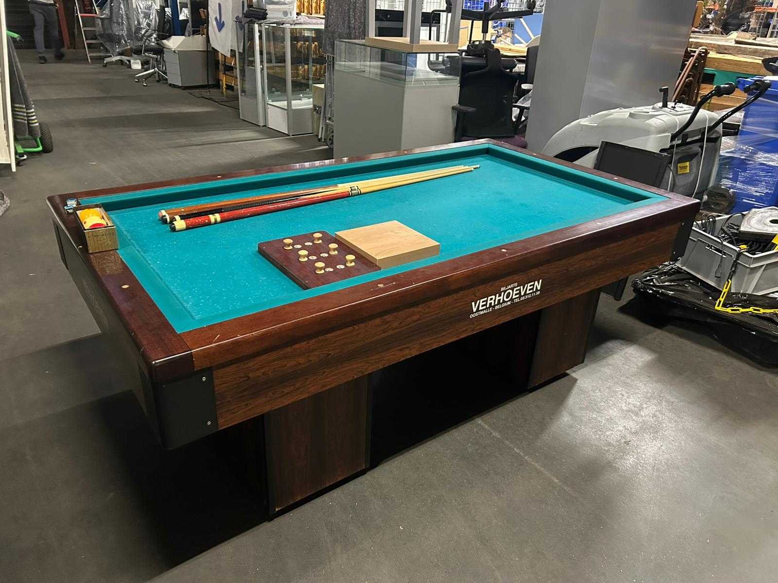 Algemene informatie Merk: Verhoeven Herkomst: Oostmalle, België Categorie: Sport & ontspanning / Horeca-inrichting Technische specificaties Speelveld: ca. 200 × 100 cm (standaard carambolemaat) Materiaal blad: Leisteen, bekleed met vilt (blauwgroen) Materiaal kast en poten: Houtfineer met donkere mahonie-look Poten: 2 massieve sokkelpoten Verwarming: Aanwezig Accessoires inbegrepen: 2 keus 1 set caramboleballen (rood, geel, wit met stip) Scorebord / telstenen Nee Merk: VERHOEVEN Kleur: Blauw / Donker hout Gewicht: 95 Lengte: 207 Breedte: 116 Hoogte: 78 Materiaal: Hout