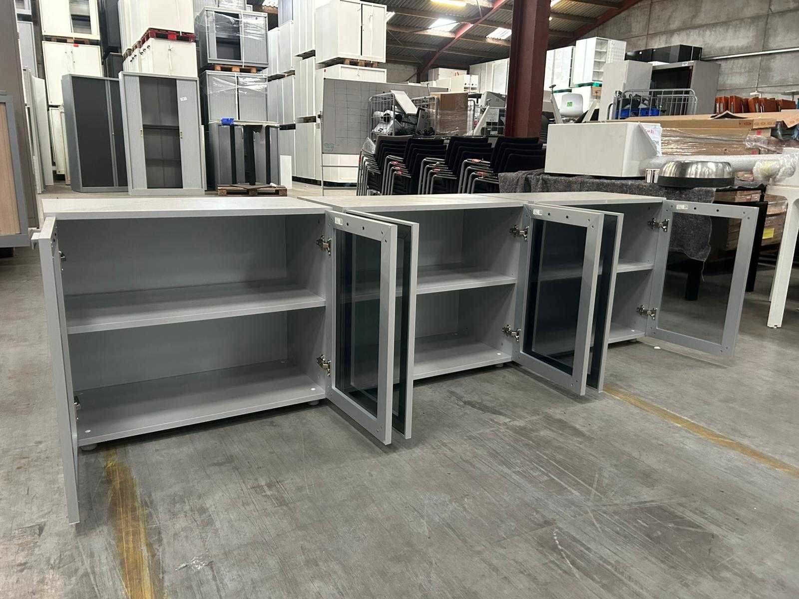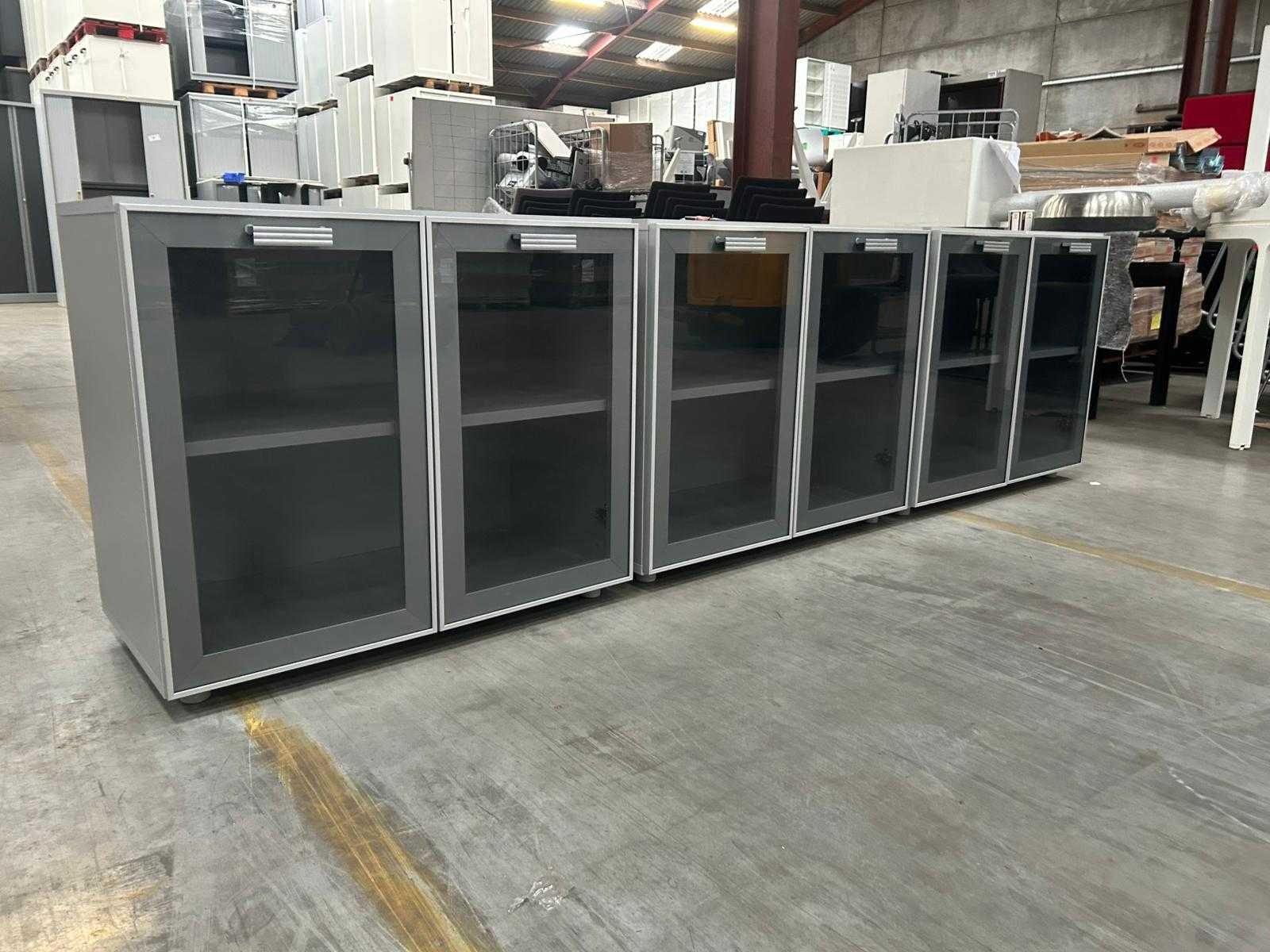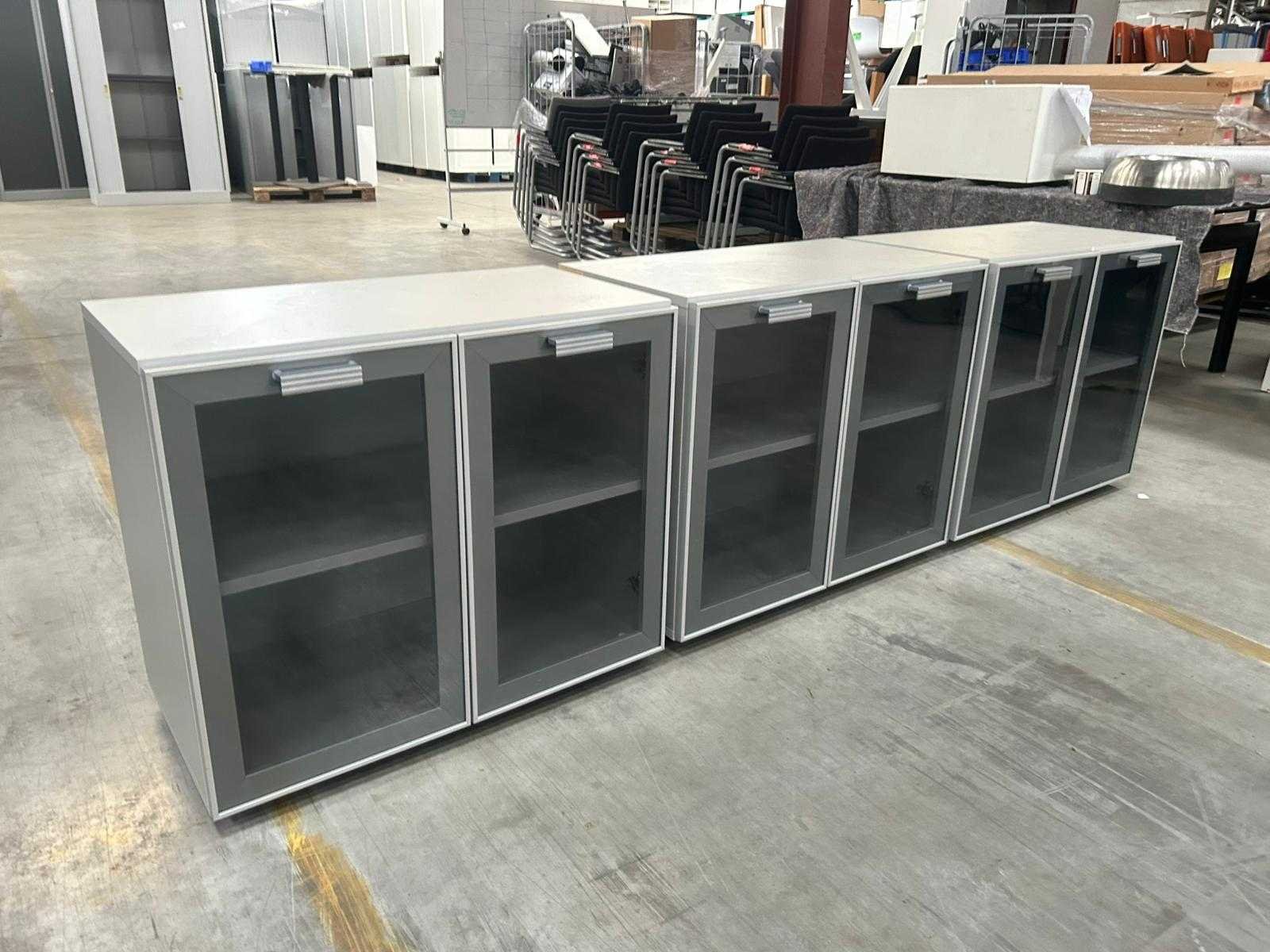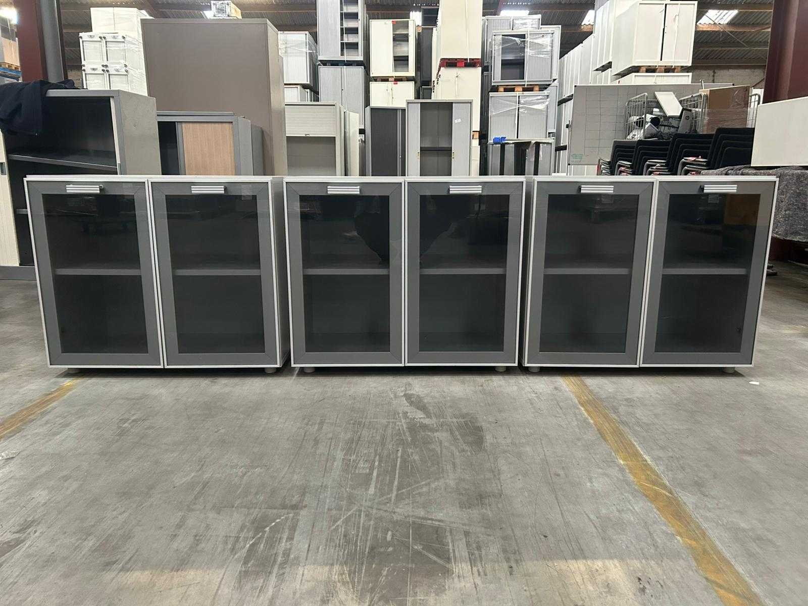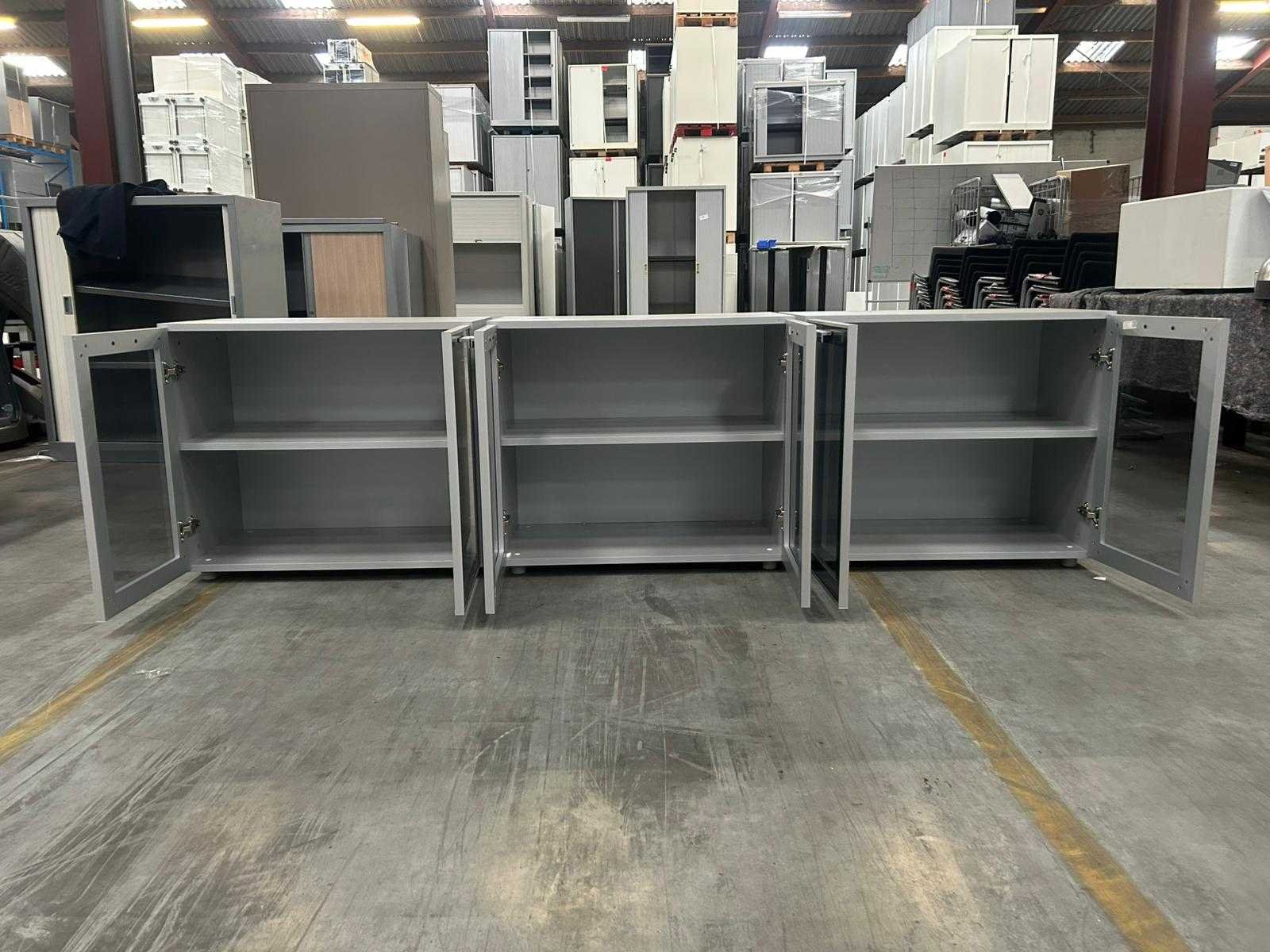 Kenmerk Omschrijving Materiaal frame Aluminium profielconstructie Deuren Glazen draaideuren Glas Getint veiligheidsglas (donkergrijs/transparant) Aantal deuren per kast 2 Legborden Verstelbare legborden 1 x per kast Gebruik Presentatie, archief of opbergruimte Gewicht per kast +-30 kg Staat Goede gebruikte staat. Glas volledig intact, geen barsten of grote krassen. Frames vertonen lichte gebruikssporen op hoeken en handgrepen. Deuren openen soepel; scharnieren en grepen in goede conditie. Nee Product type: lage vitrinekast Kleur: grijs Gewicht: 40kg Breedte: 80cm Hoogte: 69cm Diepte: 43cm