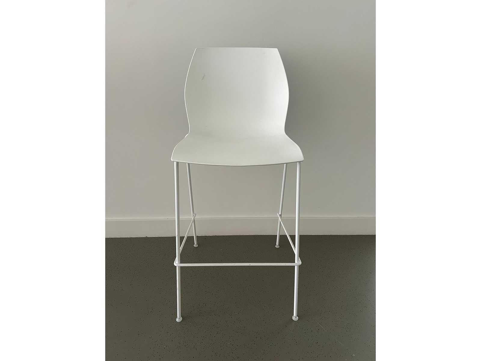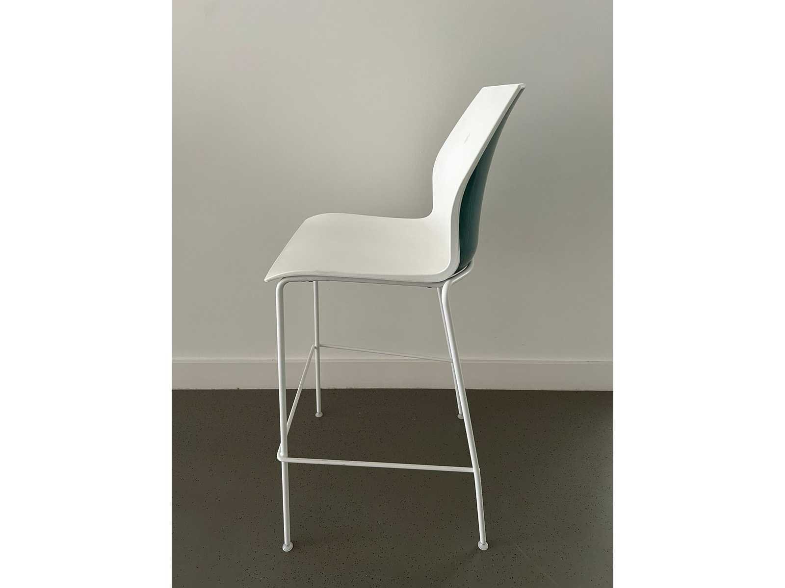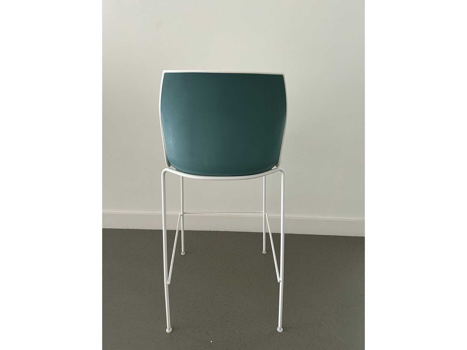 Barkruk Kastel Kalea , stapelbaar, witte zitvlak met turqoise rugleuning, wit metalen o nderstel, in goede staat Nee Merk: KASTEL Model: Kalea Product type: Barkruk Kleur: wit/groen Gewicht: 20kg Breedte: 52cm Hoogte: 107cm Zithoogte: 72cm Materiaal: kunststof