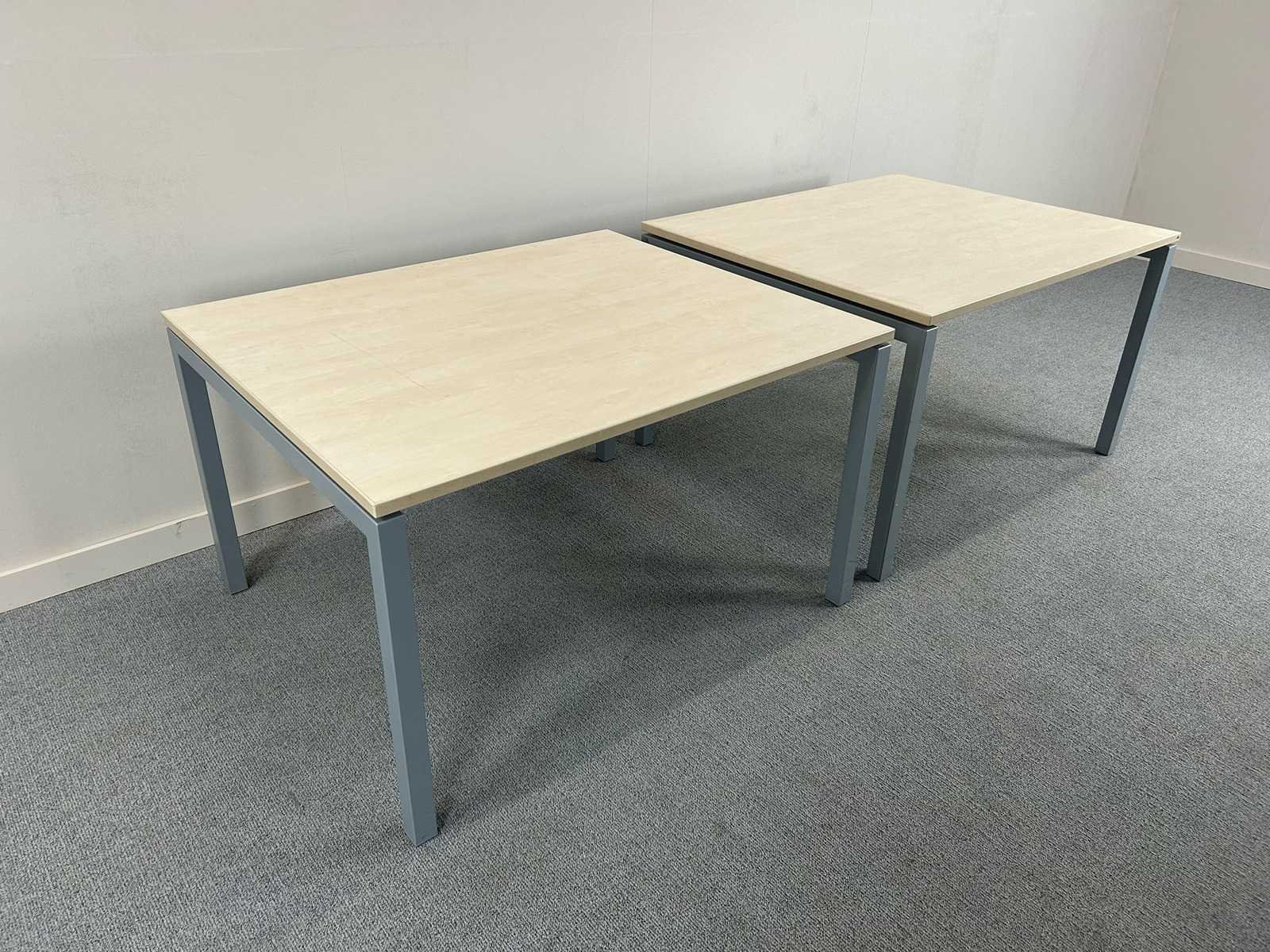 Een set van 2 tafels met metalen vierpoot, blad in licht hout. Lichte gebruikssporen, kan variëren per item. No Type: Tafel Kleur: Creme Gewicht: 25kg Lengte: 100cm Breedte: 120cm Hoogte: 70cm