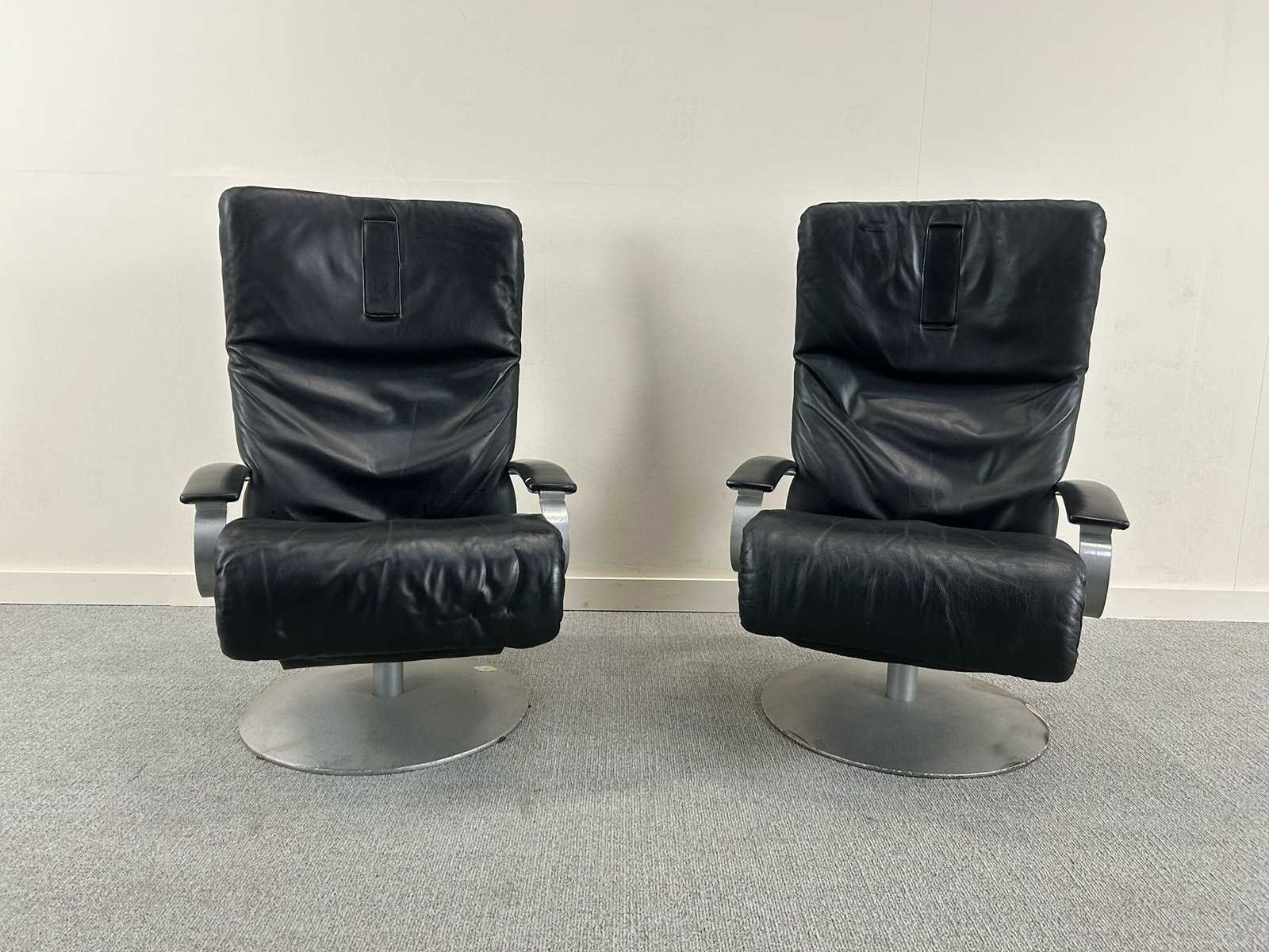 Een set van 2 directiestoelen met metalen vloerplaat in zwarte leder. Item komt met uitklapbare voetsteun en instelbare rugleuning.Staat kan varëren, lichte gebruikssporen No Type: Directiestoel Kleur: Zwart Materiaal: Leder Gewicht: 65kg