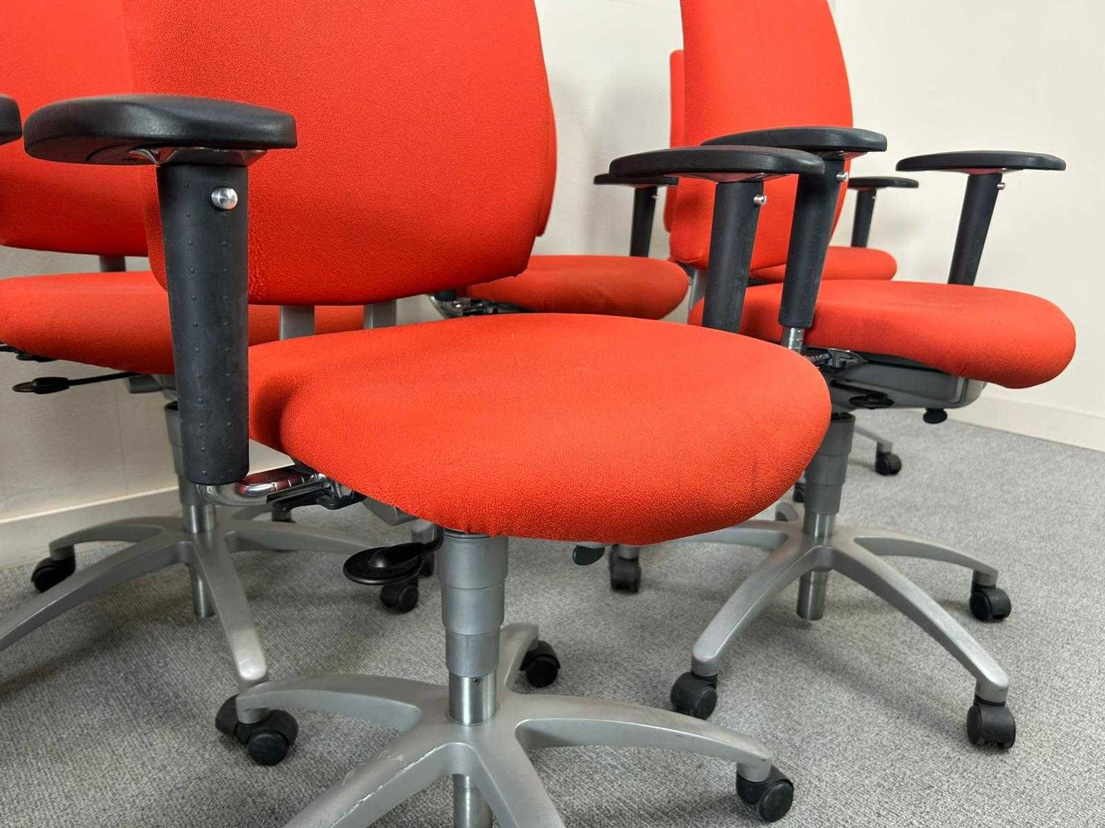 Set van 10 Drabert bureastoelen in het rood op metalen voetkruis met wielen. Verstelbare zithoogte en armleuningingen, Staat kan variëren per item. Nee Merk: DRABERT Type: Entrada Kleur: Rood Gewicht: 90kg