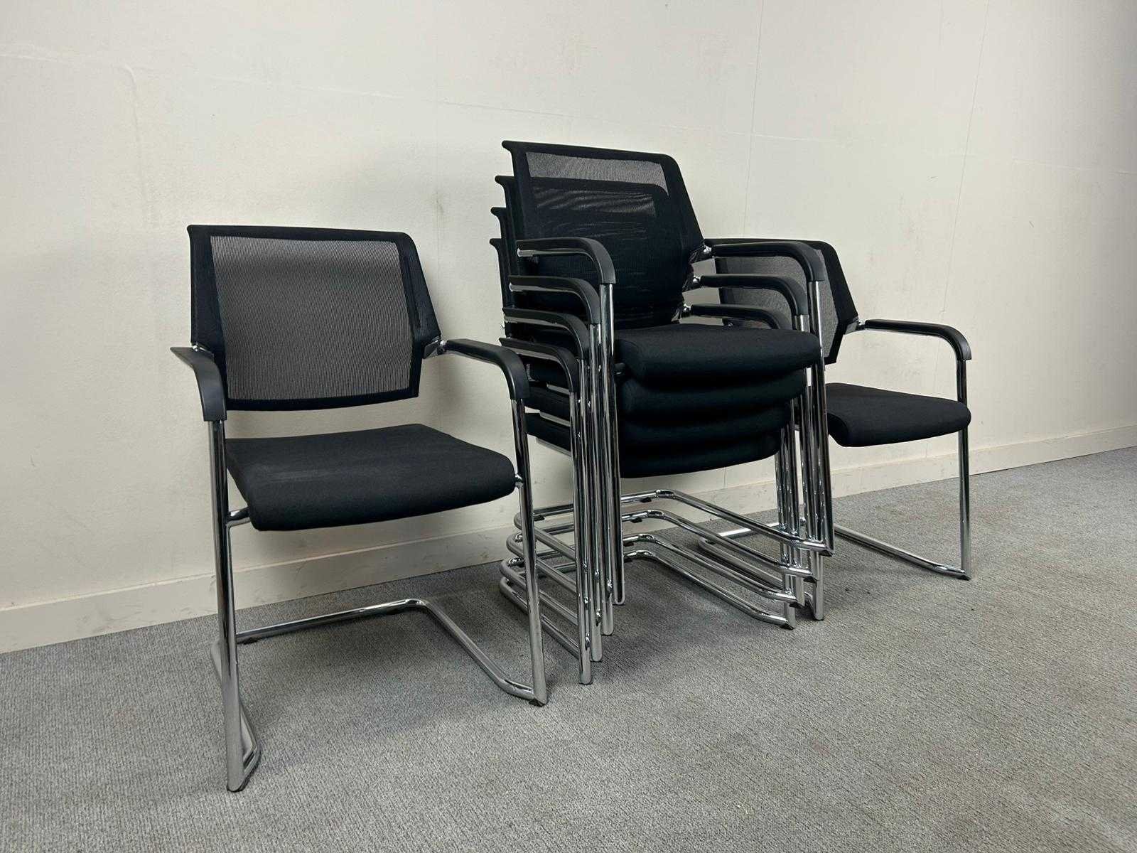 Set van 6 Haworth stapelbare bezoekersstoelen zwarte stof met mesh rugleuningen. Met gebruikssporen, staat kan variëren per item. Nee Merk: HAWORTH Kleur: Zwart Materiaal: Stof / Mesh