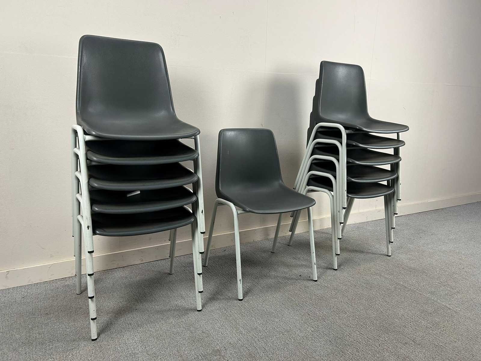 Set van 11 O.Winkler Olympia stapelbare kantinestoelen uitgevoerd in grijs kunststof met witte metalen poten. Nee Merk: O.WINKLER Model: Olympia Product type: Kantinestoel Stapelbaar: true Kleur: Grijs Gewicht: 100kg