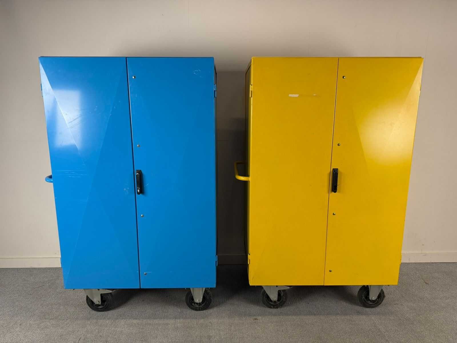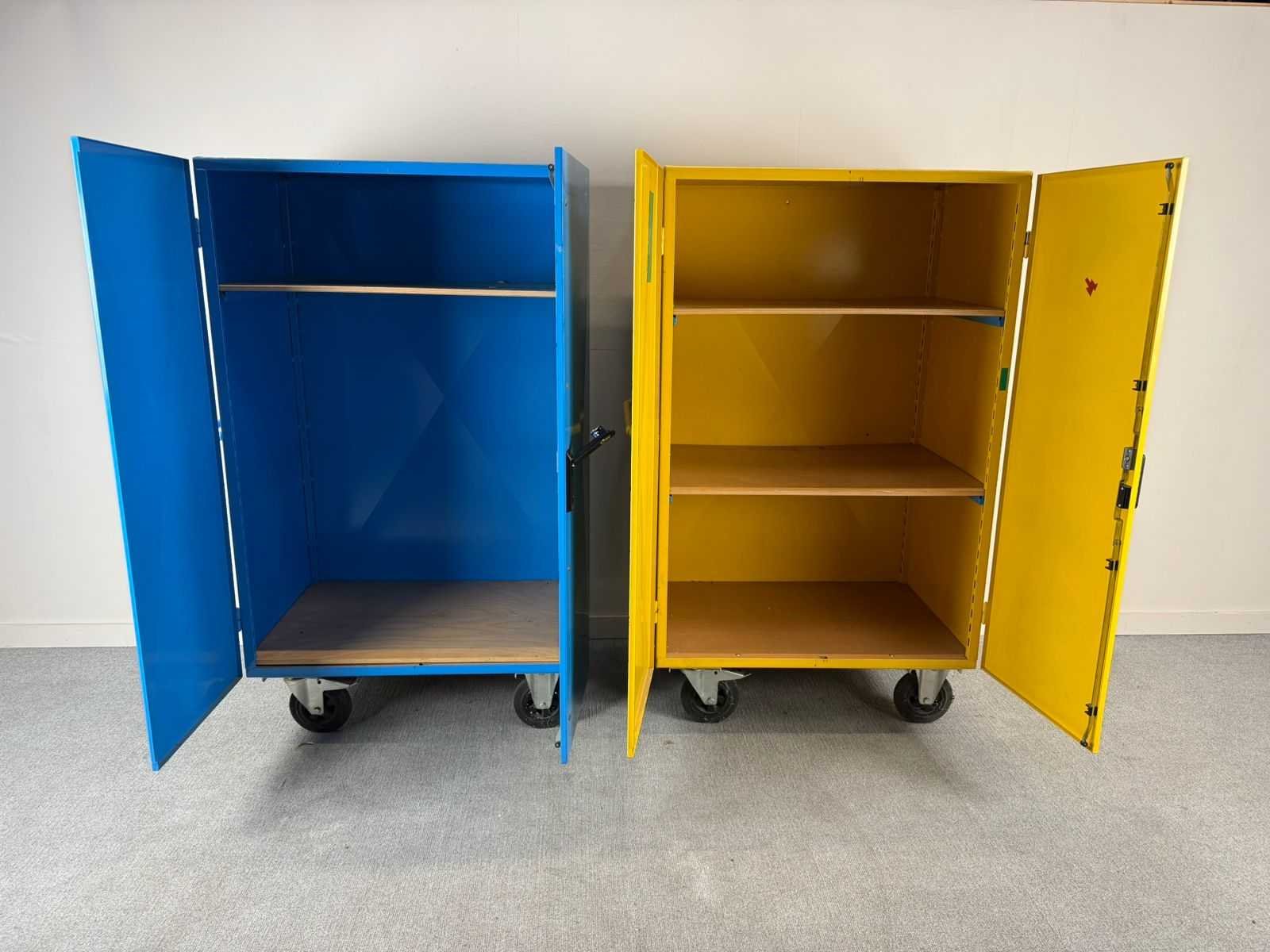 Nee Model: Verrijdbare kasten Kleur: geel/blauw Gewicht: 100kg Breedte: 105cm Hoogte: 178cm Diepte: 72cm Materiaal: metaal