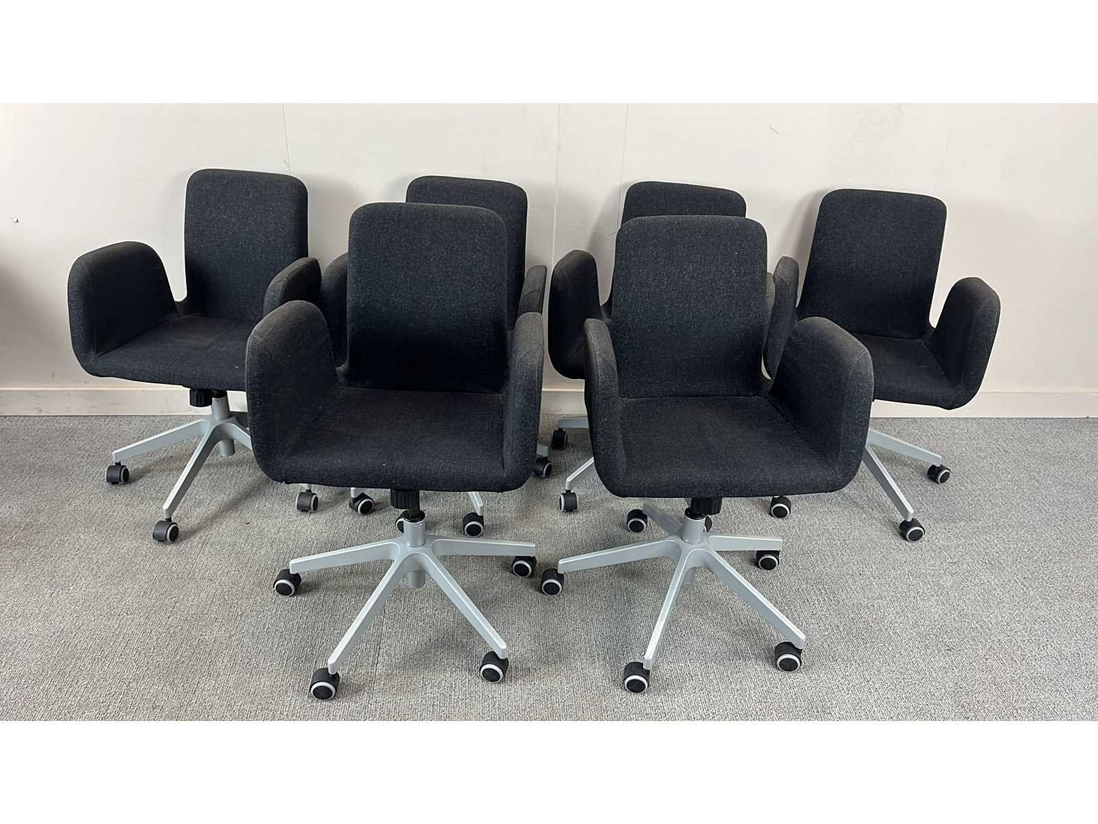 Set van 6 antraciet stoffen clubstoelen op metalen voetkruis met wielen, in hoogte verstelbaar en kantelbaar.In goede staat, kan variëren per item Nee Type: Clubstoel Model: Kleur: Grijs Materiaal: Stof Gewicht: 75kg