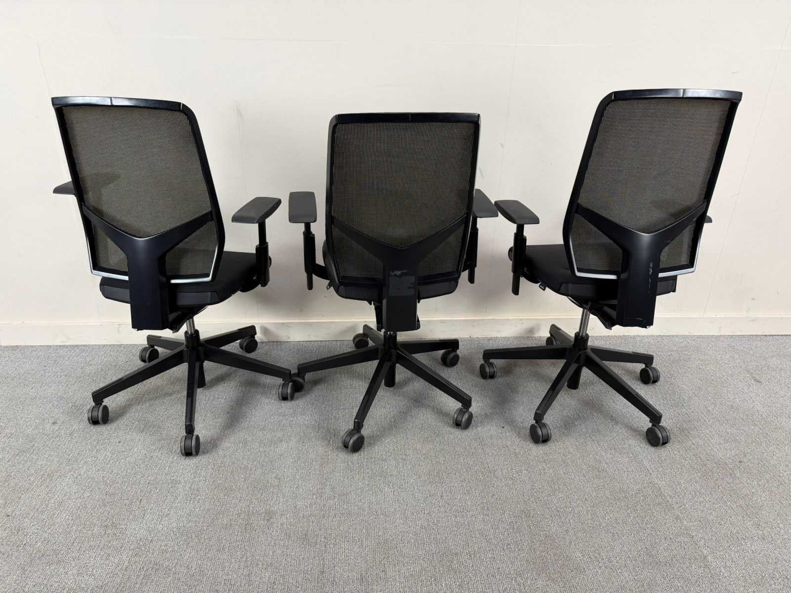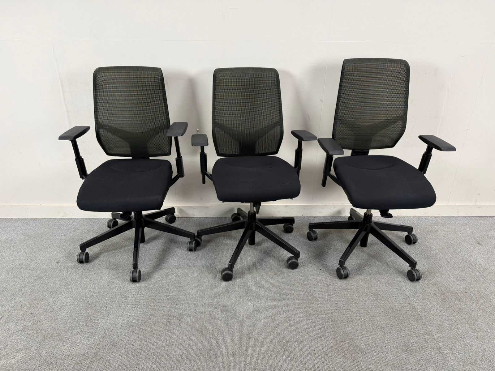 Trio van verstelbare Giroflex bureastoelen in het zwart met meshe rug. In goede staat Nee Merk: GIROFLEX Kleur: Zwart Gewicht: 55kg Materiaal: Stof / Mesh