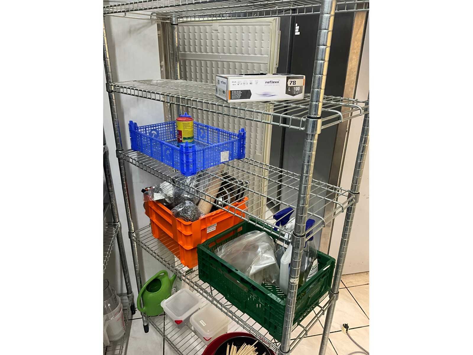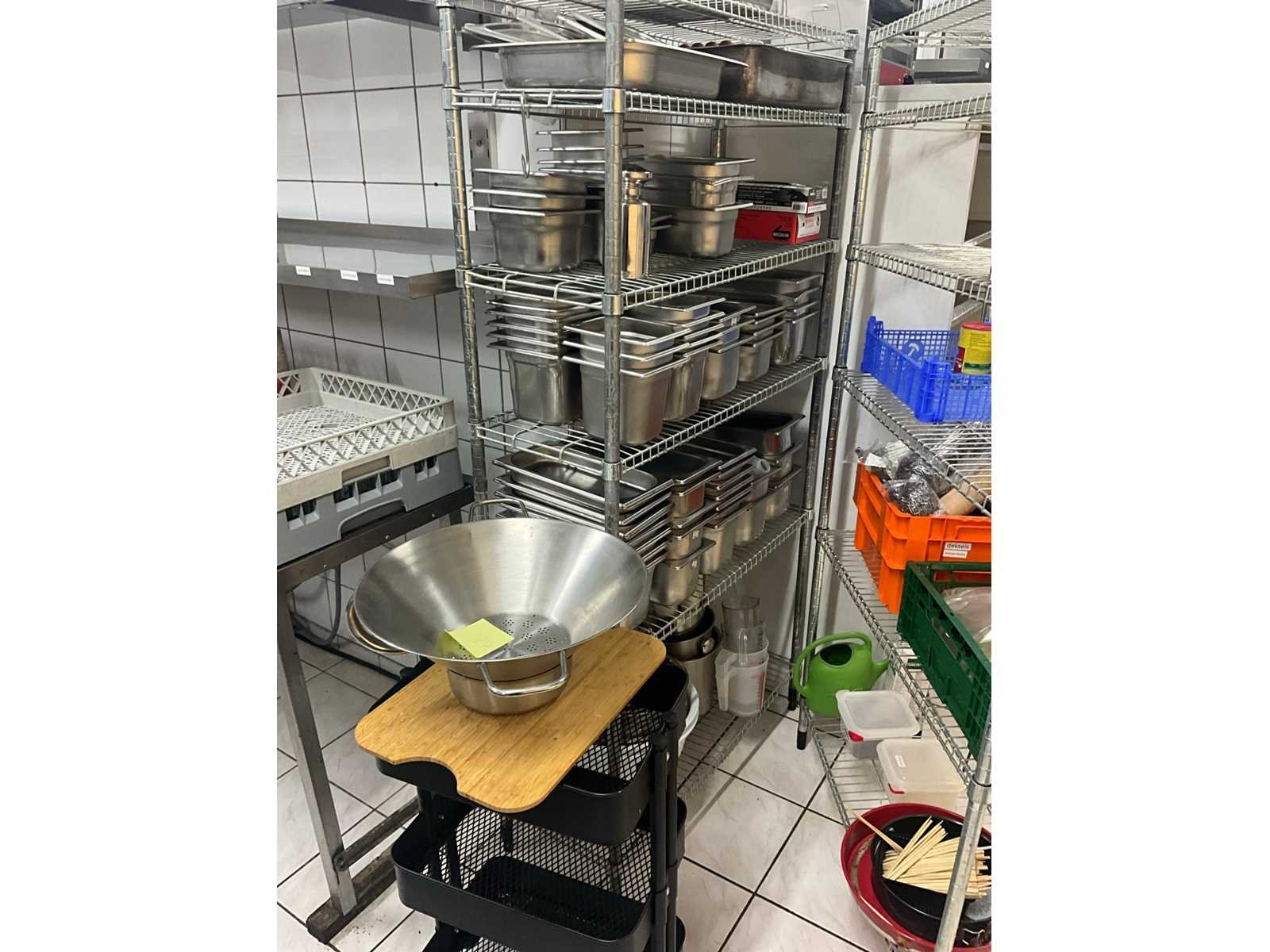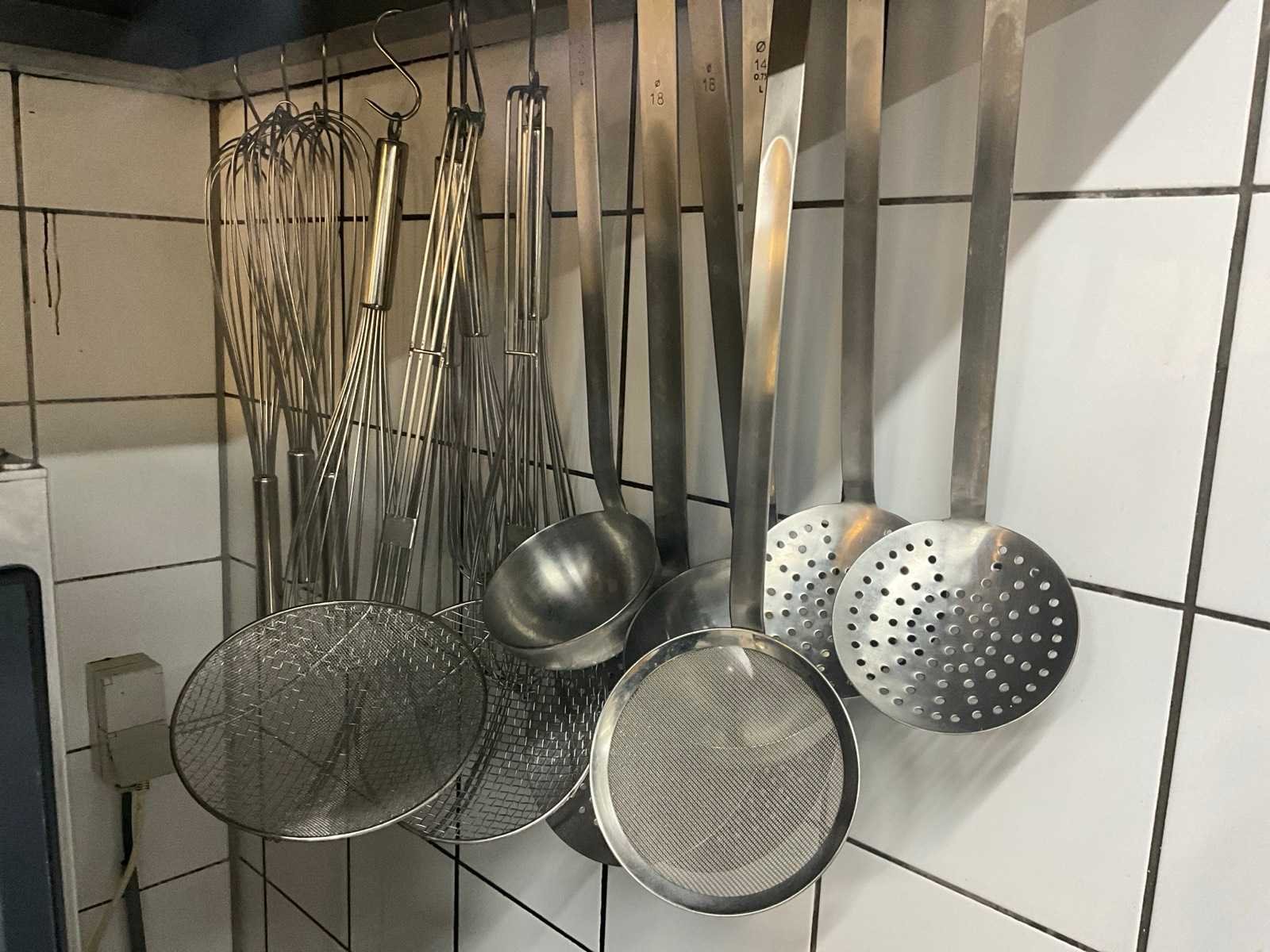 Waaronder 5 diverse keuken messen, 7 Gardes, 6 schuimspanen, 2 pollepels, 1 grote industriële kunststof slazwierder, 7 diverse kunststof snijplanken, 6 zeven en enige diverse mengkommen, Waaronder liggende in 2 metalen opbergrekken voorzien van 6 leggers, Afgifte volgens aanwijzing, uitgezonderd genummerde kavels Nee Product type: Partij