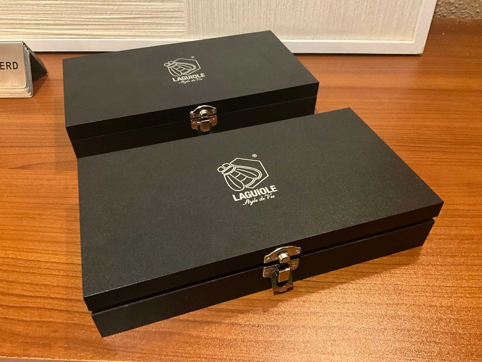 Liggende in 2 houten opbergkoffertjes Nee Merk: Laguiole