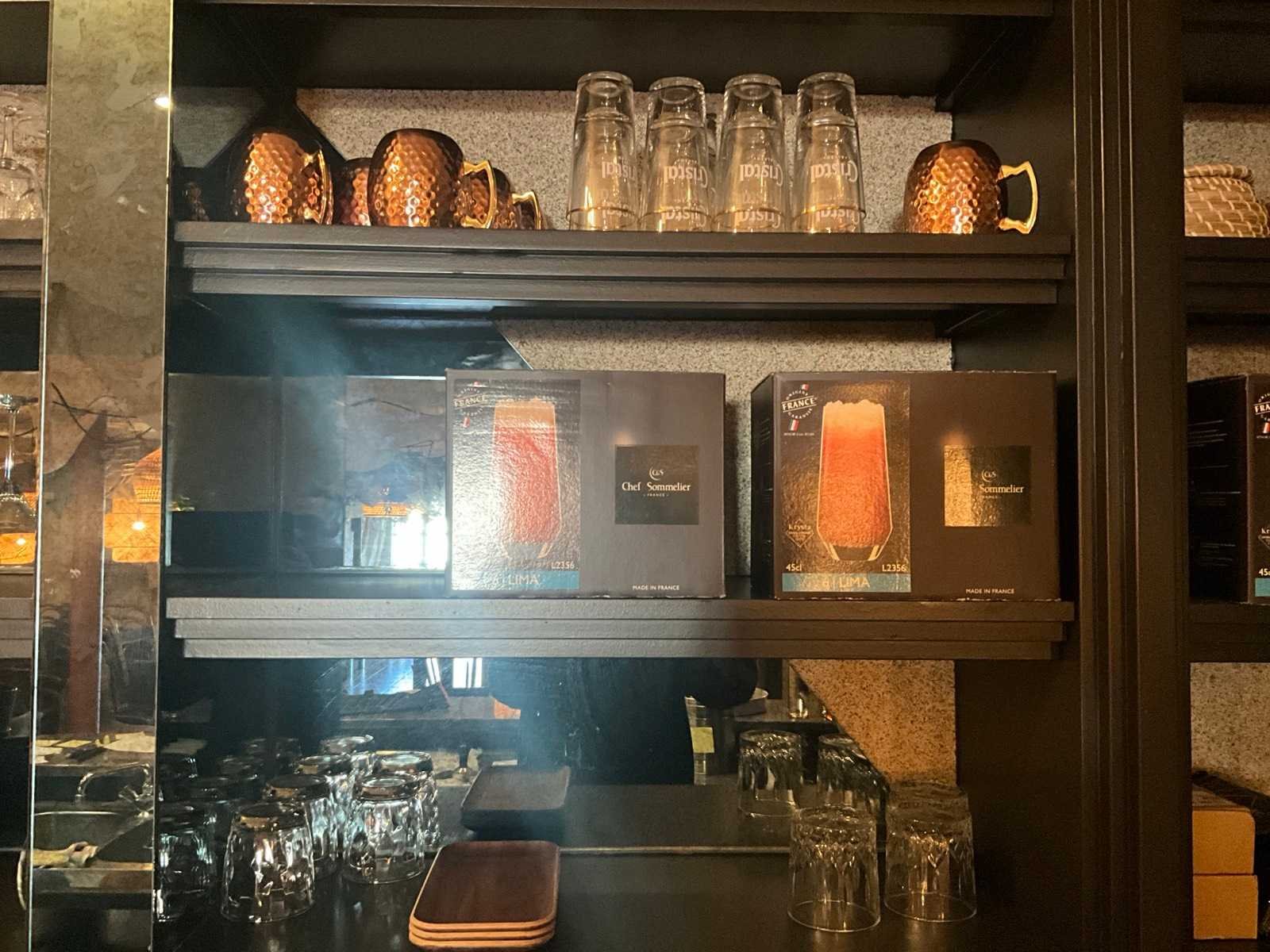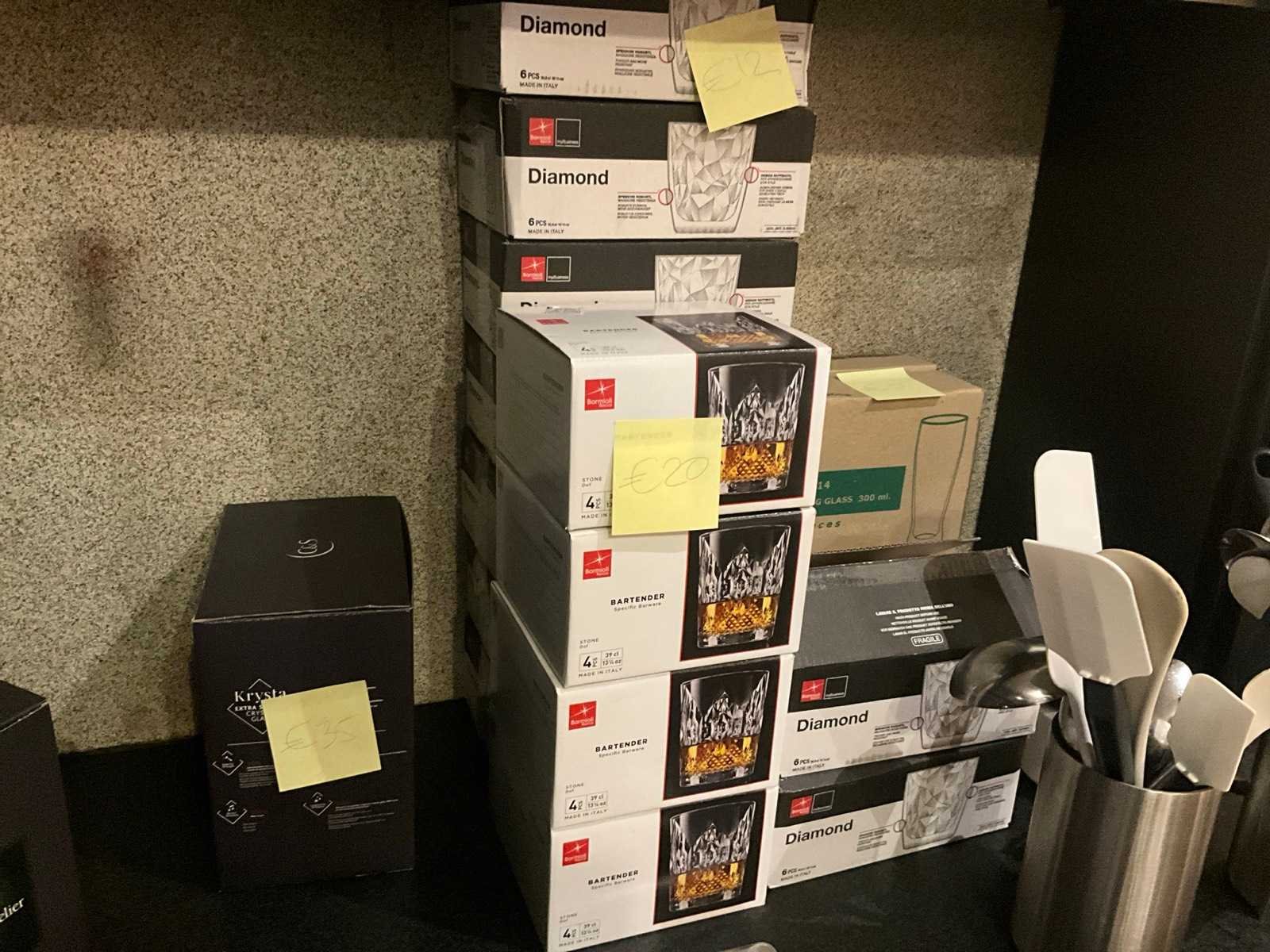 In diverse maten en uitvoeringen, waaronder bierglazen, champagnecoupes, cocktailglazen, waterglazen, degustatieglazen en wijnglazen, Compleet met circa 30 design mokken, 28 houten onderleggers, 2 ijsemmers, 5 diverse bokalen, enige theekannen, Afgifte volgens aanwijzing Nee