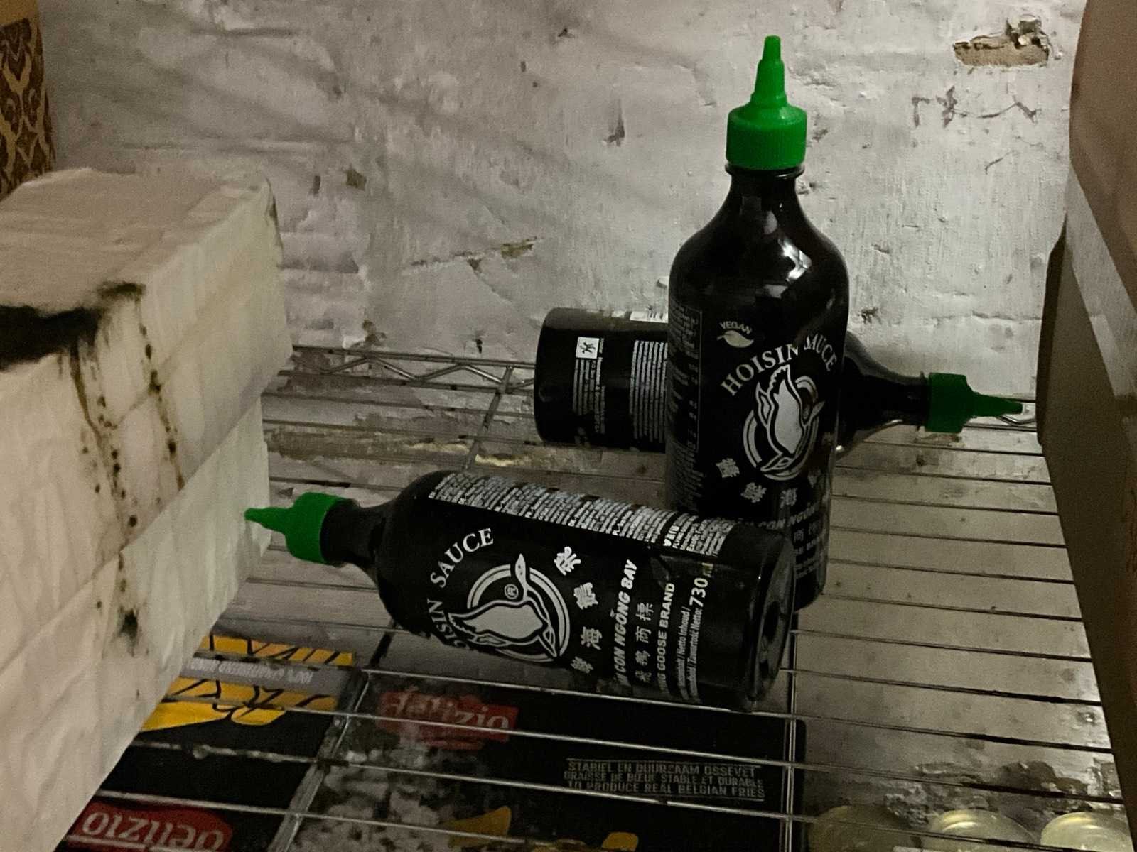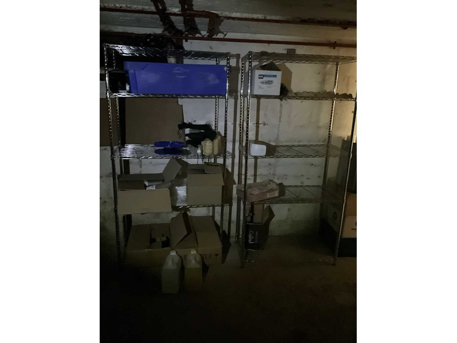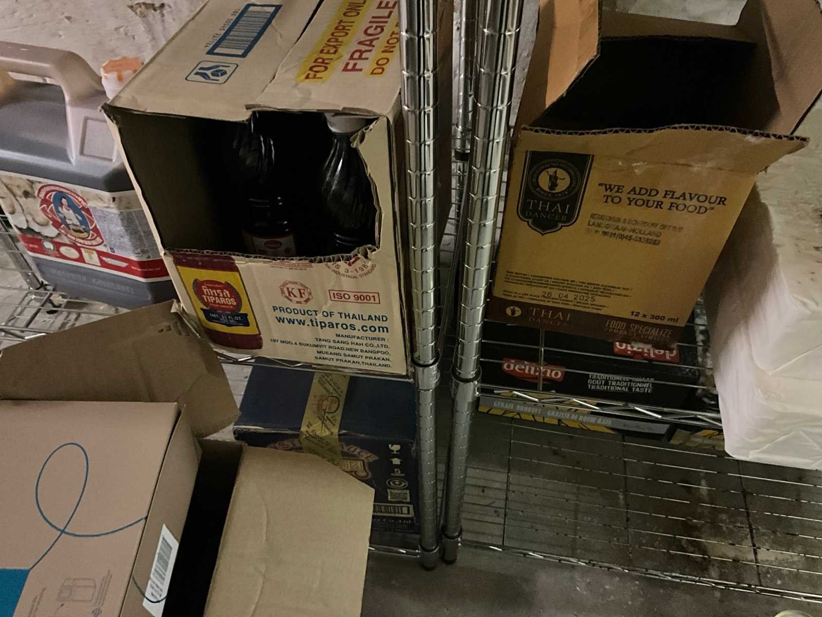 Waaronder inhoudende enige diverse sauzen, keukenpapier, afvalzakken, 1 grote marmiet en voorraad papieren servietten Duni, Waaronder liggende in 4 metalen opbergrekken, Afgifte volgens aanwijzing, Uitgezonderd genummerde kavels en eigendomsvoorbehoud Nee